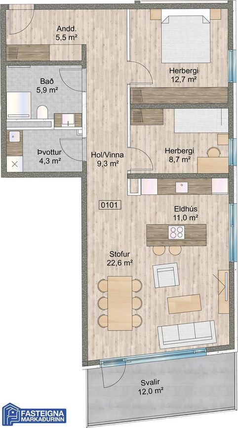 3ja herbergja íbúð á 1. hæð í 4 hæða nýbyggingu með lyftu. Skiptist í forstofa, hol, hjónaherbergi með fataskáp, barnaherbergi með fataskáp, baðherbergi, þvottaherbergi, eldhús með eyju, stofu og borðstofu. Allar innréttingar sérsmíðaðar. Íbúðin skilast með flísum í votrýmum, annars án gólfefna. Gólfhiti í öllum herbergjum.
