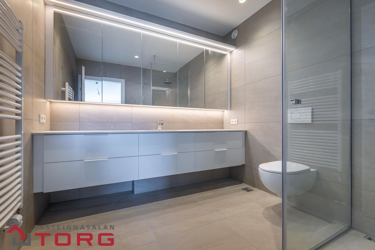 Nýtt fjölbýlishús með lyftu, opnu stofu- og eldhúsrými, verönd, svalir og sérgeymslu í kjallara. Góð einangrun og nútímalegur raftækibúnaður.