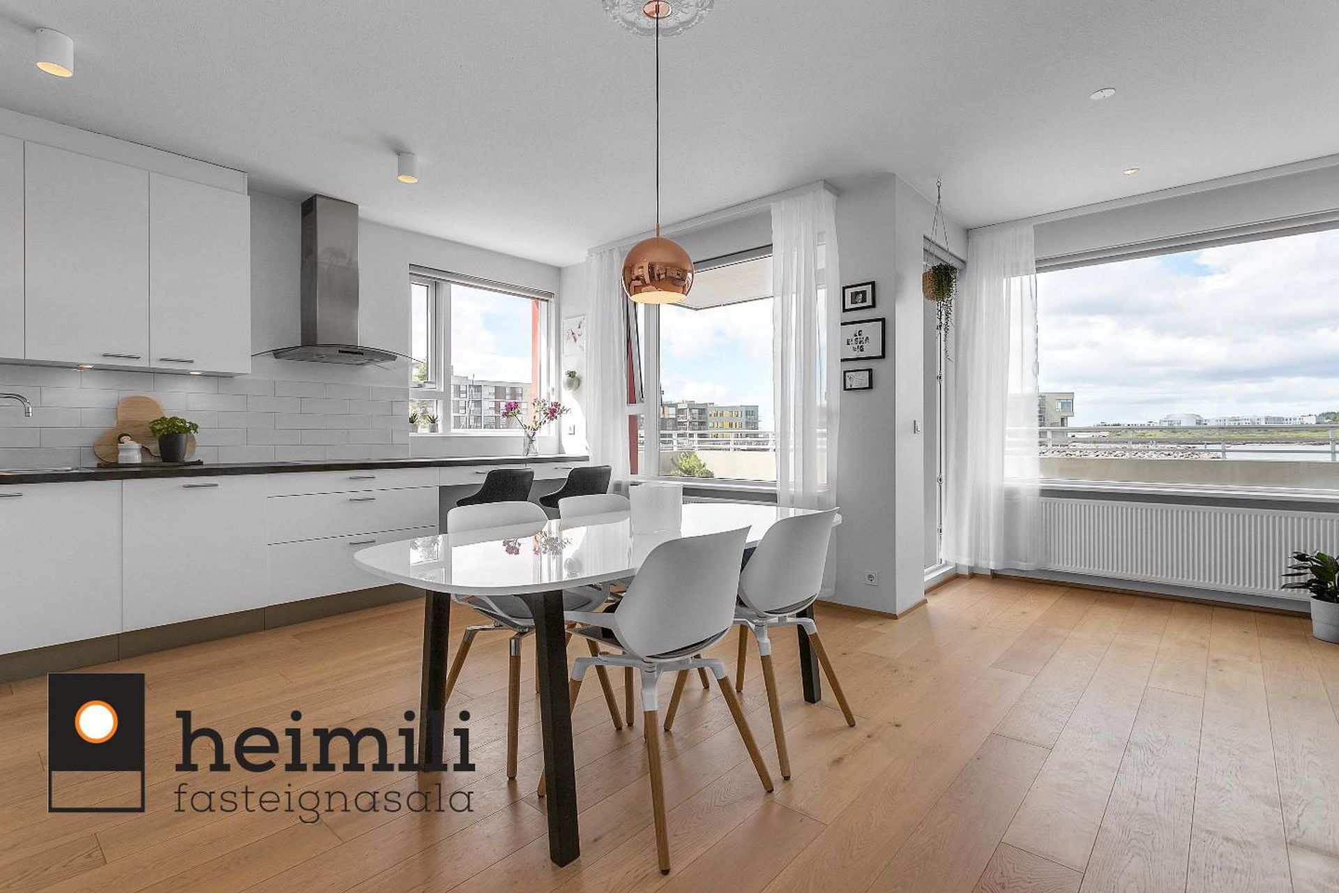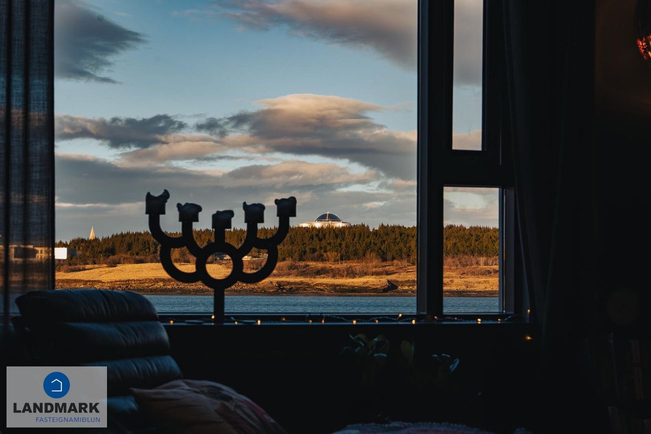 Alrými: Stofan og borðstofan mynda opið og bjart rými með stórum gluggum sem hleypa góðri birtu inn, hátt til lofts, gegnheilt viðarparket á gólfi. Útgengt er á rúmgóðar svalir með stórfenglegu útsýni yfir smábátahöfnina, Fossvoginn, Öskjuhlíðina, að Perlunni og víðar.