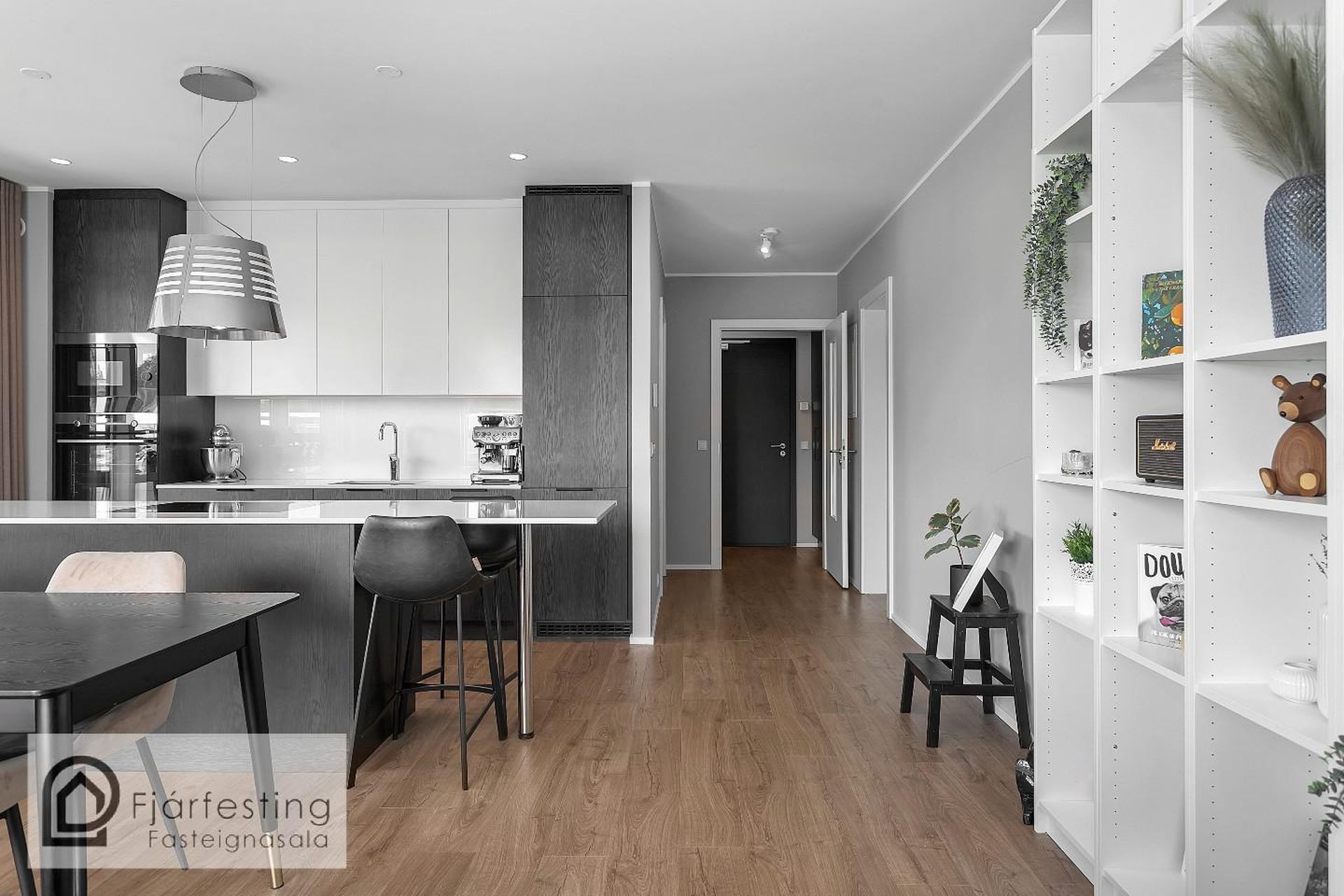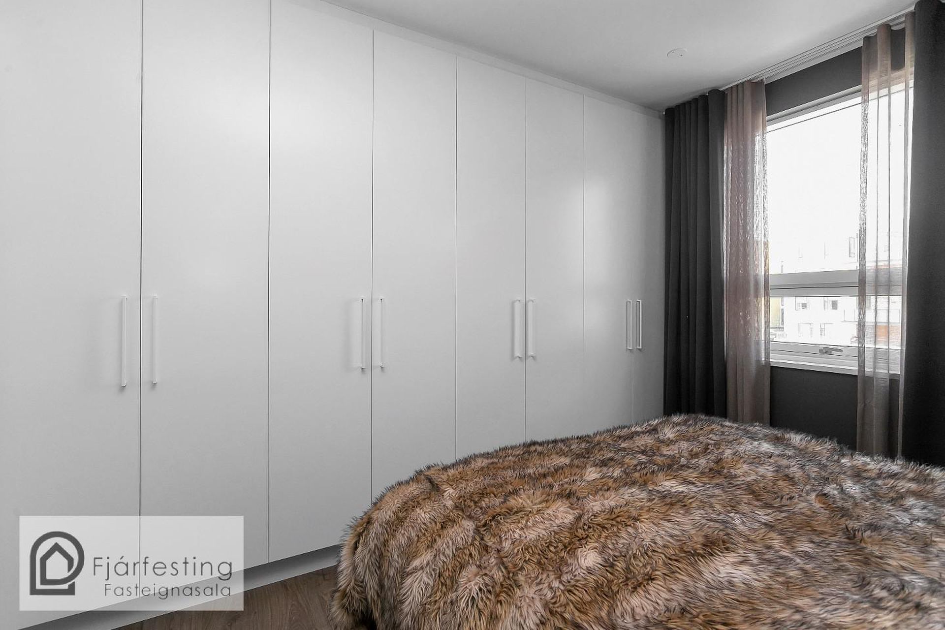 Nánari Lýsing: komið er inn í forstofu með parketi á gólfi og góðum fataskáp. Svefnherbergi, parketlagt með góðu skápaplássi. Eldhús er með glæsilegri innréttingu (hvít og bæsuð eik), eldunareyju, vönduð tæki frá AEG, innbyggður ísskápur, uppþvottavél og parketi á gólfi.