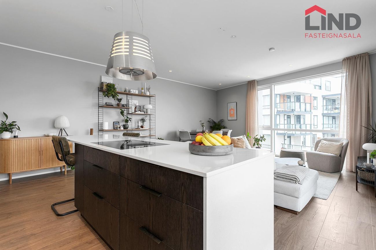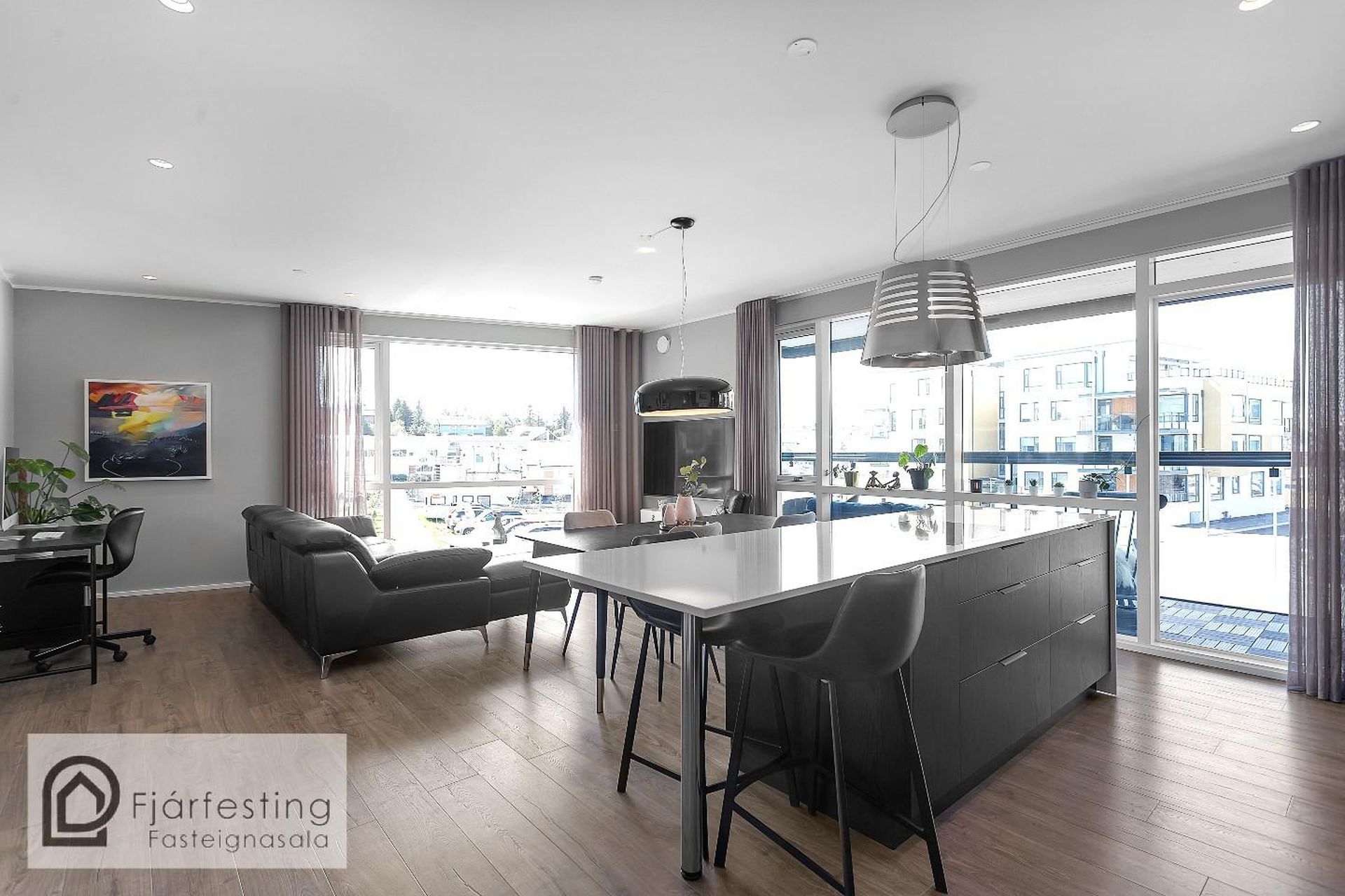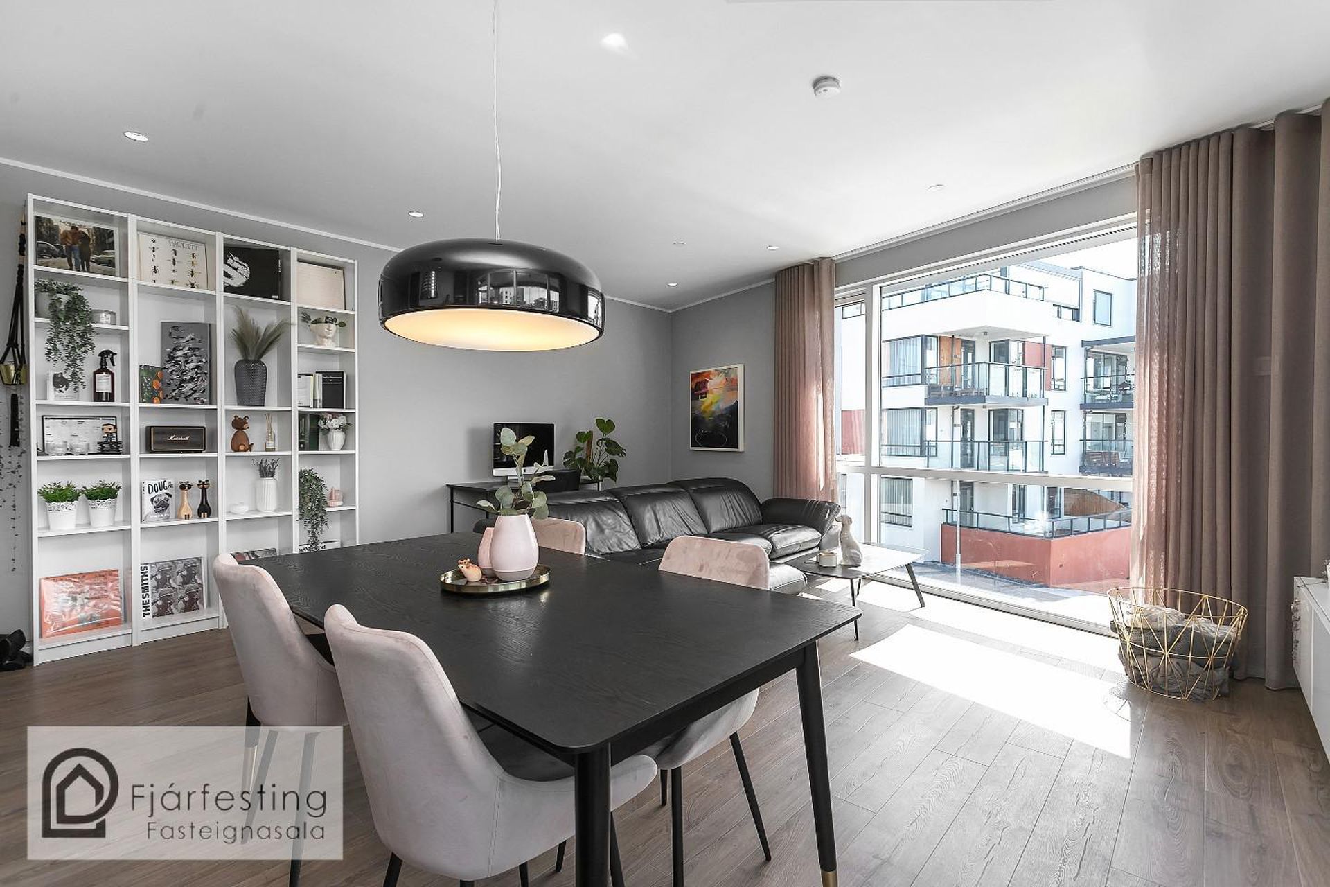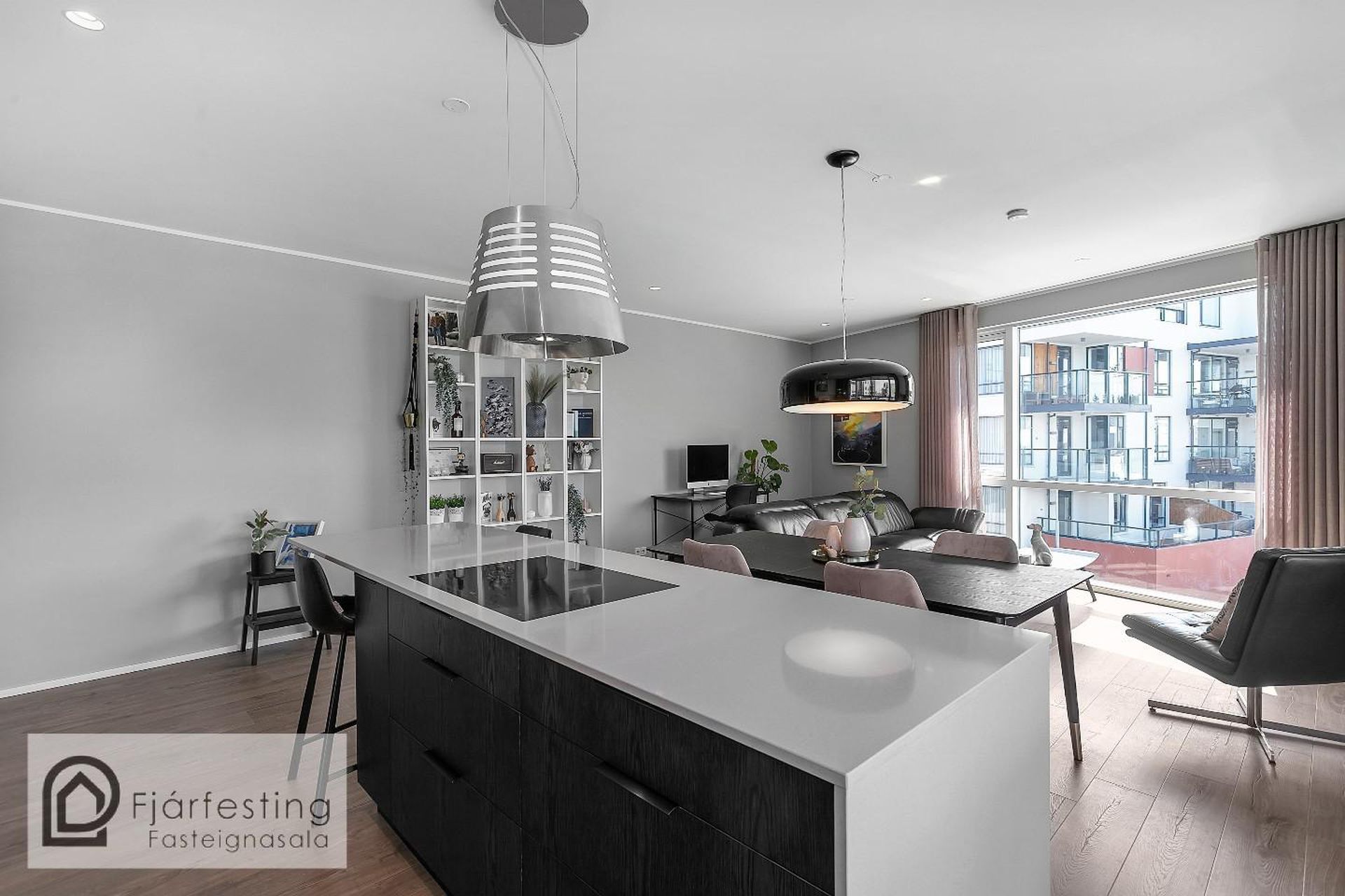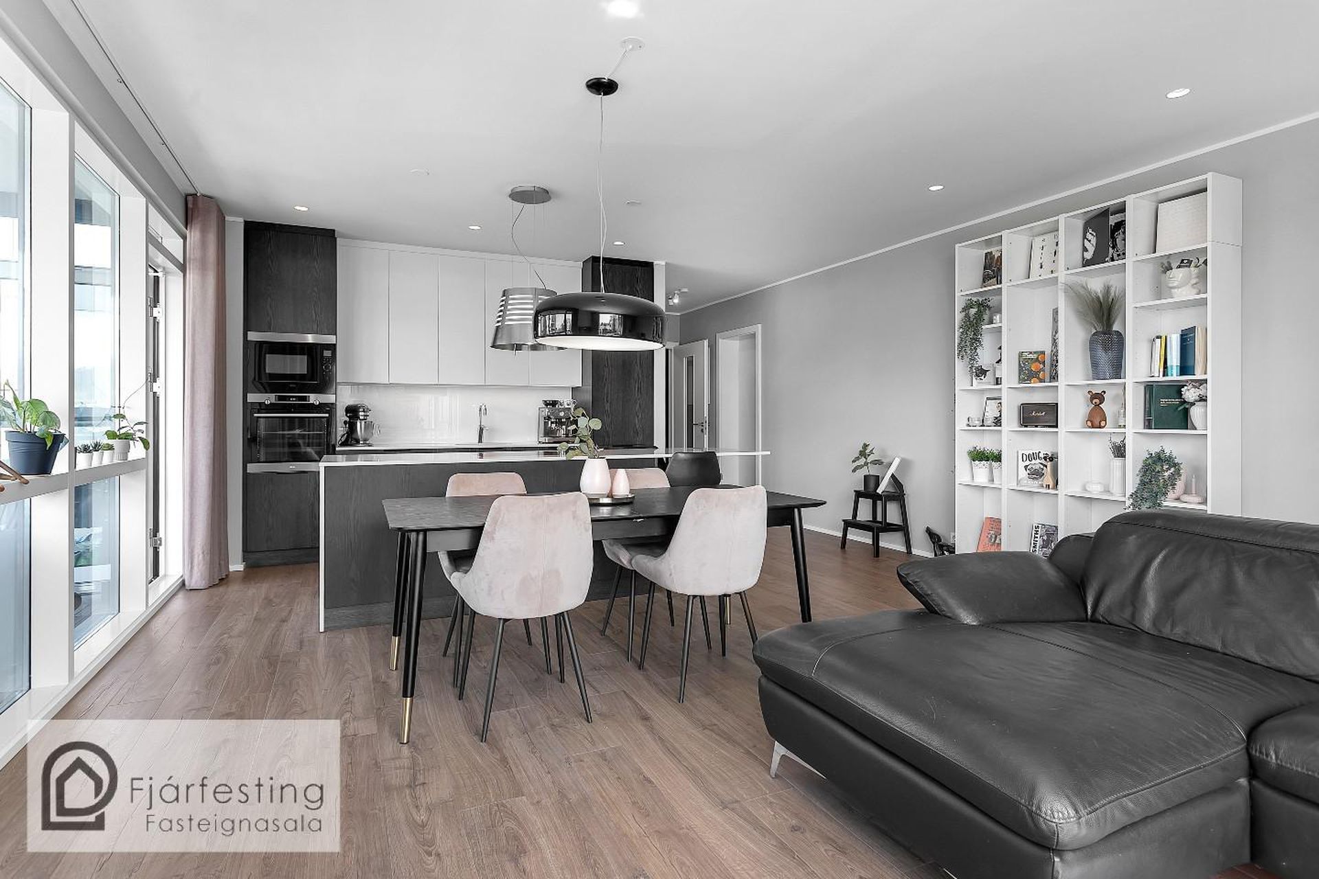 Eldhús og stofa eru í opnu og björtu samliggjandi rými, gólfsíðir gluggar, parket á gólfi og útgengi út á rúmgóðar svalir með svalalokun.