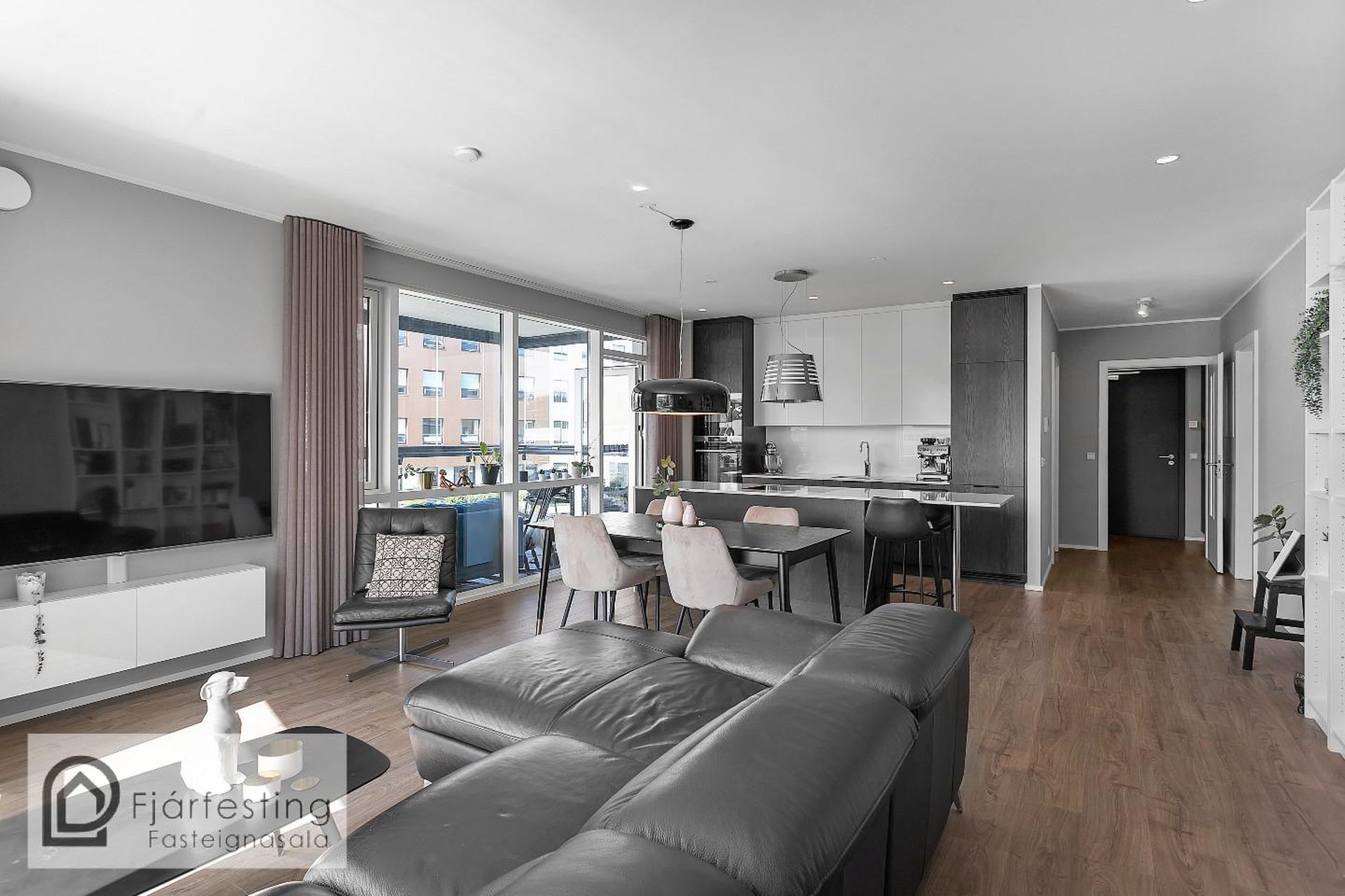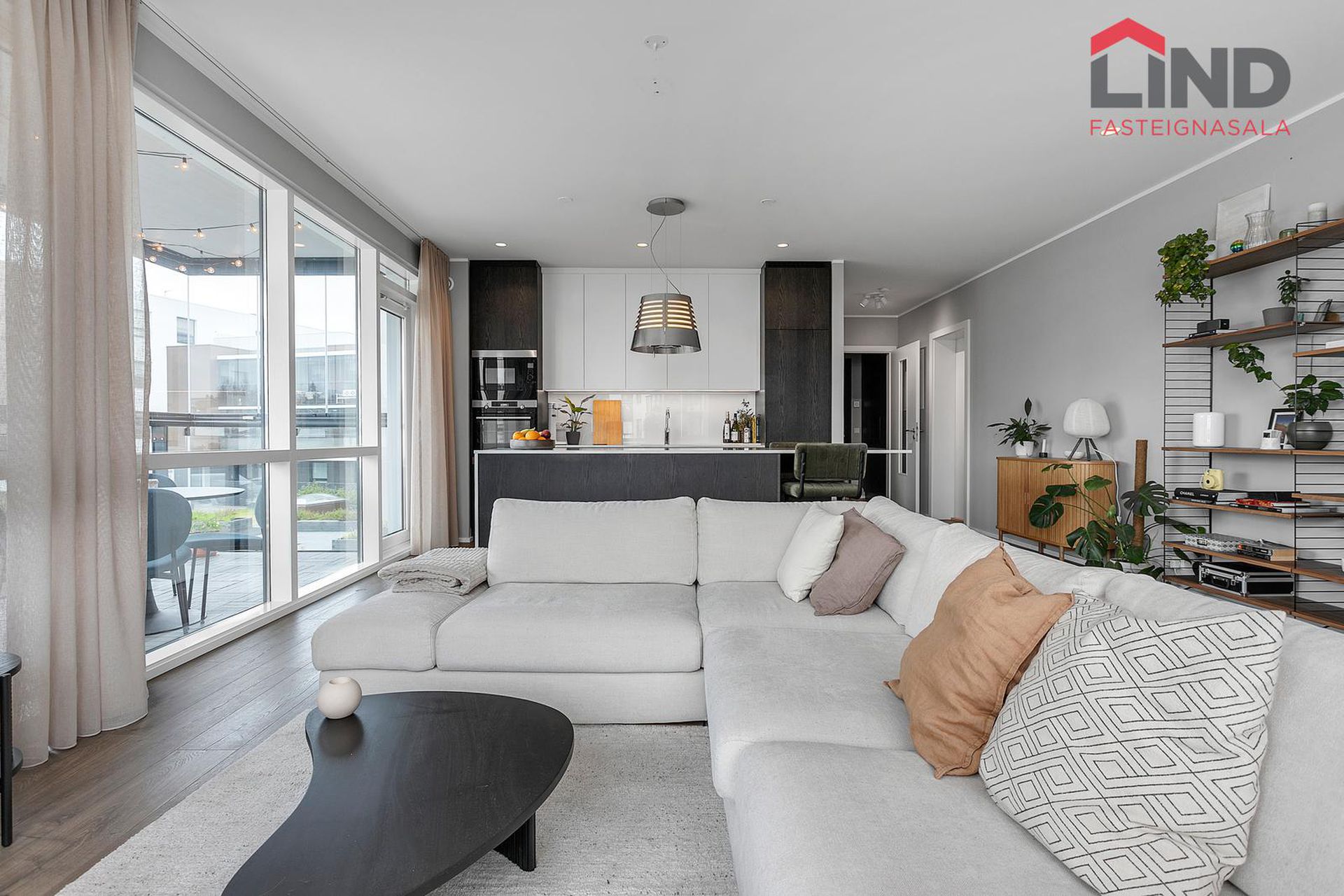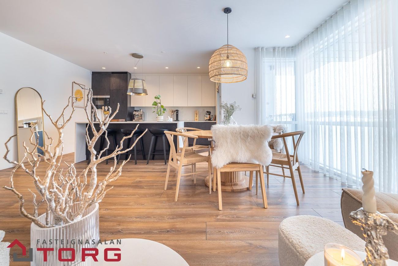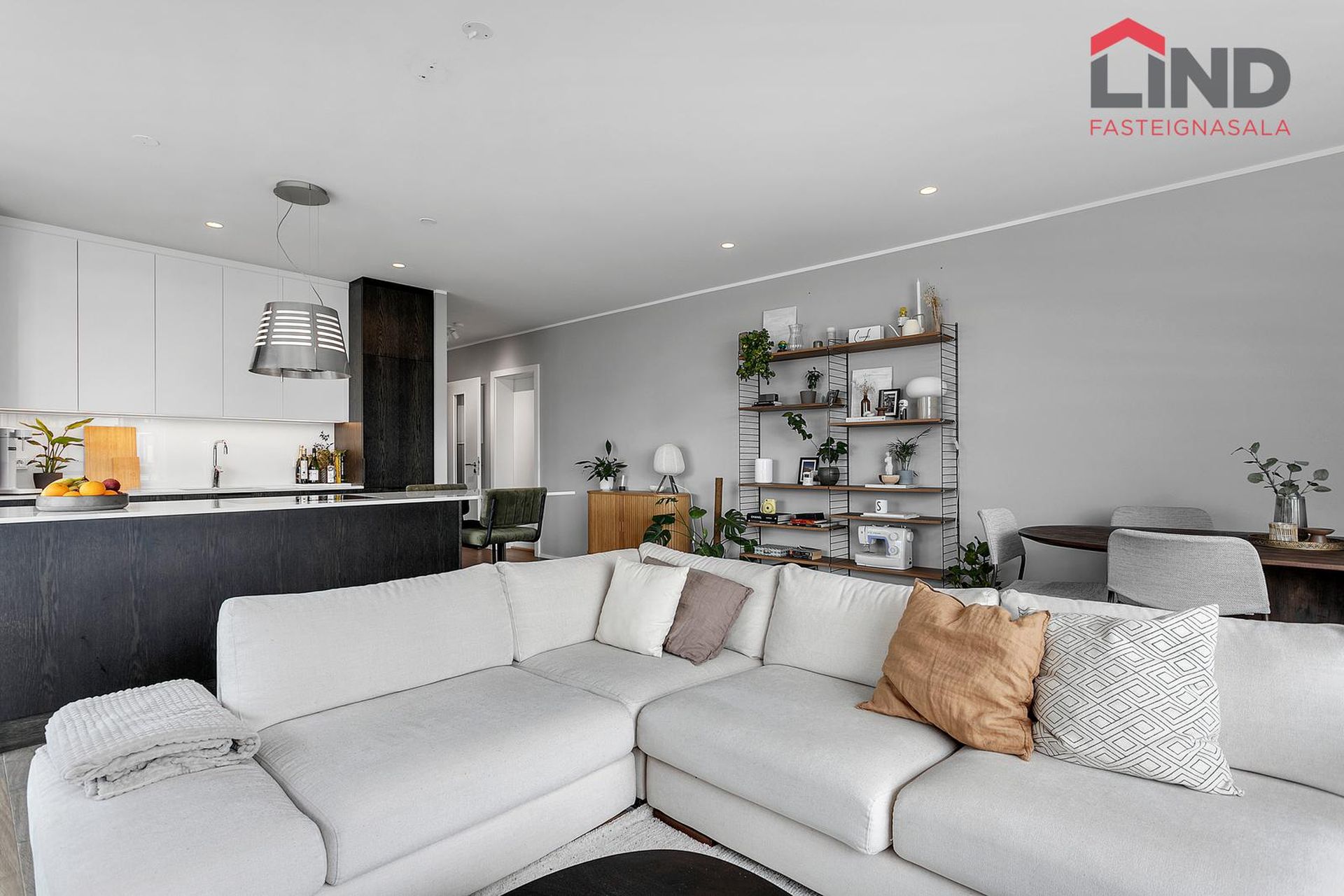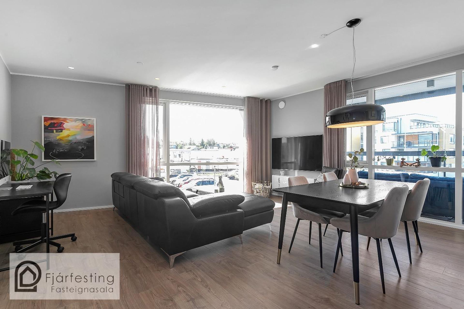 Eldhús og stofa eru í opnu og björtu samliggjandi rými, gólfsíðir gluggar, parket á gólfi og útgengi út á rúmgóðar svalir með svalalokun.