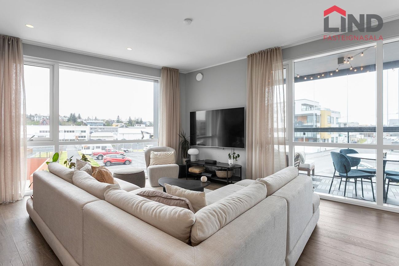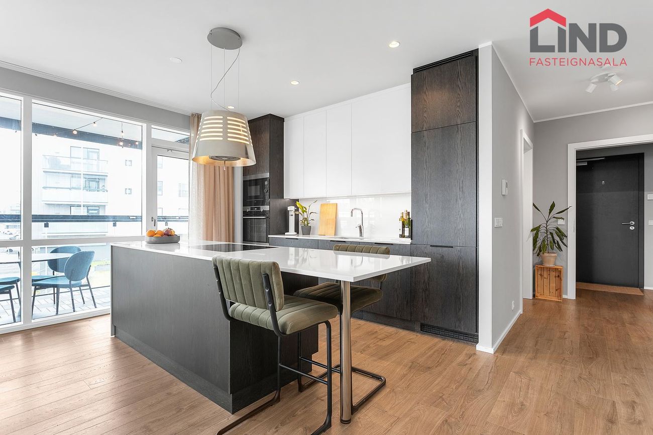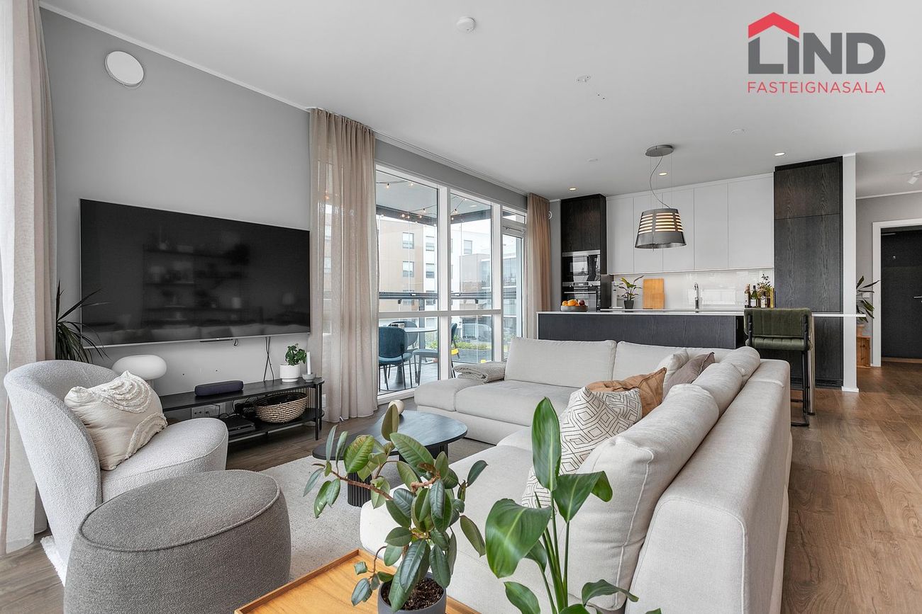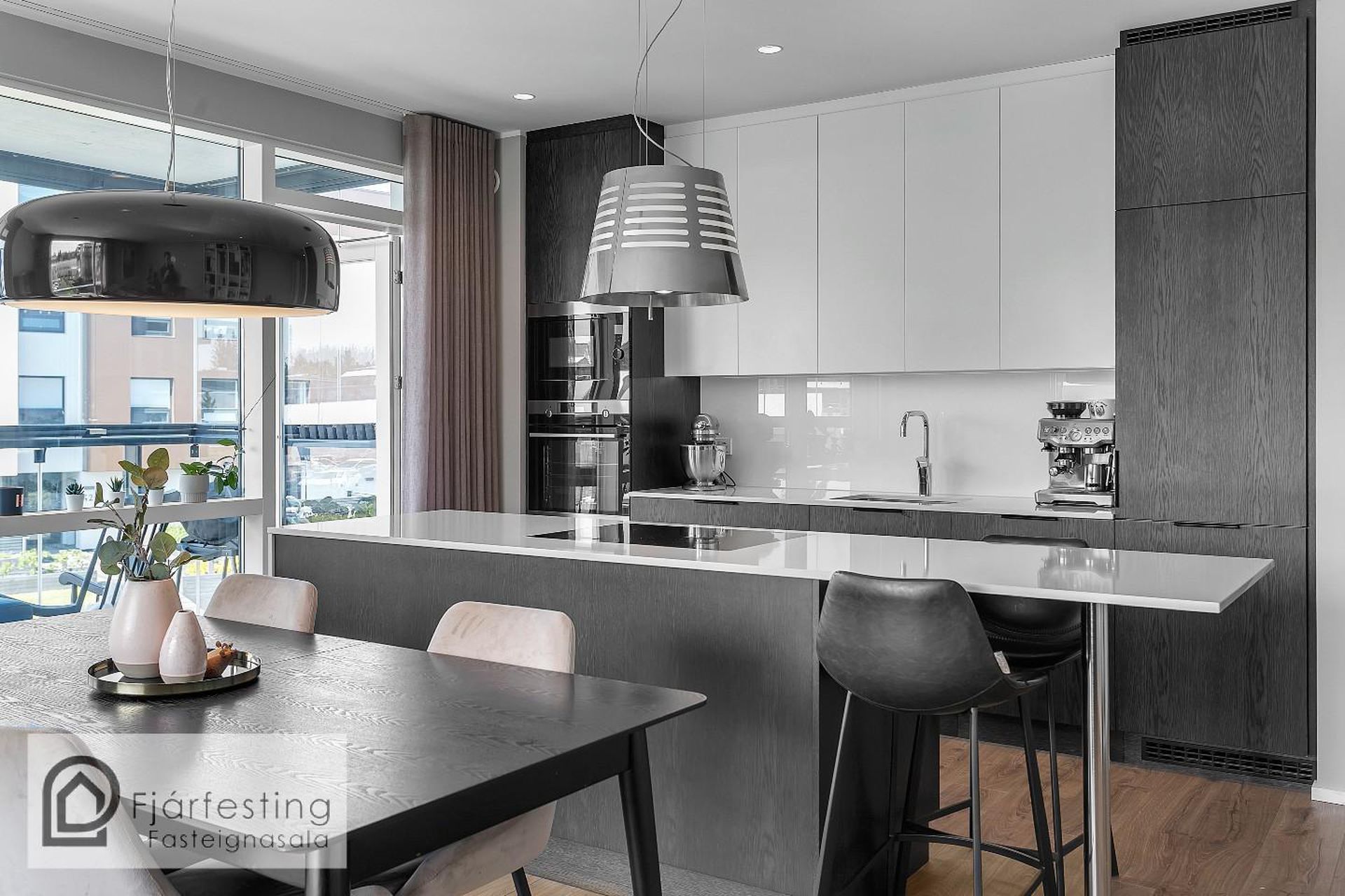 Eldhús og stofa eru í opnu og björtu samliggjandi rými, gólfsíðir gluggar, parket á gólfi og útgengi út á rúmgóðar svalir með svalalokun.