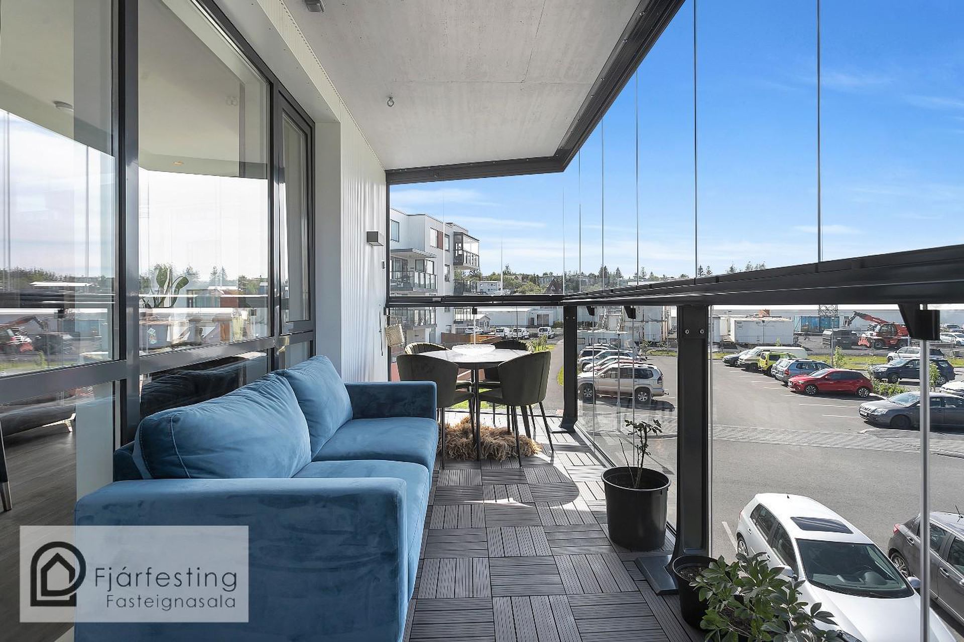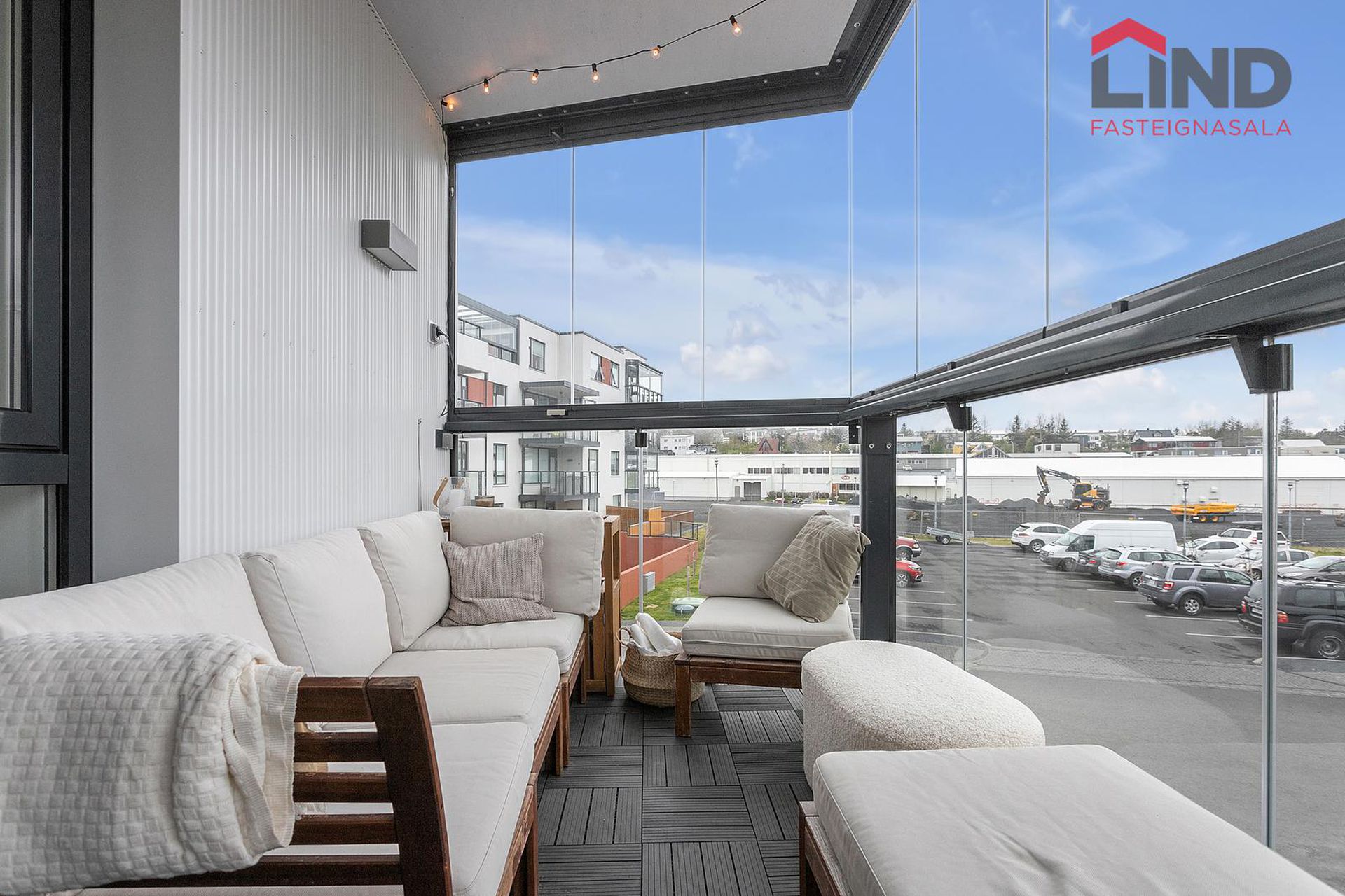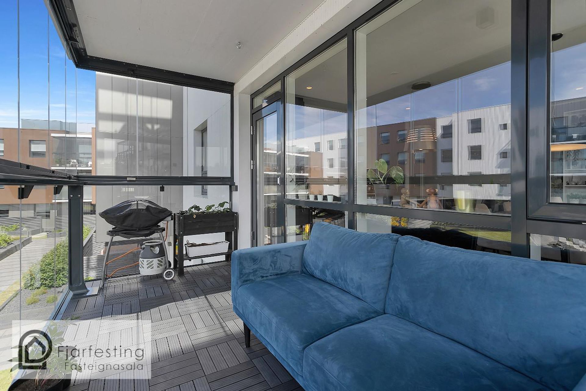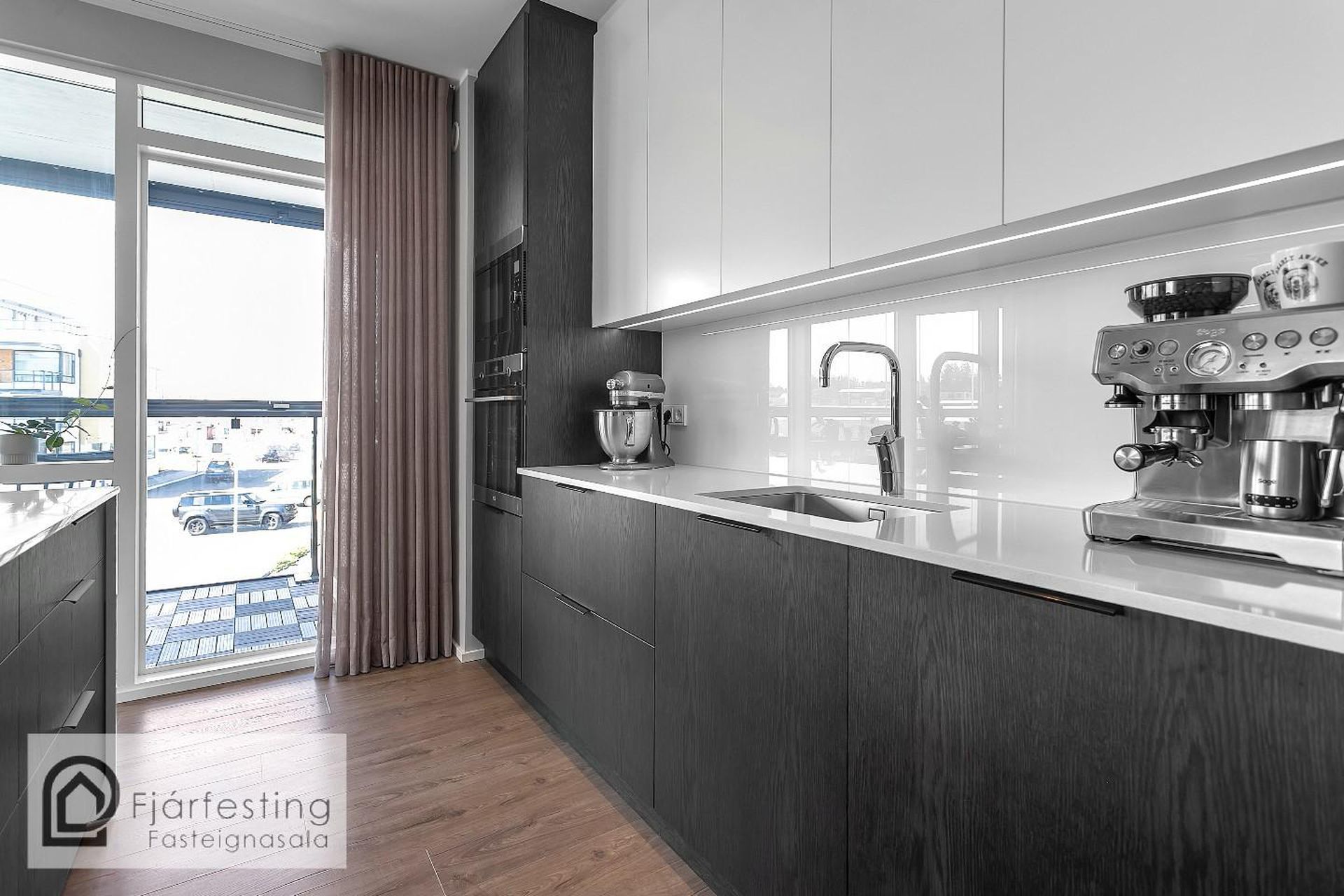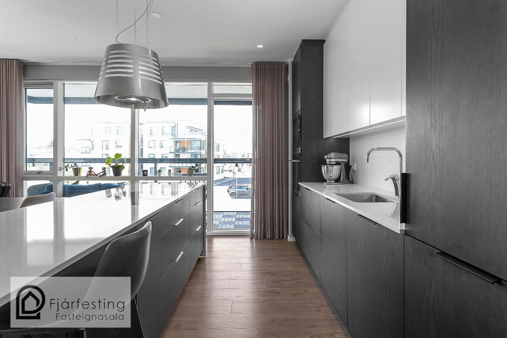 Eldhús og stofa eru í opnu og björtu samliggjandi rými, gólfsíðir gluggar, parket á gólfi og útgengi út á rúmgóðar svalir með svalalokun.