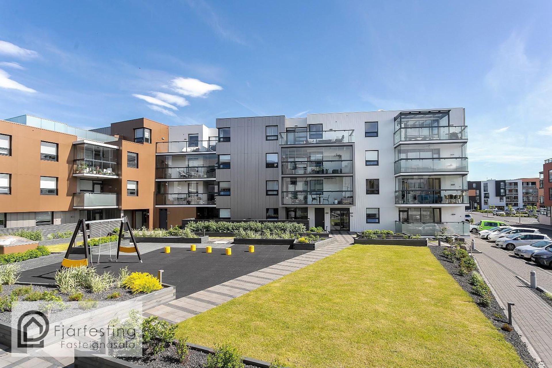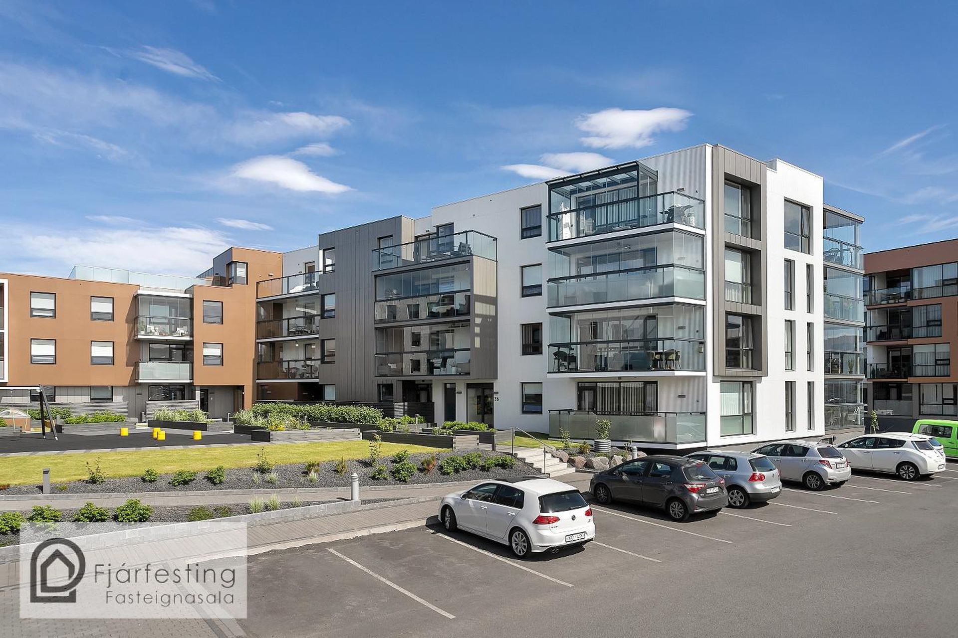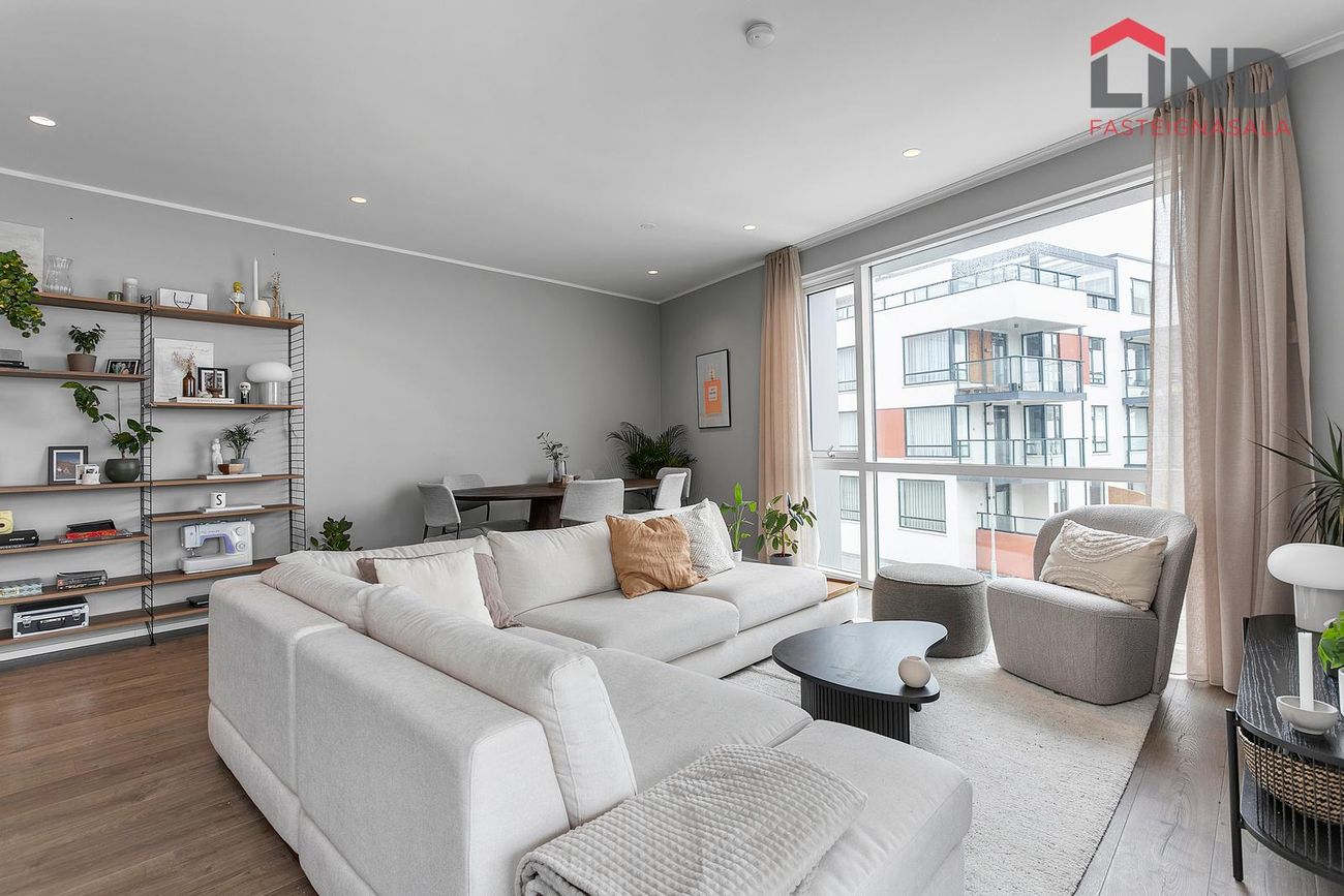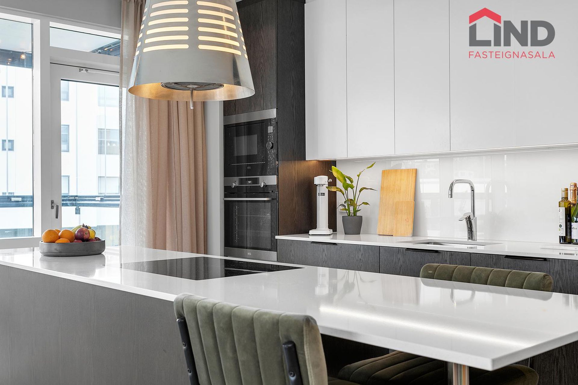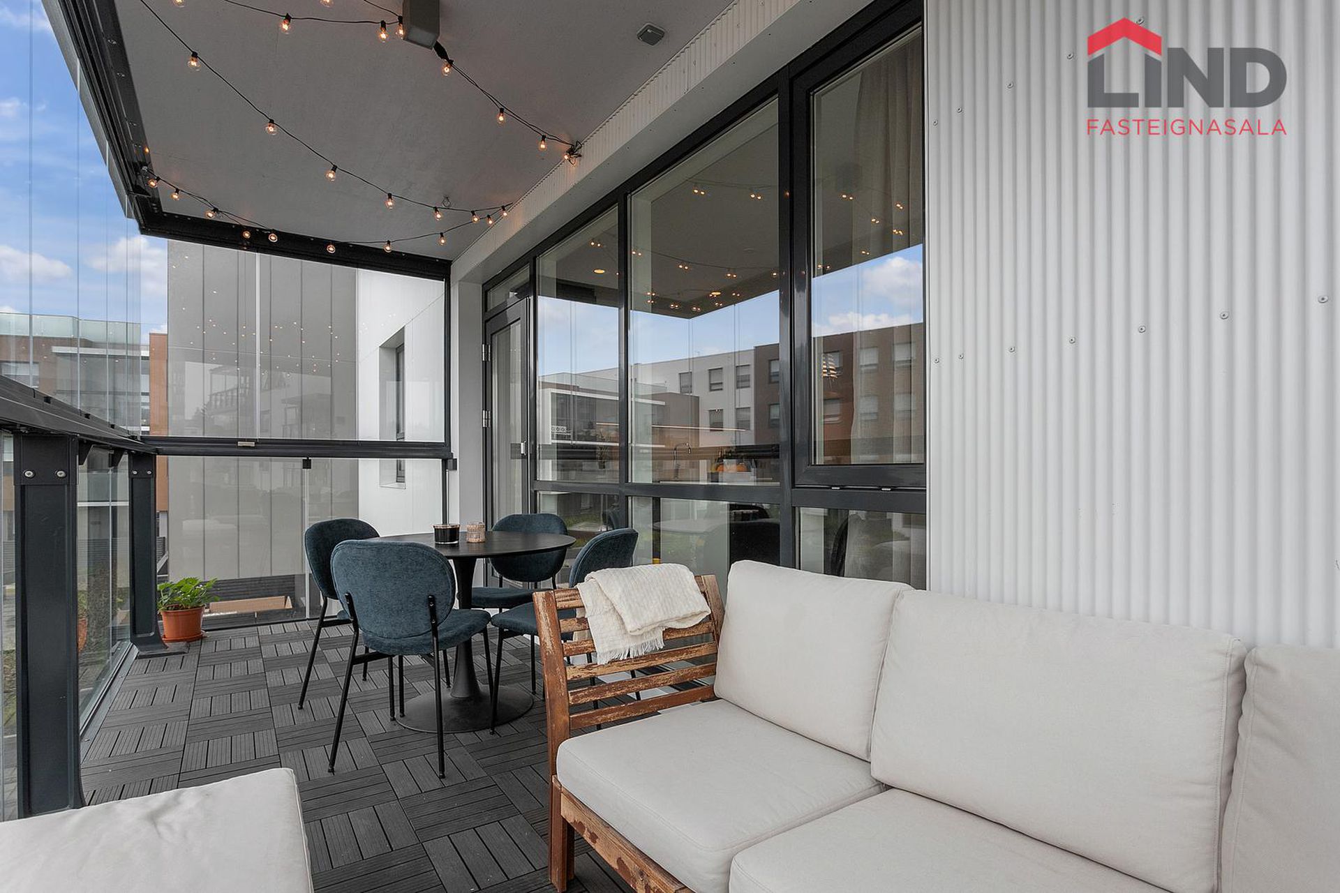 Eldhús og stofa eru í opnu og björtu samliggjandi rými, gólfsíðir gluggar, parket á gólfi og útgengi út á rúmgóðar svalir með svalalokun.