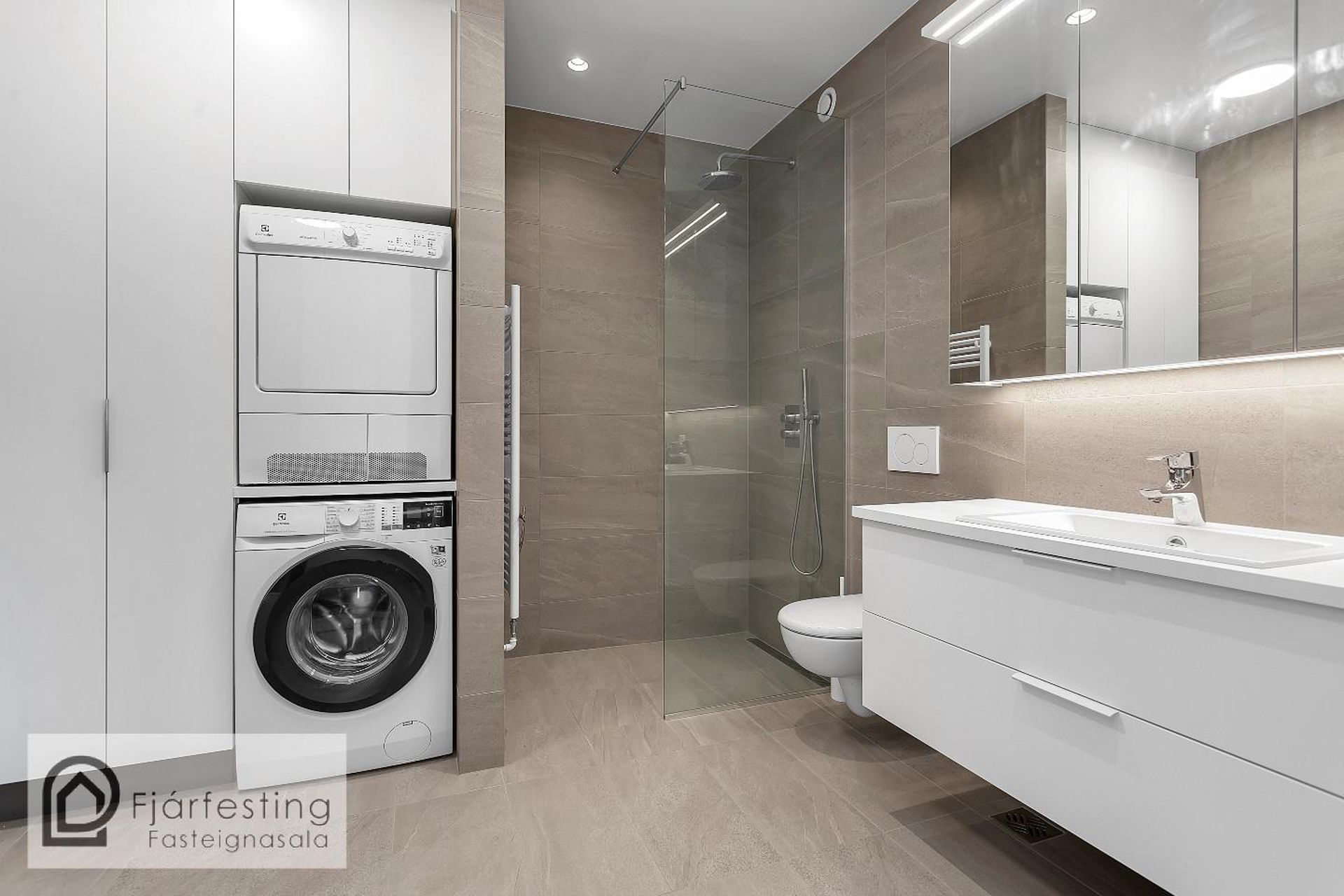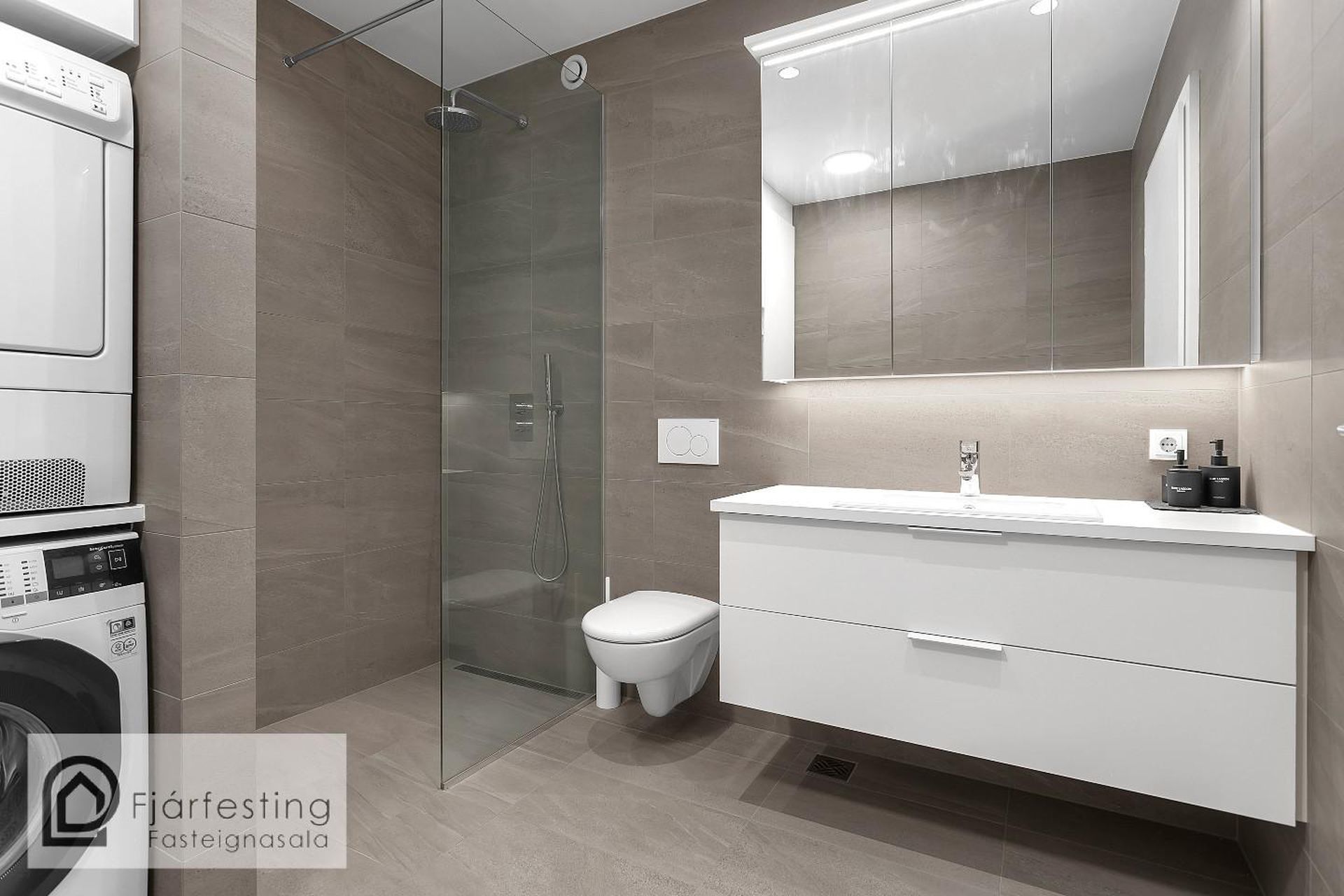 Baðherbergi er með flísum á gólfi og veggjum, sturta er með glerlokun, innbyggð blöndunartæki frá Tengi og falleg innrétting frá Brúnás.