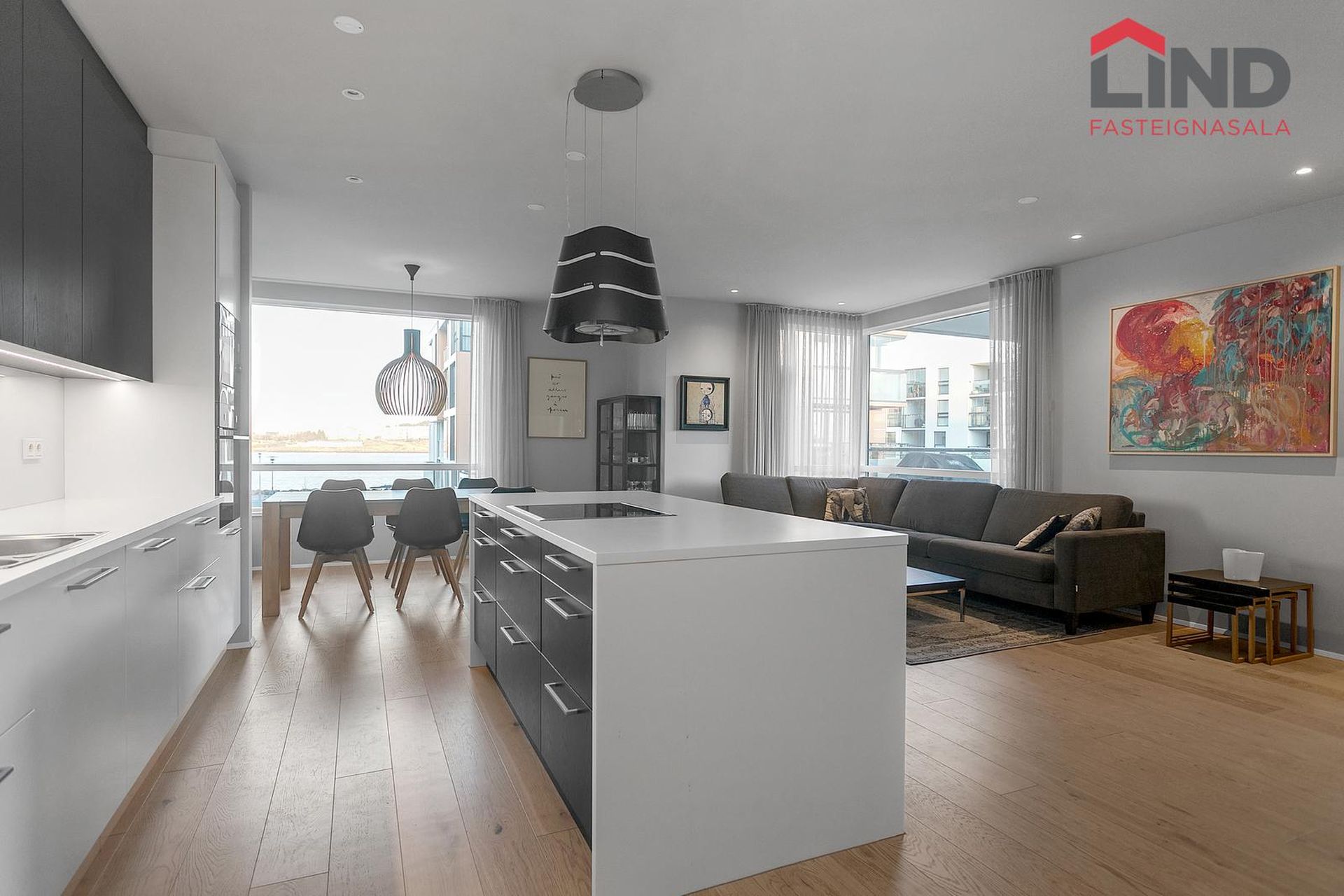 Íbúðin skiptist í, forstofu, hol, hjónaherbergi með fataherbergi, tvö svefnherbergi, baðherbergi, þvottaherbergi, eldhús með eyju, stofu og borðstofu. Allar innréttingar er sérsmíðar af Brúnás, sýnilegar hliðar og hurðir eru sprautulakkaðar, hvítar og svartbæsaður eikarspónn er í eldhúsi. Eldhústækin eru frá AEG og blöndunartæki frá Tengi. Fallegt og vandað parket er á gólfi og flísar á blautrými. Um er að ræða vel skipulagða, rúmgóða og vandaða íbúð með stórum svölum til austurs við sjávarsíðuna á Kársnesinu í Kópavoginum. Fáðu
