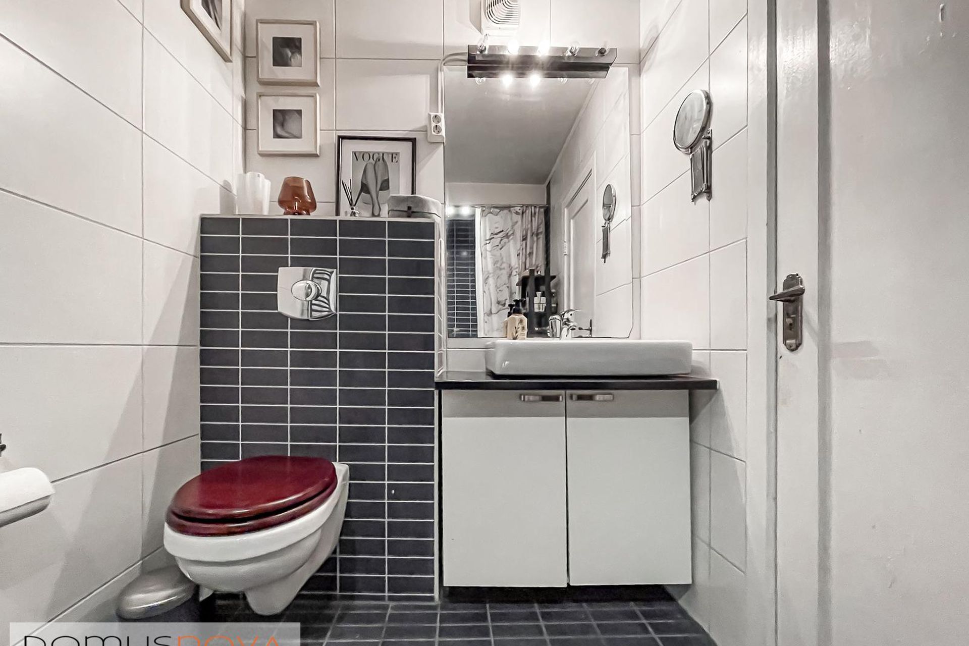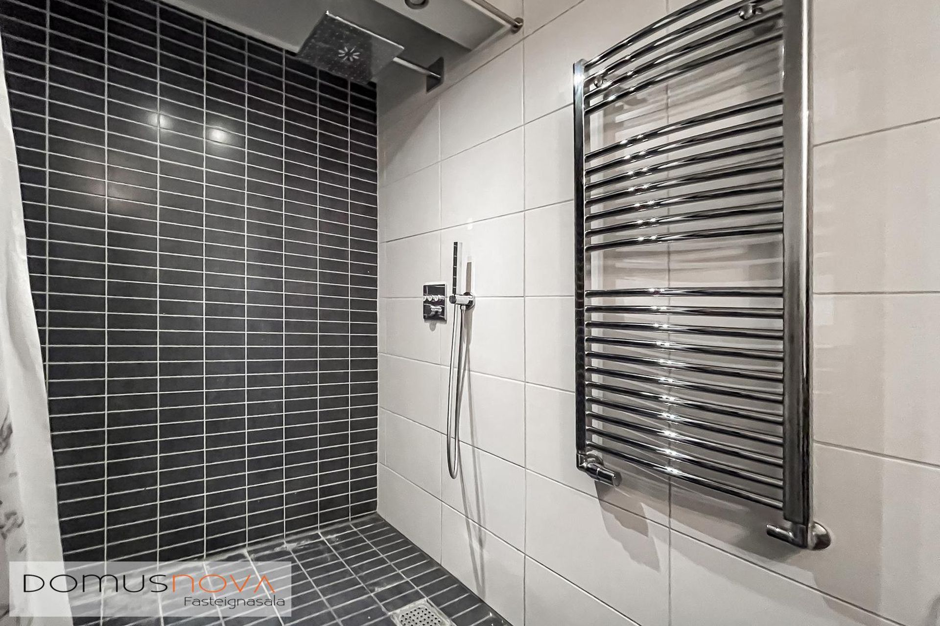 Baðherbergi er við forstofu, dúklagt með flísum á veggjum, upphengd innrétting með handlaug og sturta.