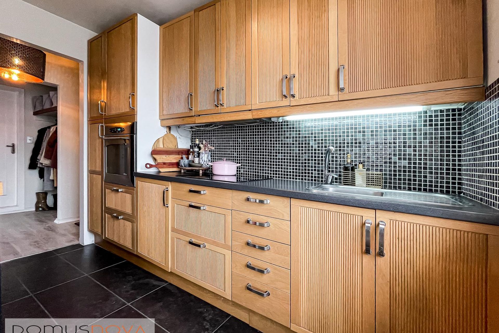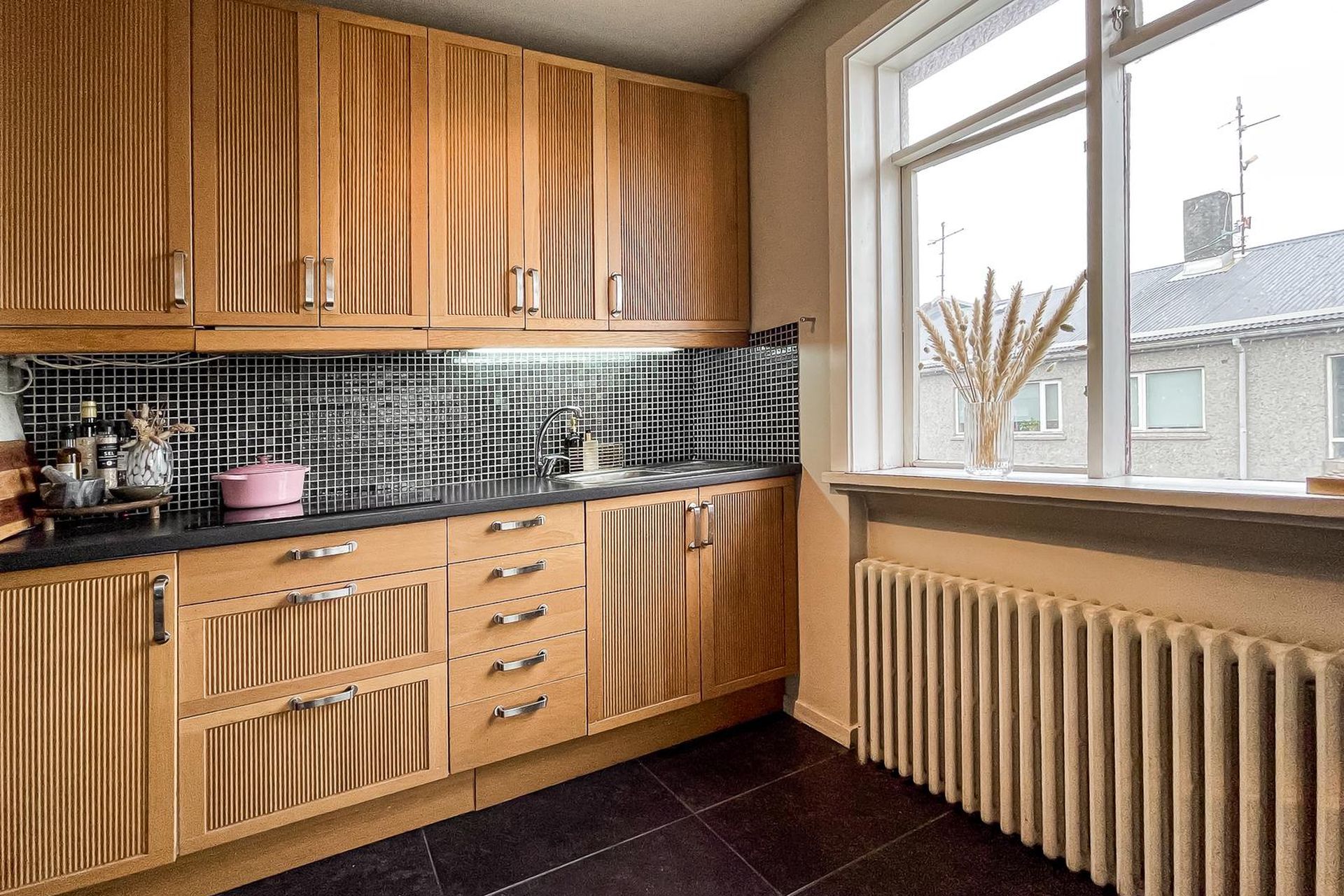 Eldhús með ágætri innréttingu, flísar á milli efri og neðri skápa. Frá eldhúsi er útgengt á svalir og þaðan liggja tröppur í bakgarð hússins sem snýr í suð-vestur.