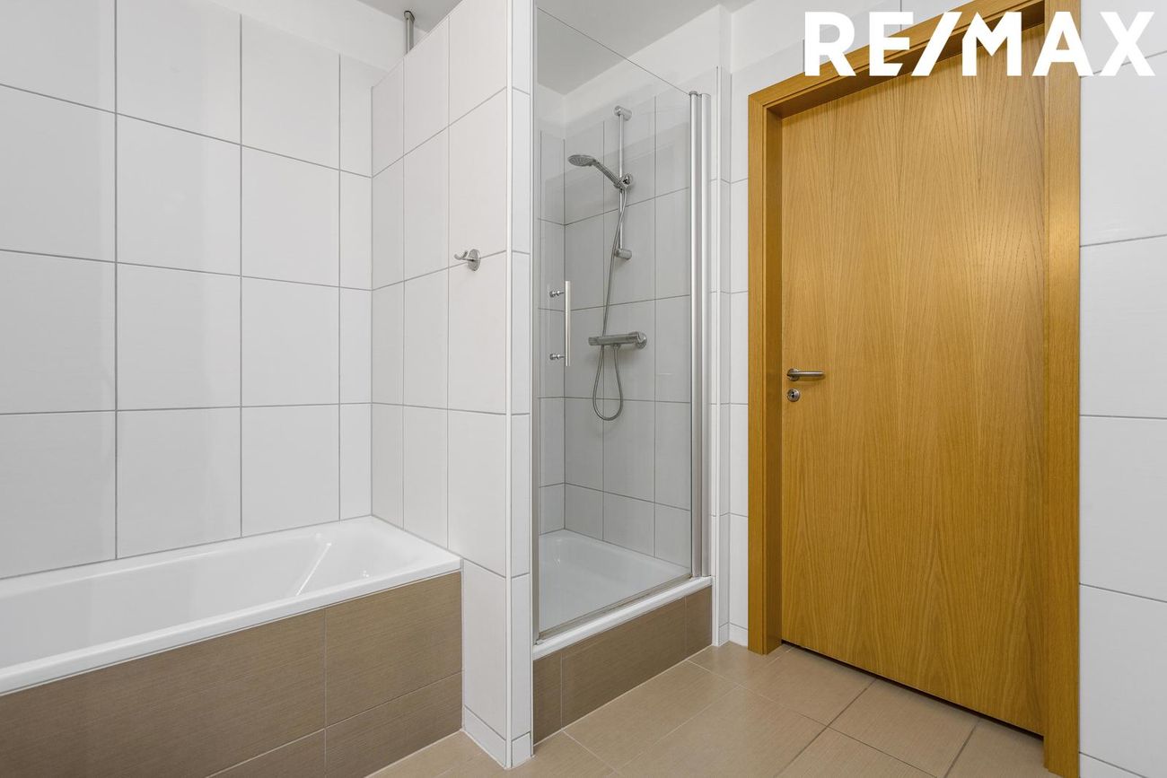 Baðherbergið er með flísum í hólf og gólf. Baðkar og sturtuklefi.
