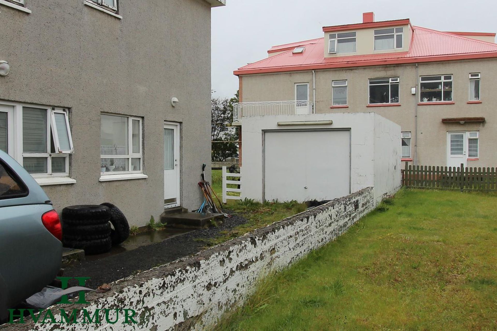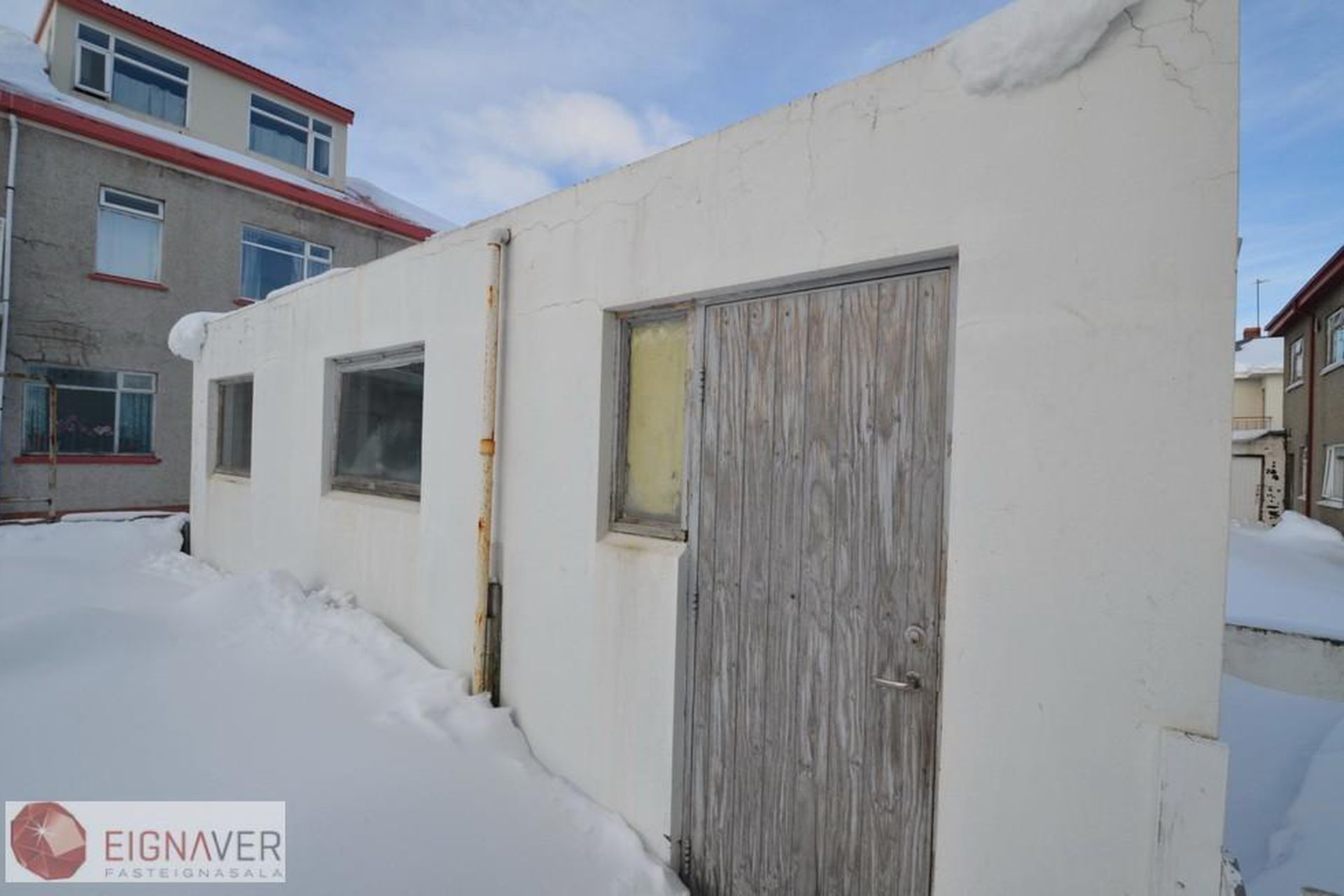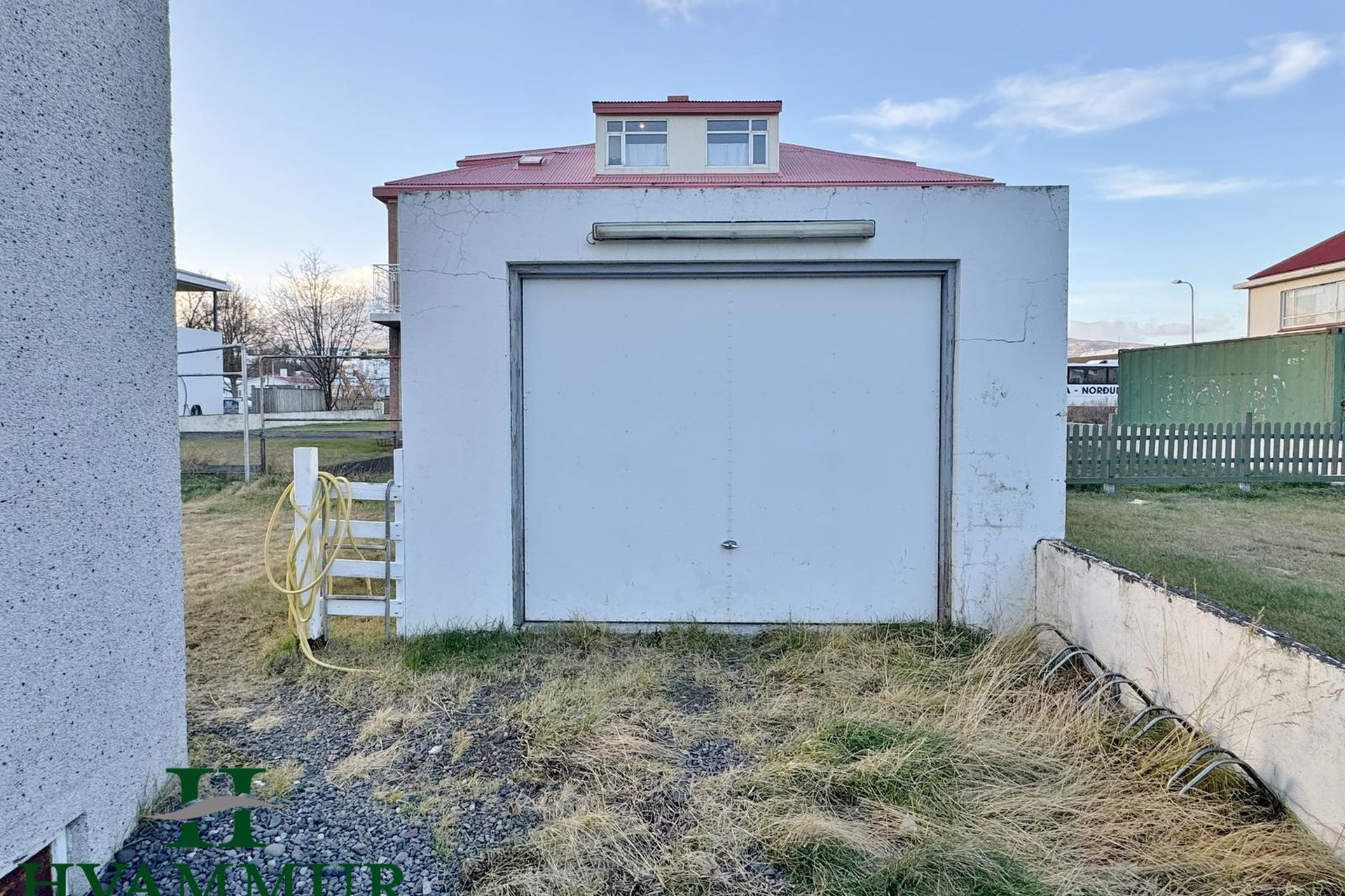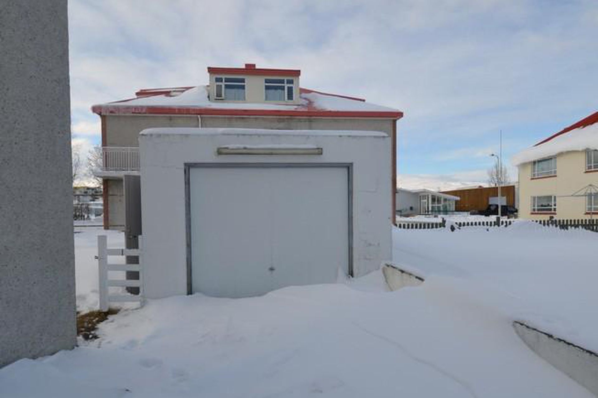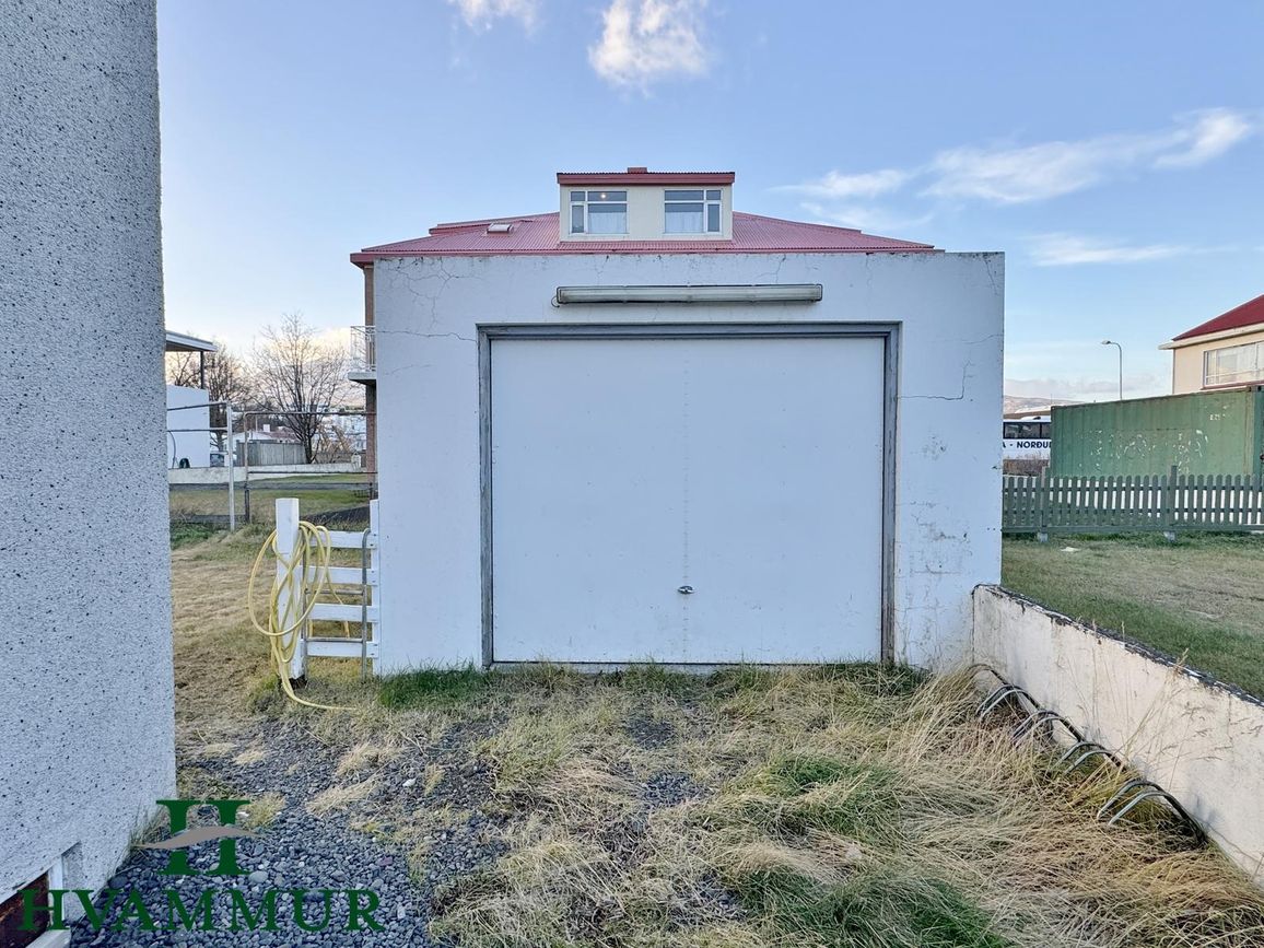 Bílskúr er skráður 25,2 m² að stærð, stakstæður og stendur á norð-vesturhluta lóðarinnar. Þar er aðeins kalt rennandi vatn. Framan við hann er stórt malborið bílaplan sem tilheyrir íbúðinni.
