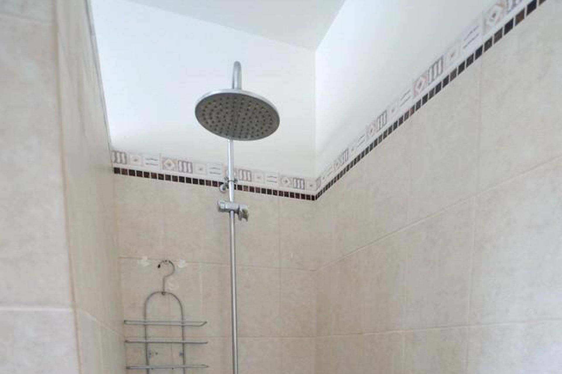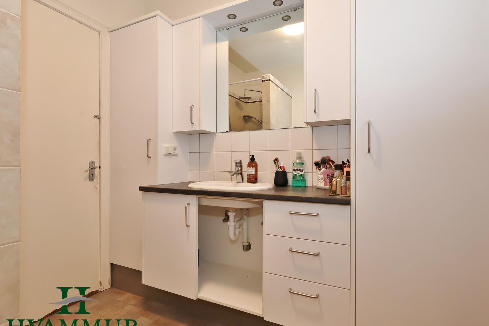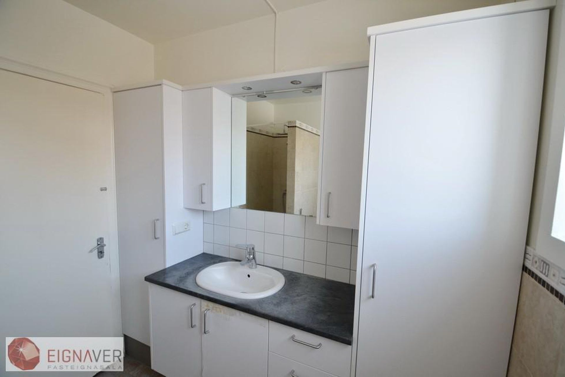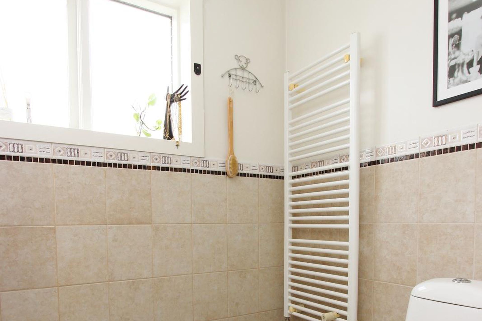 .Baðherbergi er með flísum á gólfi og hluta veggja, ljós innrétting, sturta, handklæðaofn og opnanlegur gluggi.