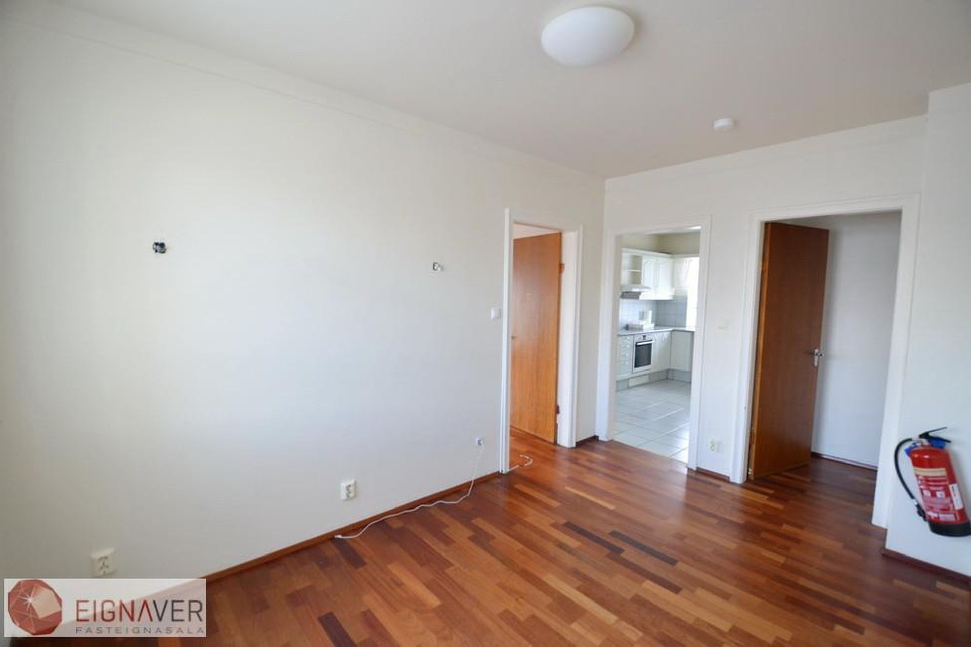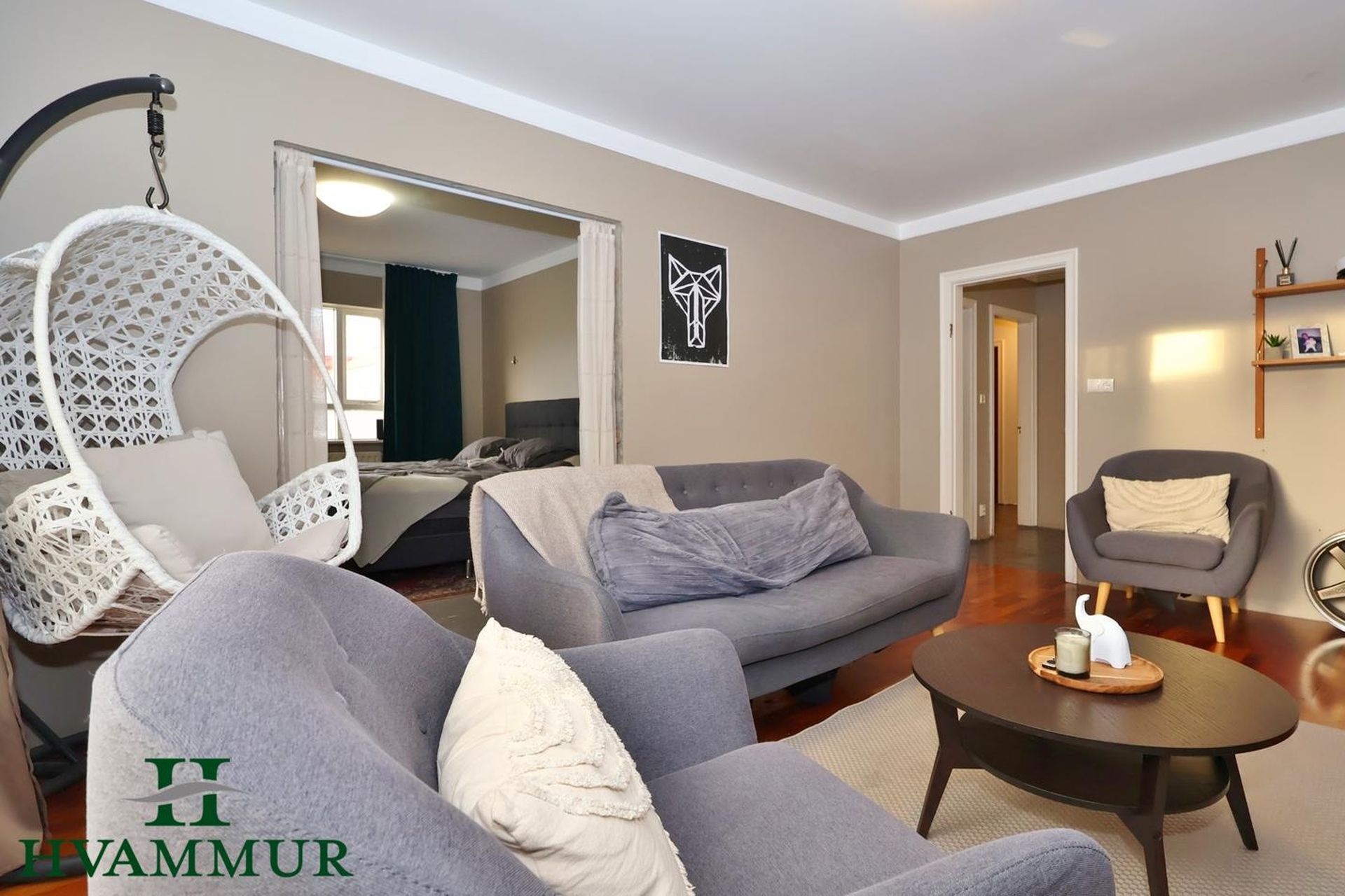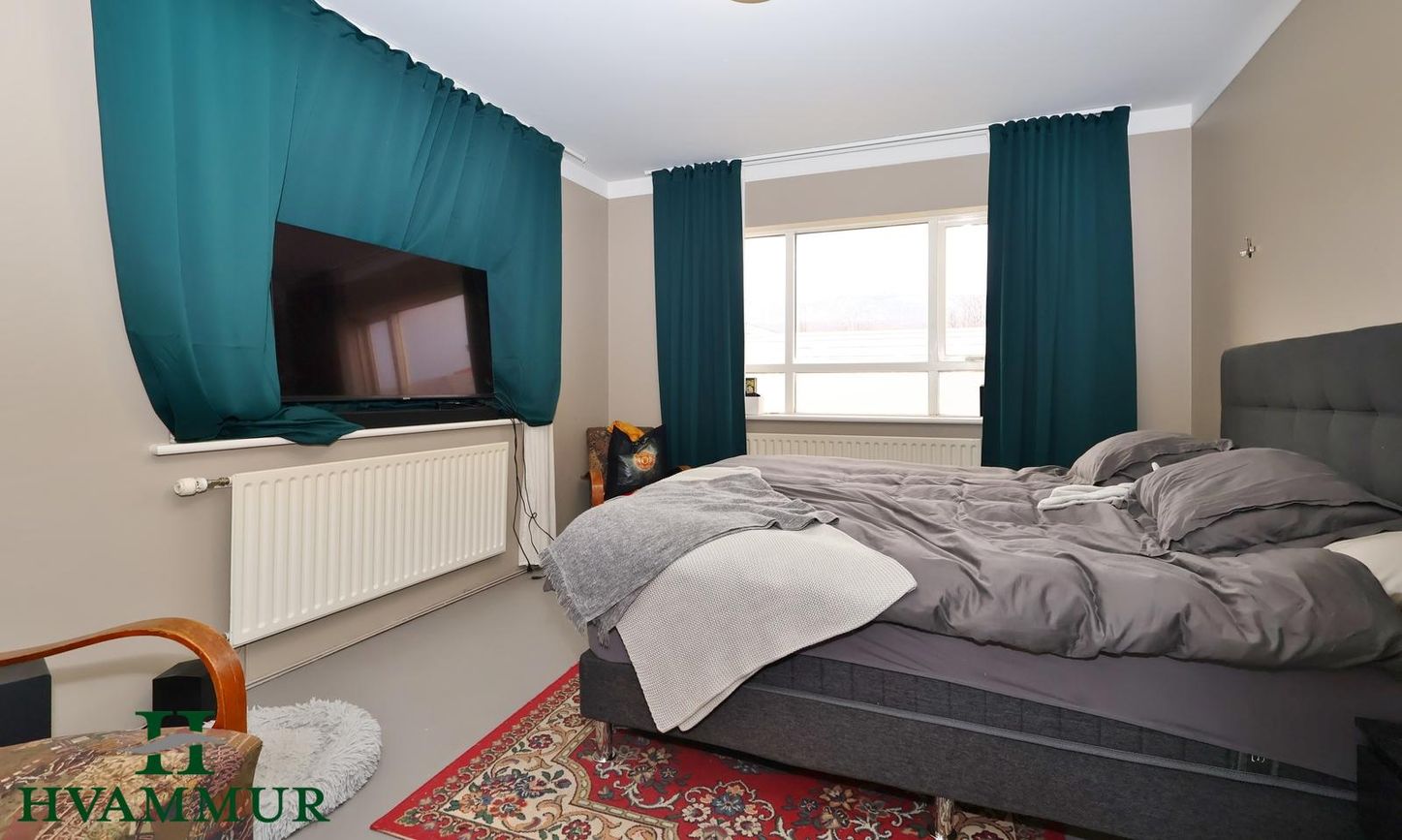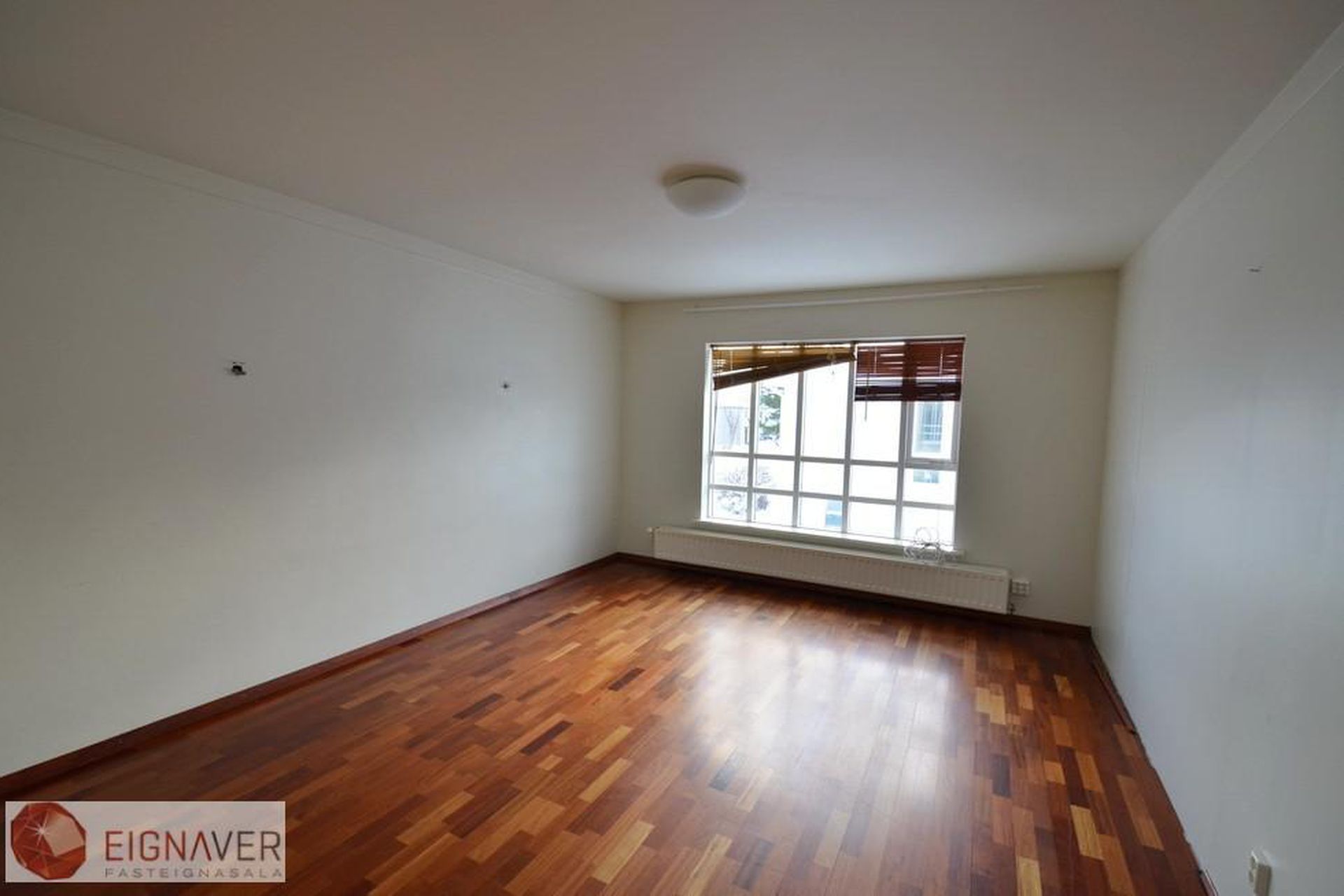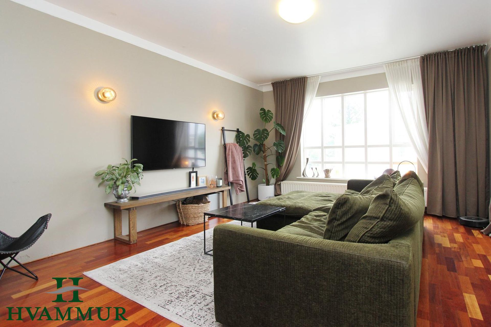 Stofa er með dökku parketi á gólfi og stórum gluggum til suðurs. Opið er úr stofunni inn í eitt af svefnherbergjunum.