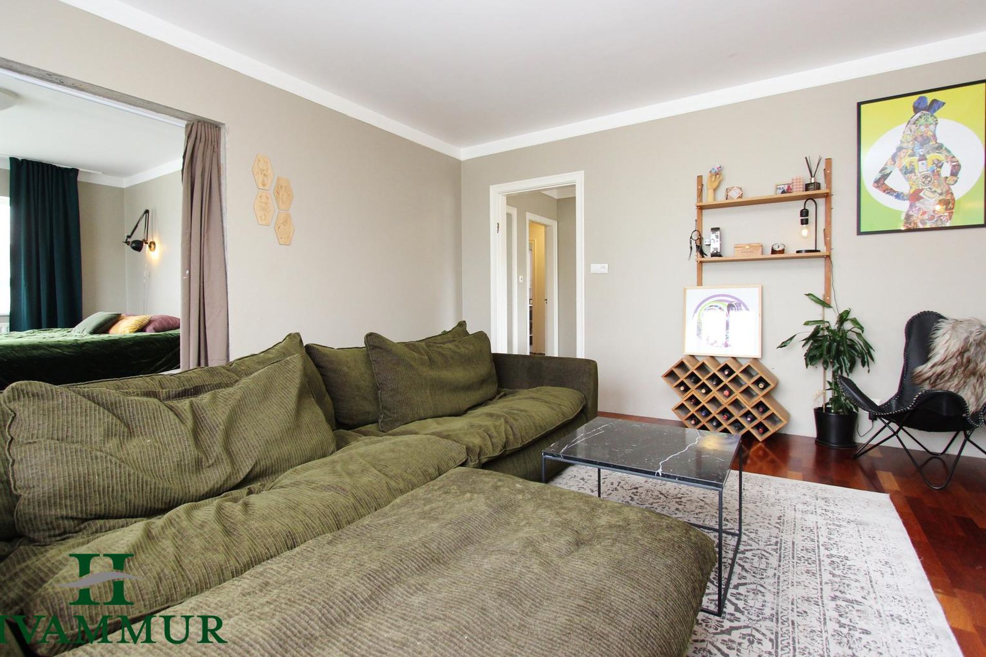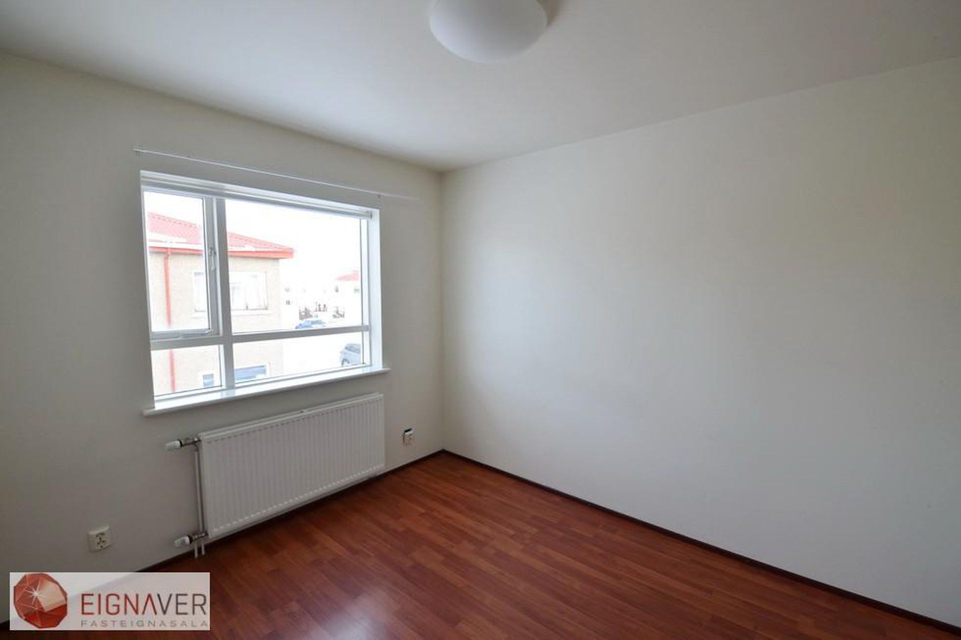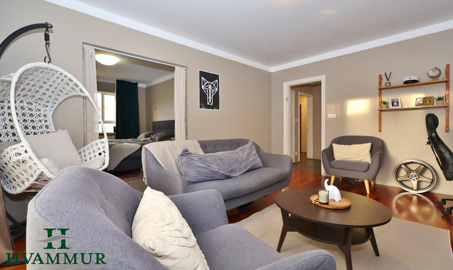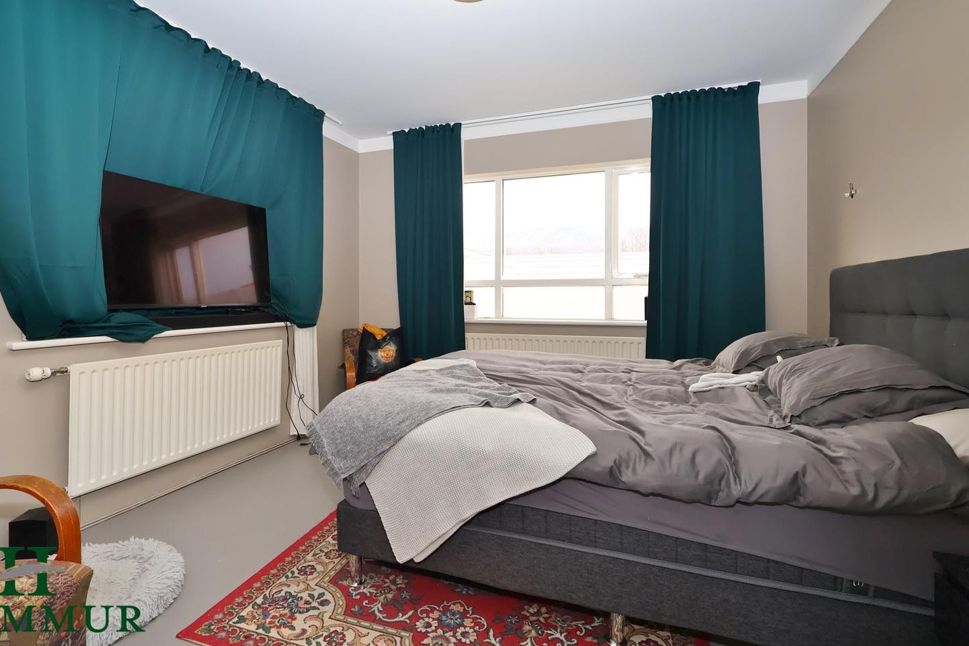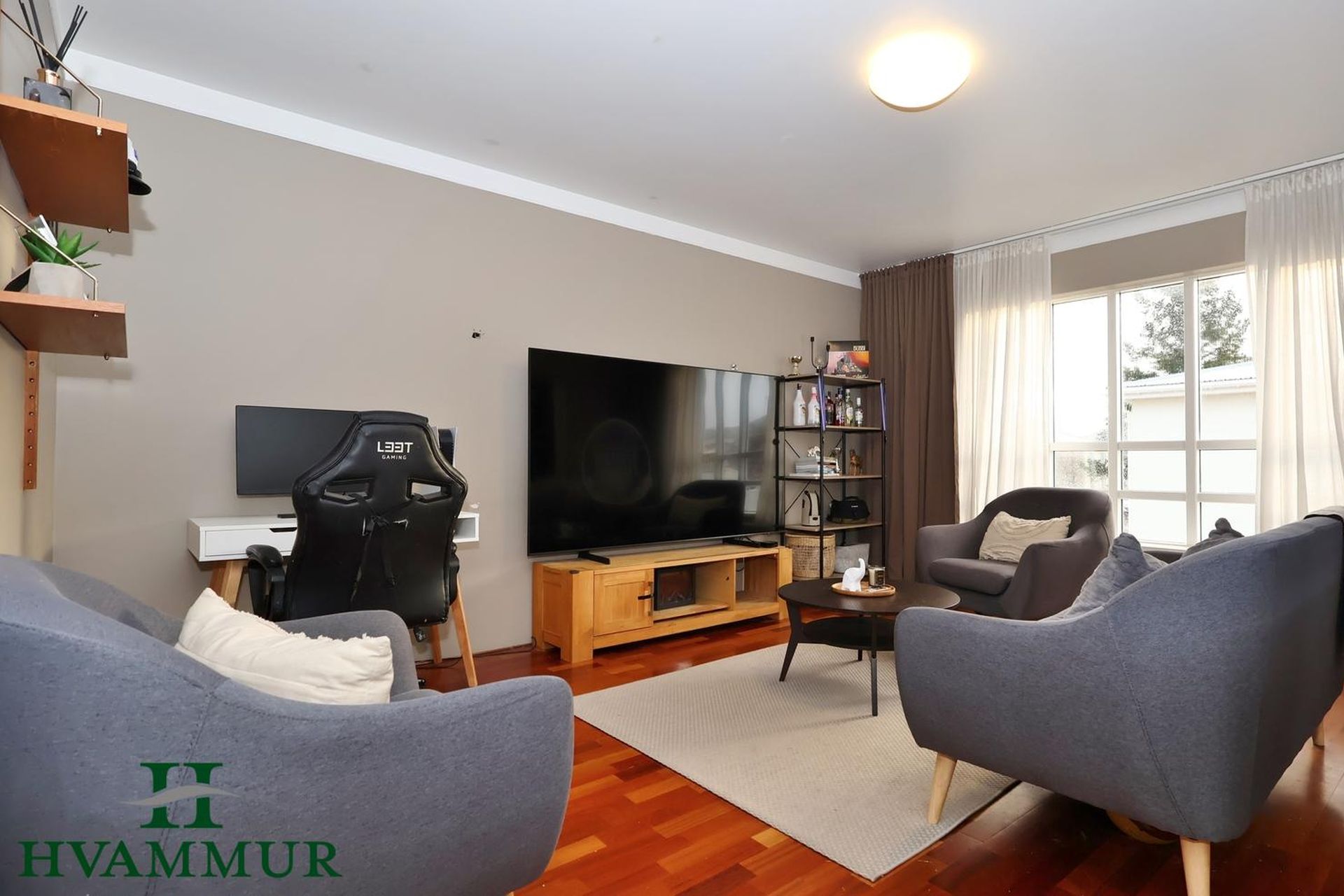 Stofa er með dökku parketi á gólfi og stórum gluggum til suðurs. Opið er úr stofunni inn í eitt af svefnherbergjunum.