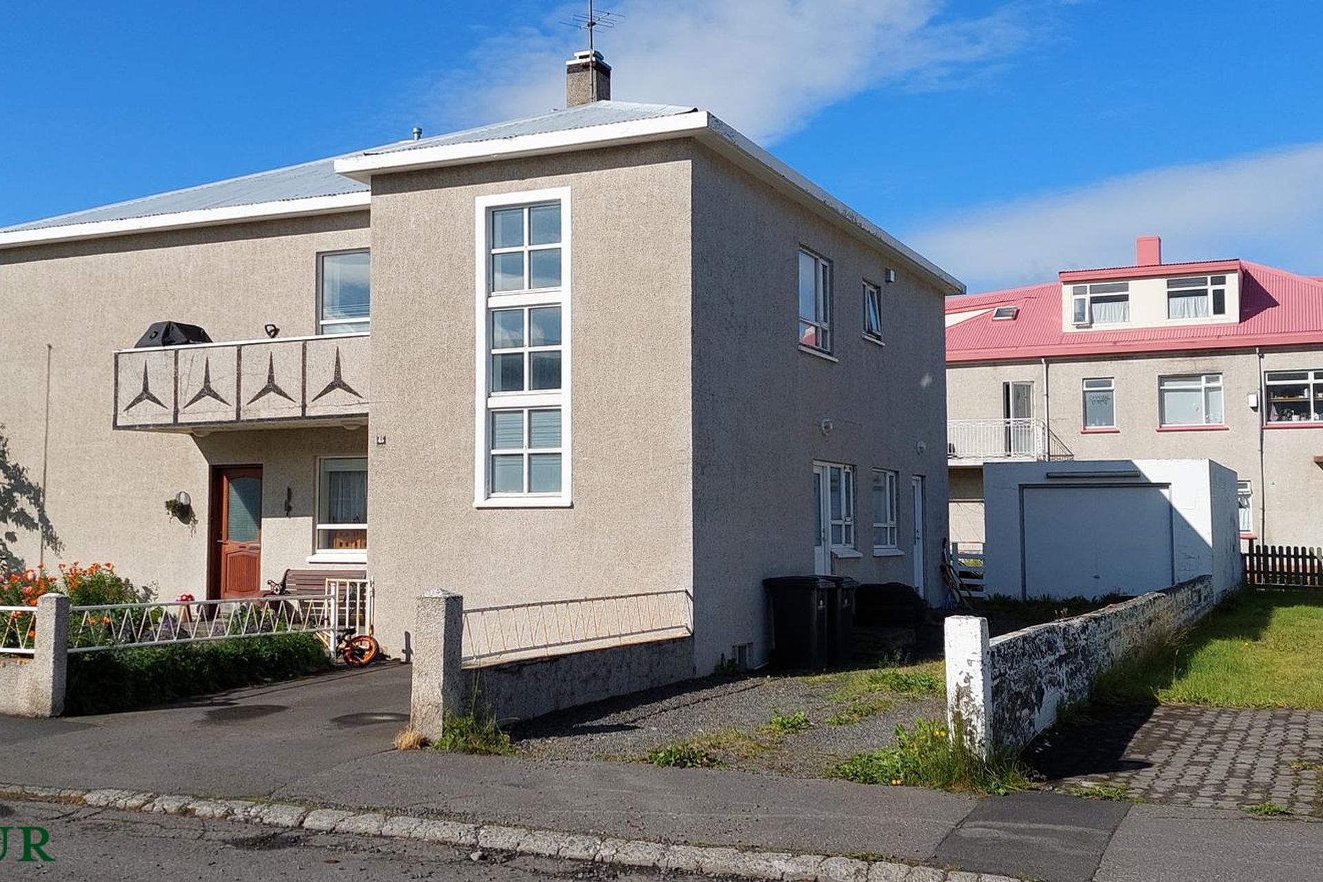 Lóðin er gróin og í óskiptri sameign með íbúð á neðri hæð að undanskildu bílastæði við bílskúr sem er aðeins fyrir efri hæðina.