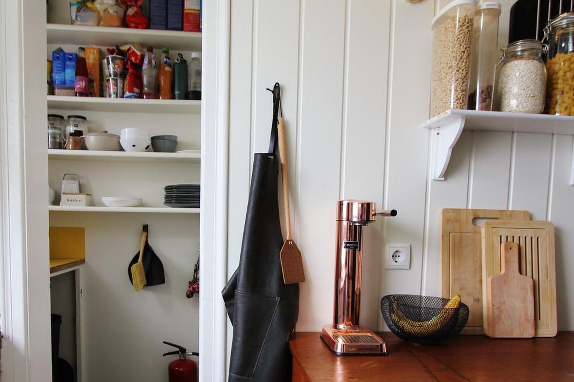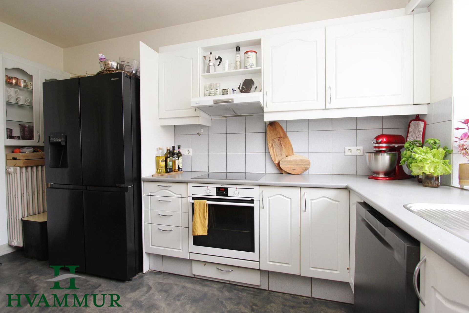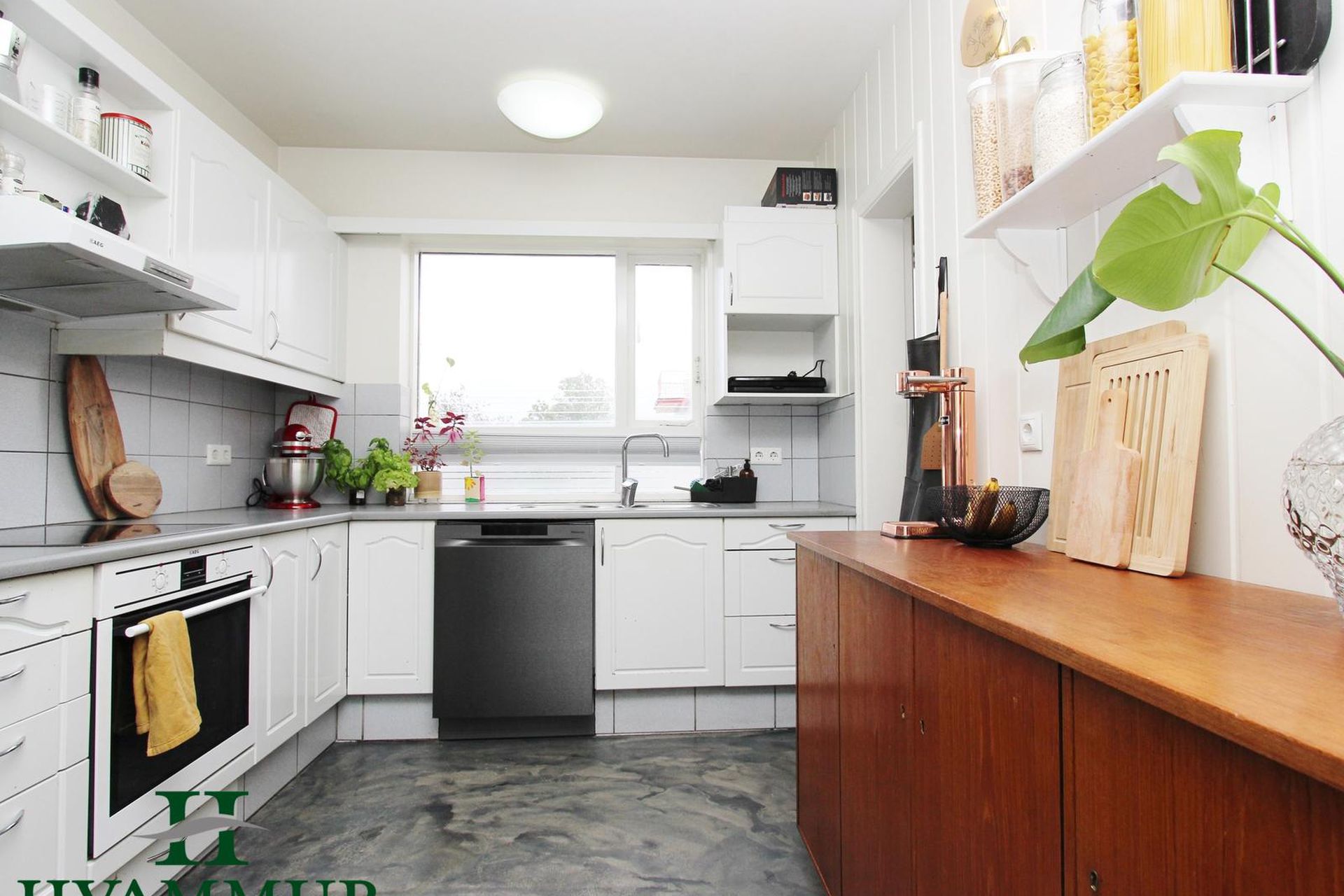 Eldhús er með lökkuðu gólfi, ljósri innréttingu með grárri bekkplötu og flísum á milli skápa. Inn af eldhúsinu er lítið búr.