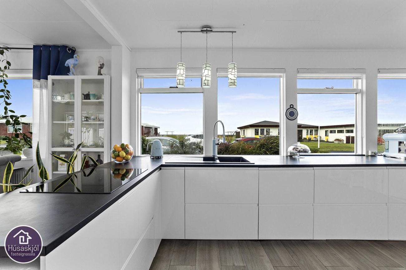 Eldhús: hvít innrétting með góðu skápaplássi, gluggar til vesturs, ný eldhústæki fylgja með