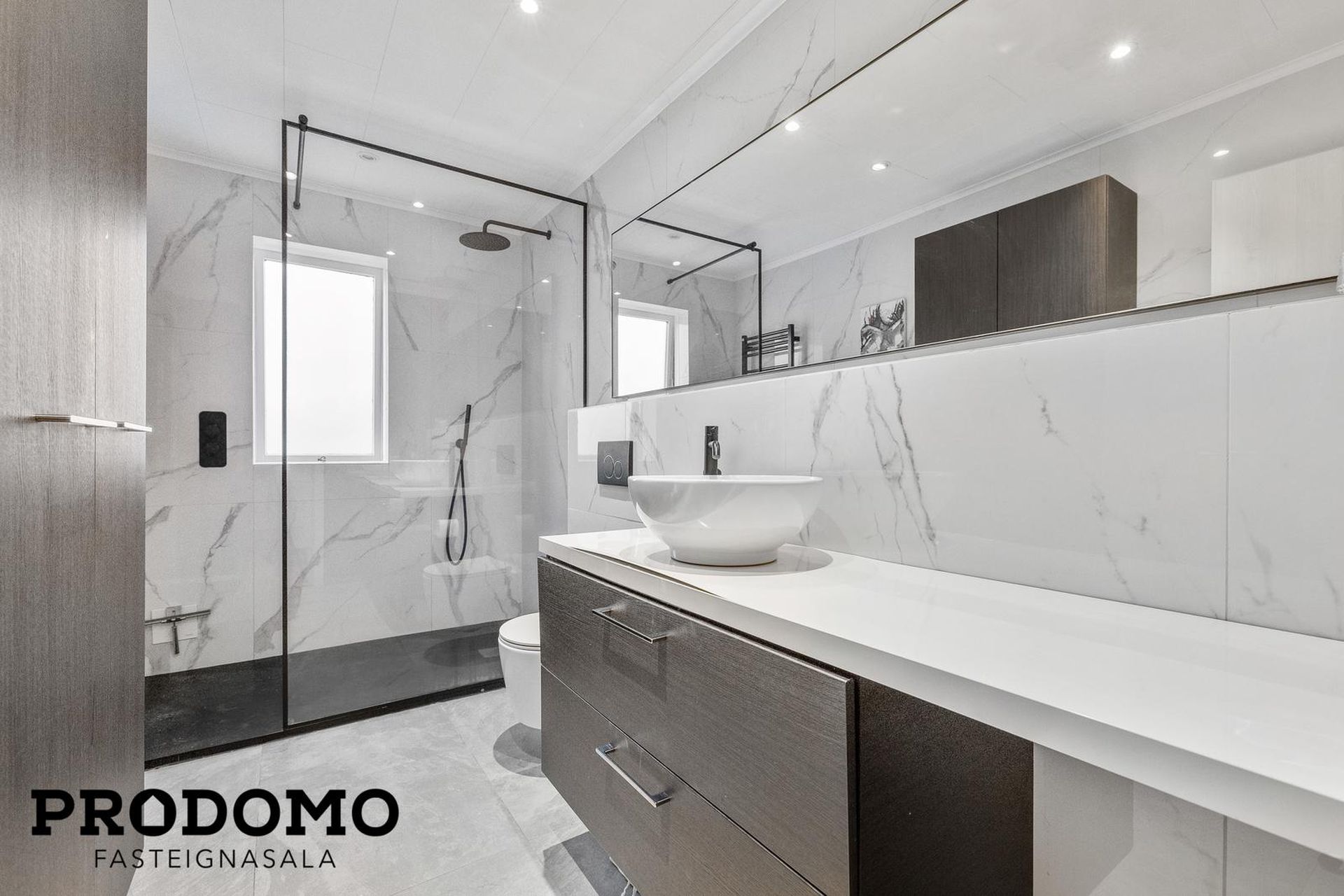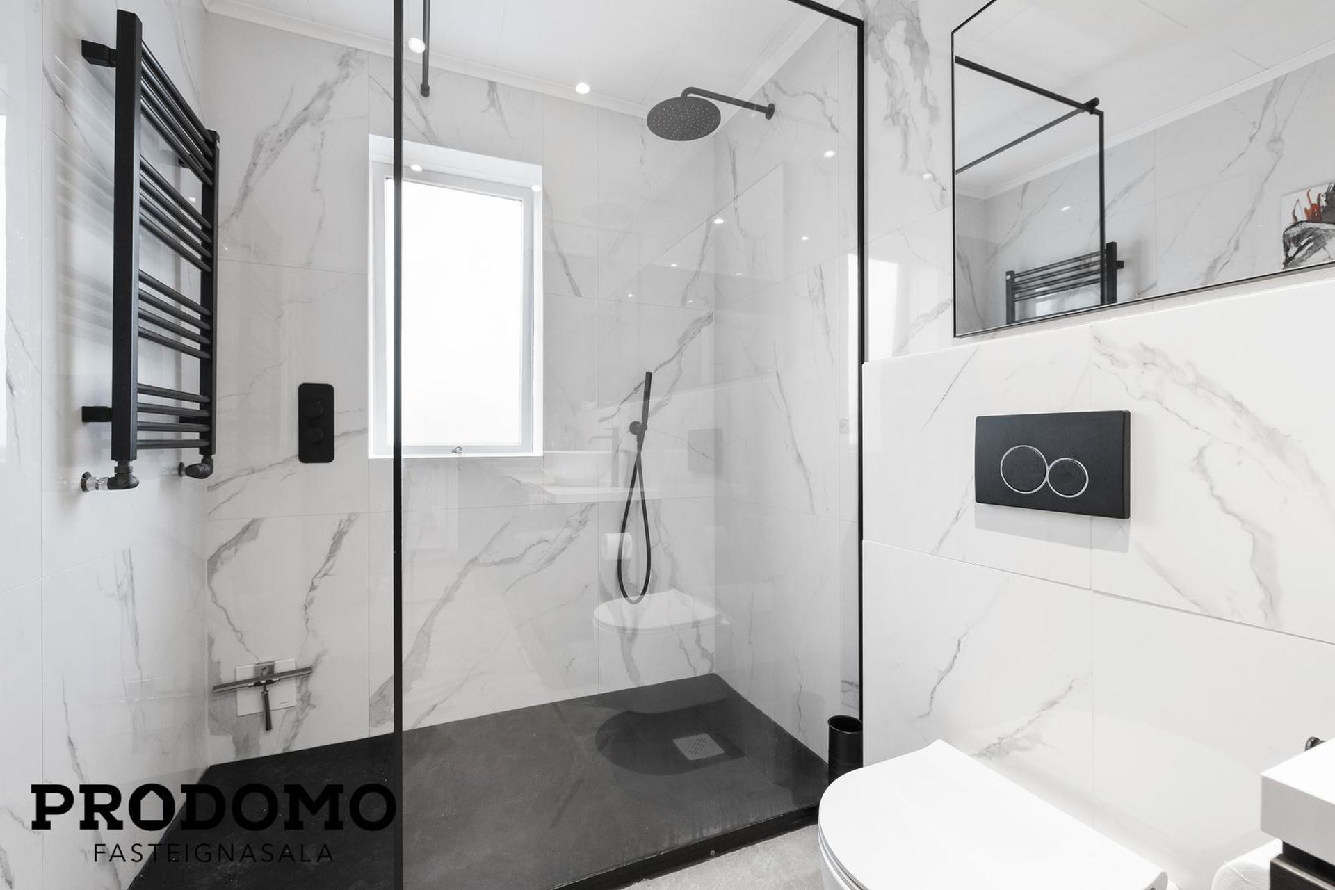 Baðherbergi hefur flísar á gólfi og veggjum, flísalögð sturta og upphengt klósett. Baðherbergi hefur allt verið endurnýjað.