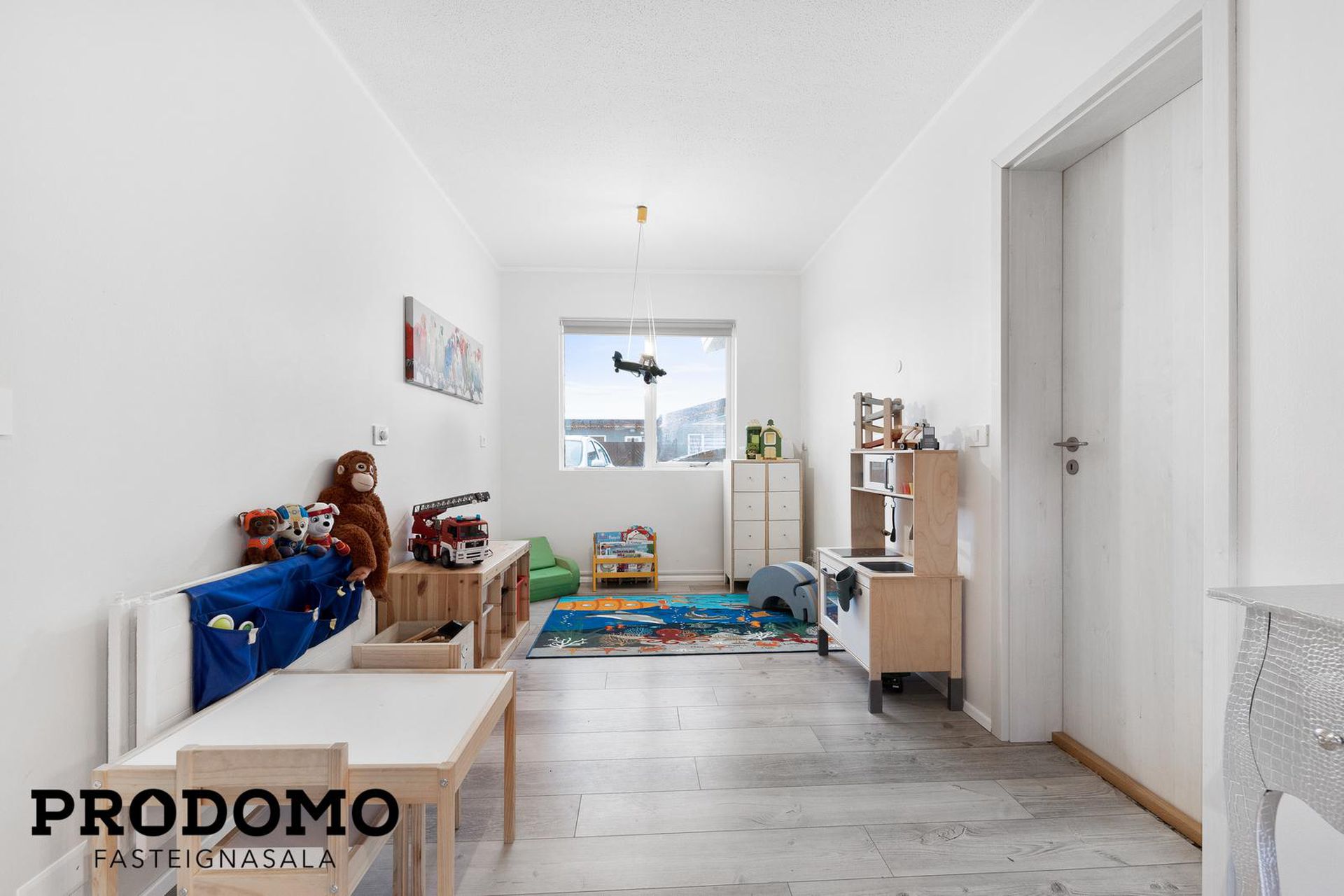 Herbergin hafa parket á gólfi og eru þau þrjú í dag en nokkuð auðvelt að setja fjórða herbergið.