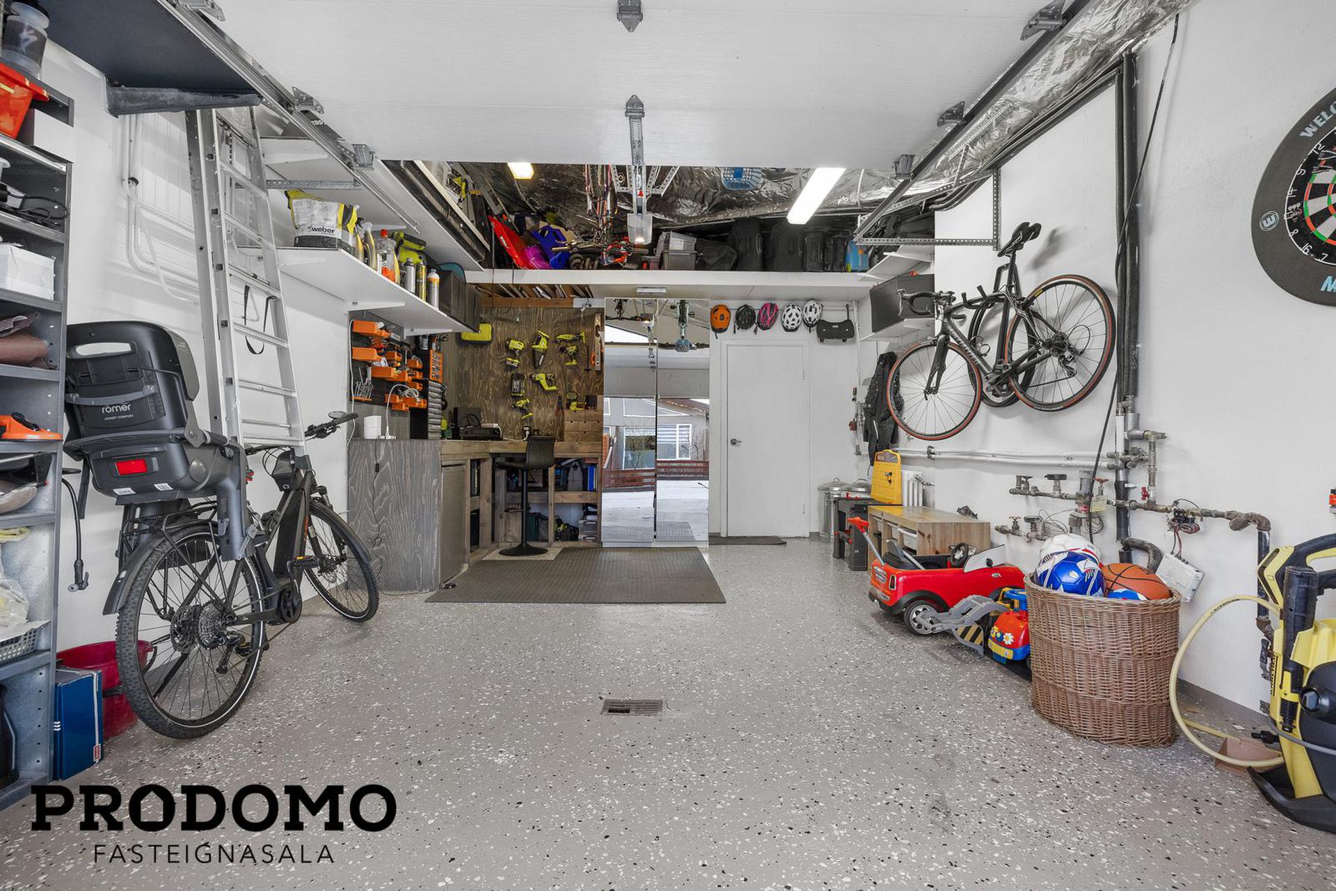Innangengengur bílskúr með góðu geymslulofti. Inngönguhurð frá bílaplani.