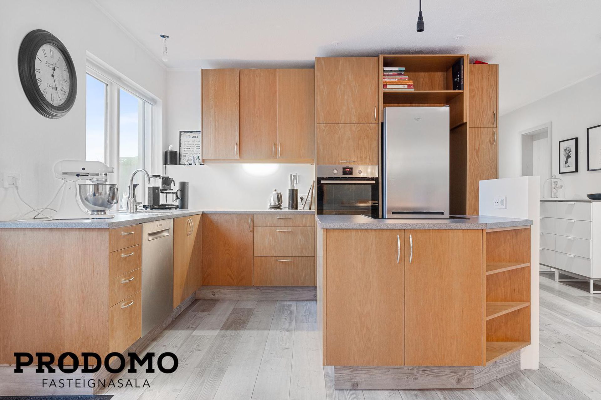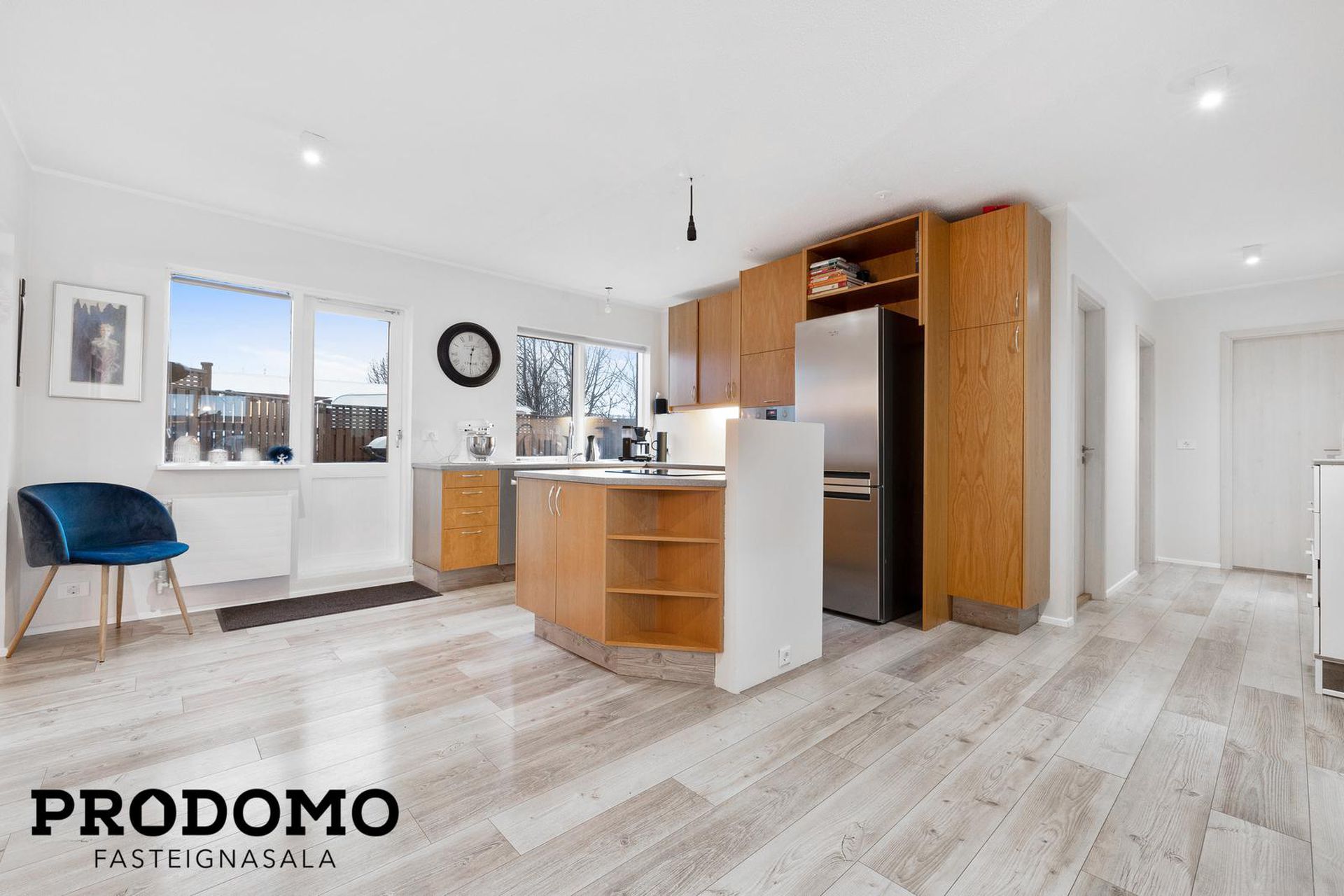 Eldhús hefur parket á gólfi. Opið er á milli stofu og eldhús. Gengið er út á sólpall með heitum potti frá eldhúsi.