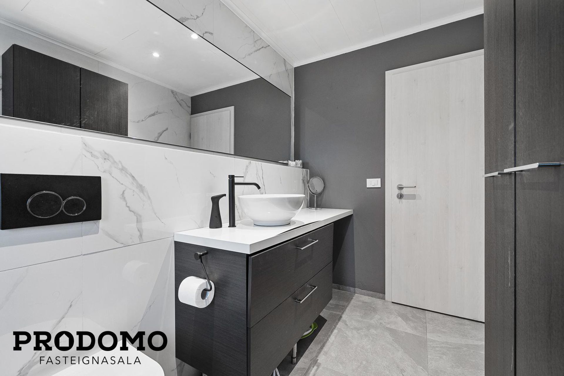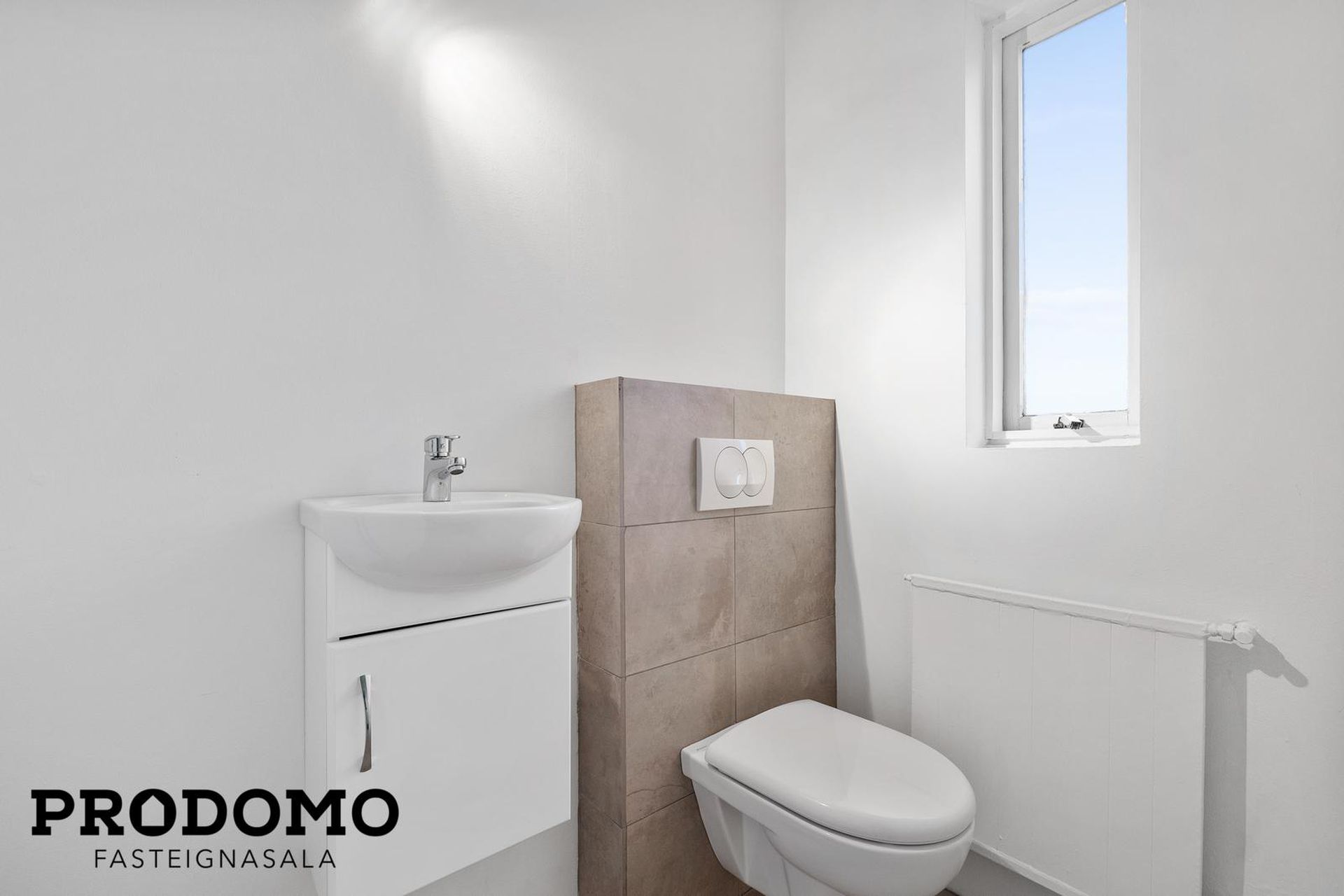 Gestasalerni með flísum á gólfi. Þar er lítil hvít innrétting og upphengt salerni.