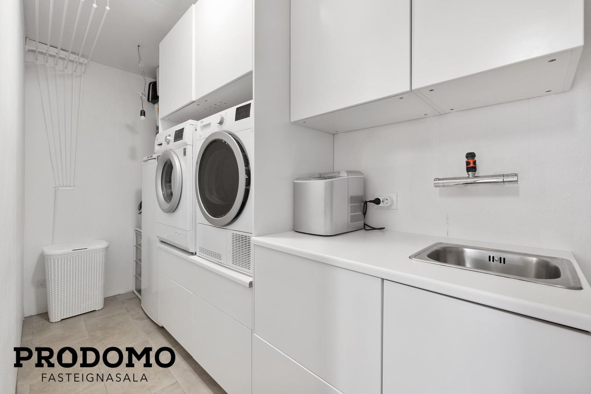 Þvottahús er á milli íbúðarhlutans og bílskúrs. Góð hvít innrétting þar sem gert er ráð fyrir þvottavél og þurrkara í vinnuhæð. Ásamt innréttingu með skolvask.
