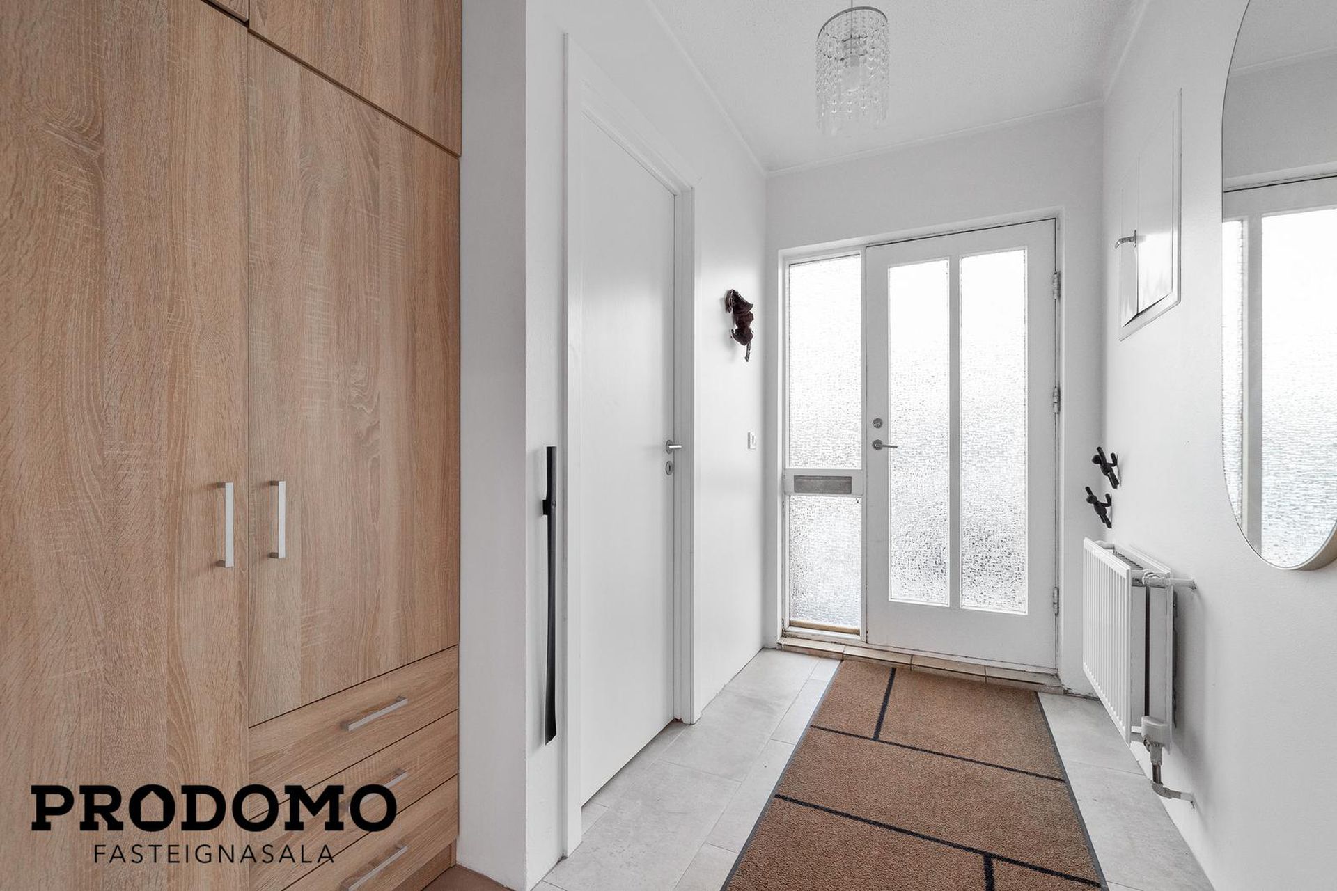 Forstofan hefur flísar á gólfi og fataskápur
