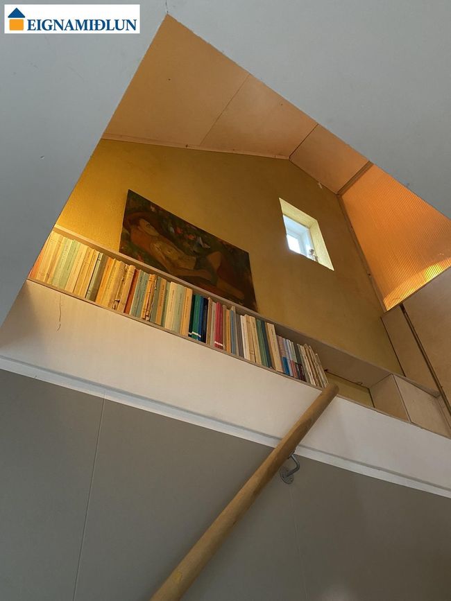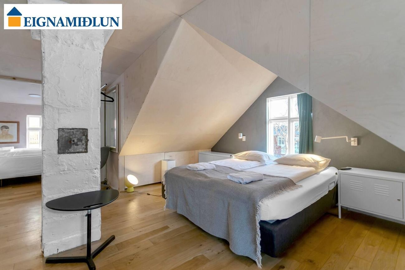 Opið rými: Risið er að mestu opið og bjart rými í dag en eitt svefnherbergi er þó afmarkað með fallegri rennihurð. Auðveldlega er hægt að bæta við fleiri herbergjum í risinu.