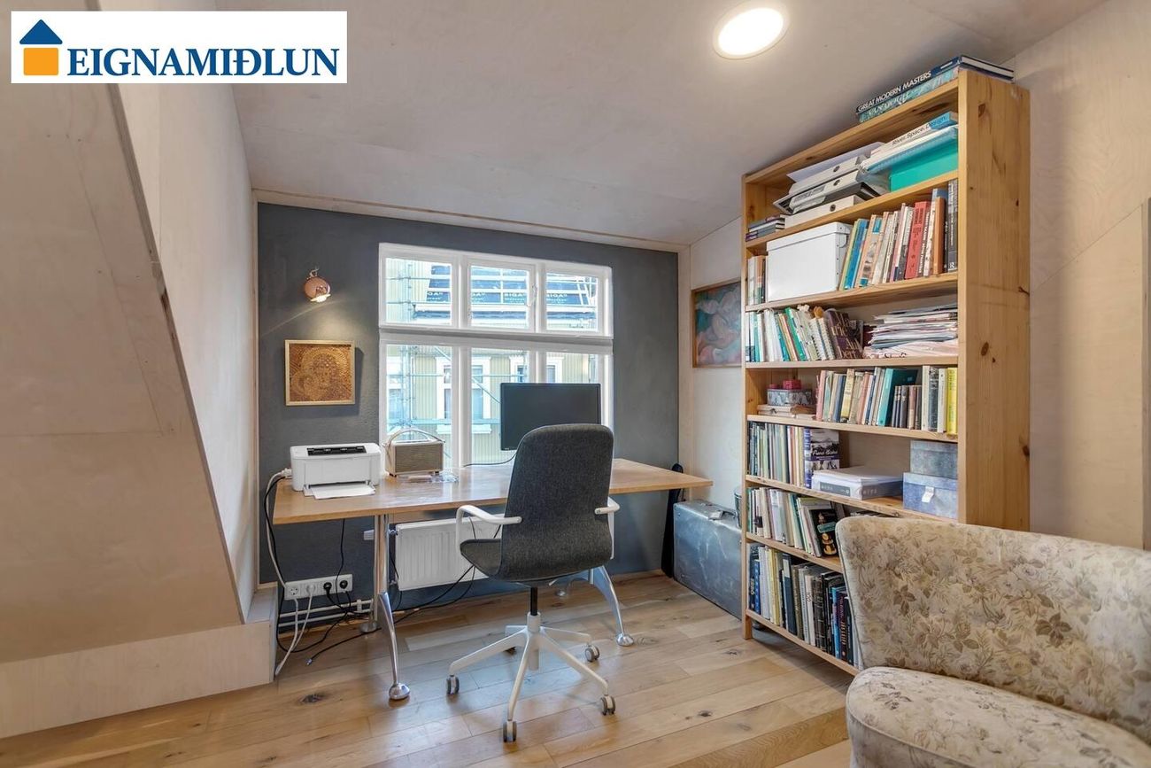 Hol: Eikarparket á gólfi og fallegir gluggar í tvær áttir. Núverandi eigandi hefur notað krók inn af holi fyrir gestasvefnsófa.