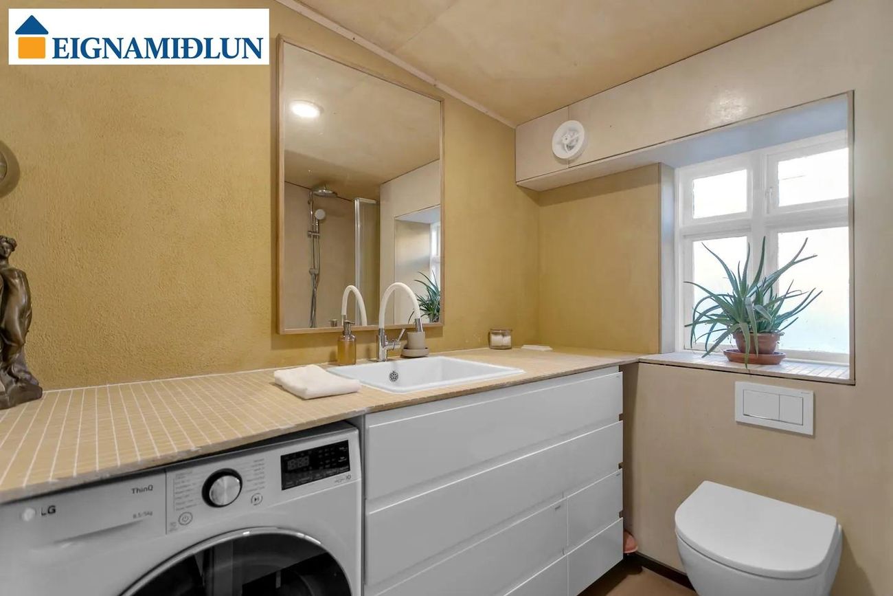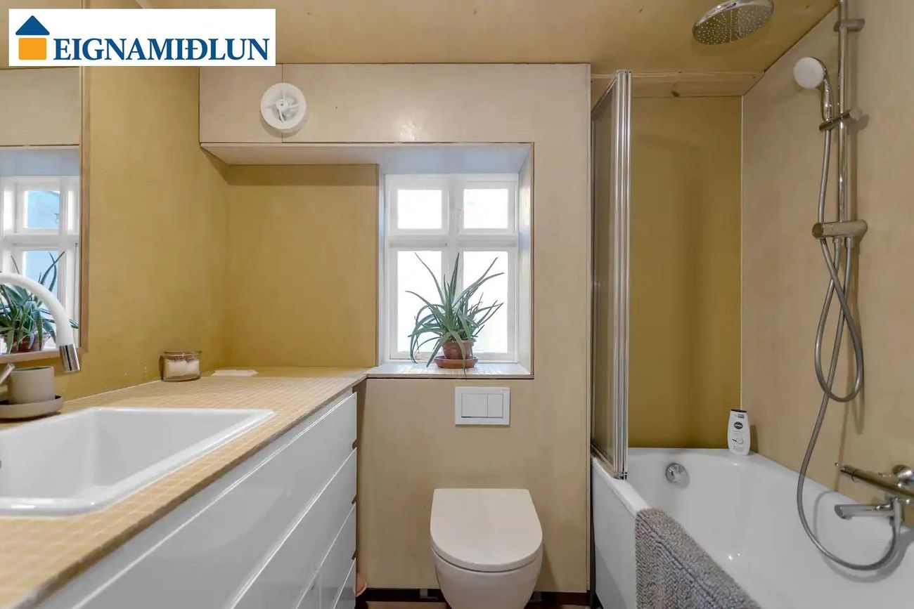 Baðherbergi: Nýuppgert og flísalagt að hluta, ný innrétting, baðkar m/sturtu og tengi fyrir þvottavél, dúkur á gólfi og gólfhiti. Góður gluggi og sjálfvirk loftræsting.