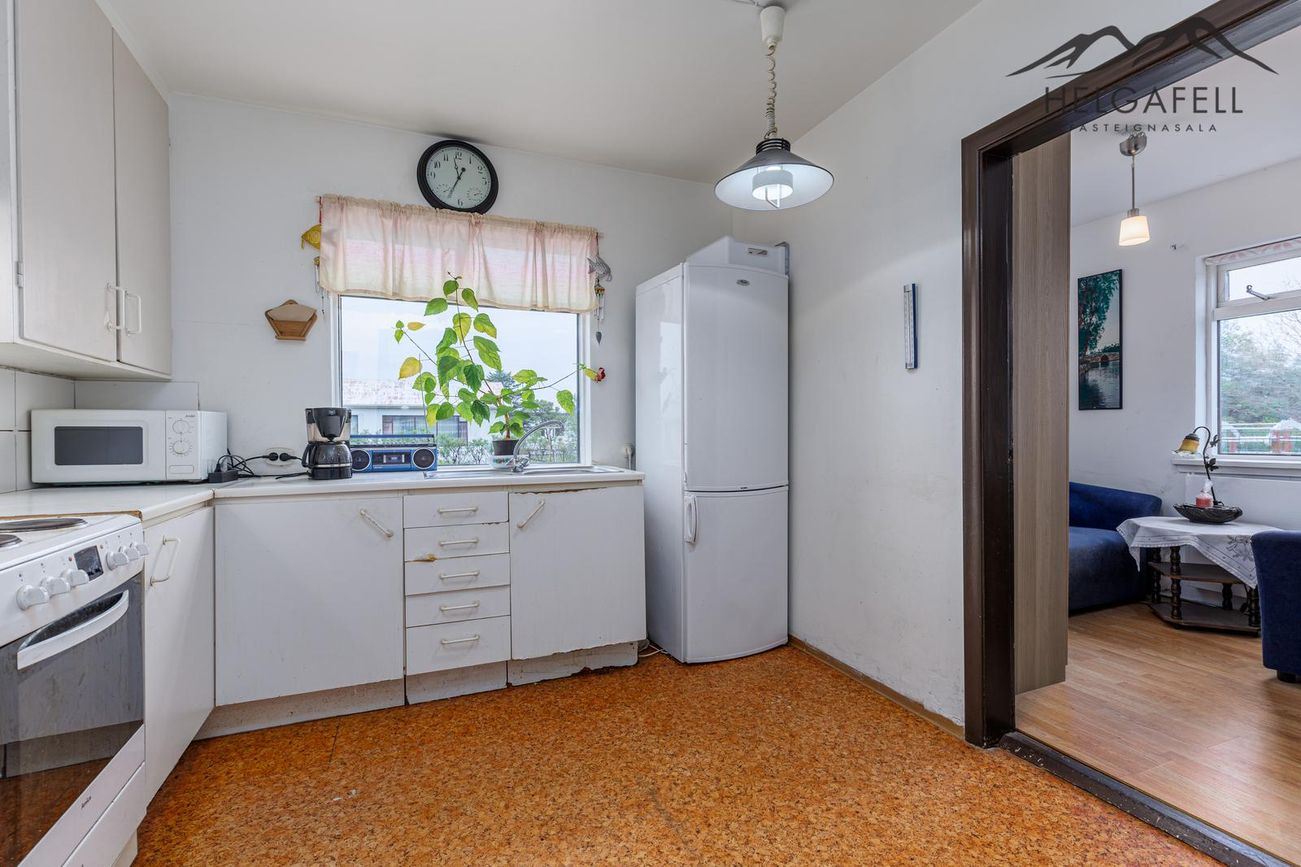 Eldhús: Hvít innrétting, eldavél, helluborð, tengi fyrir þvottavél, korkur á gólfi.