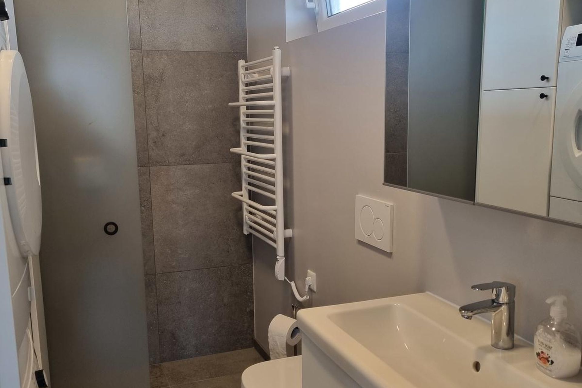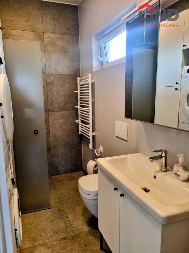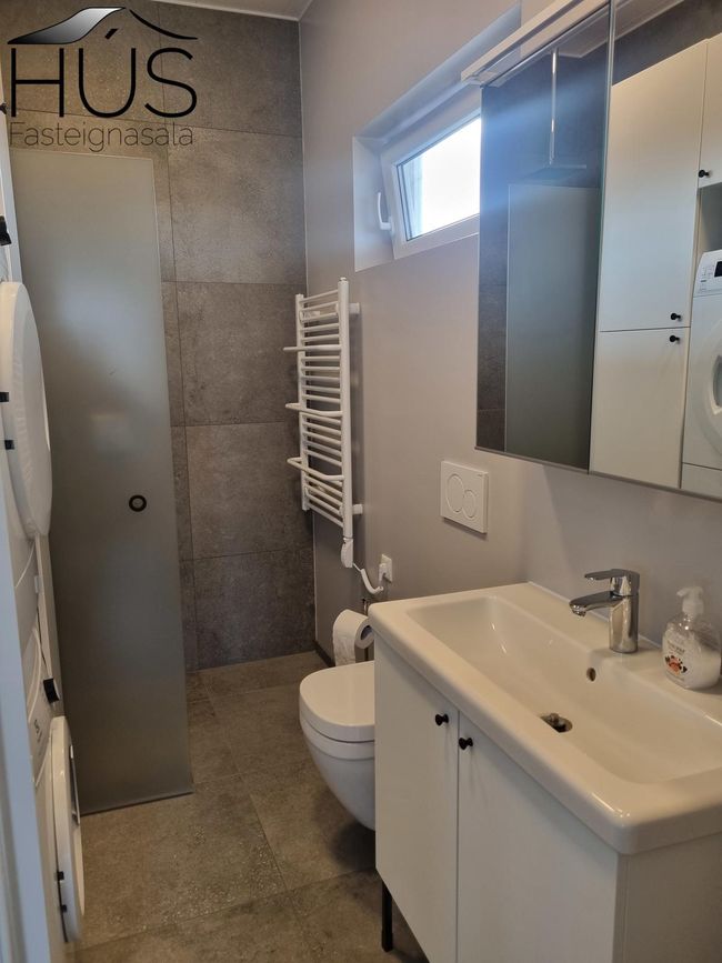 Flísar í hólf og gólf. Upphengt WC. Góð innrétting. Walk-in sturta. Opnanlegur gluggi. Tengi fyrir þvottavél og þurrkara.