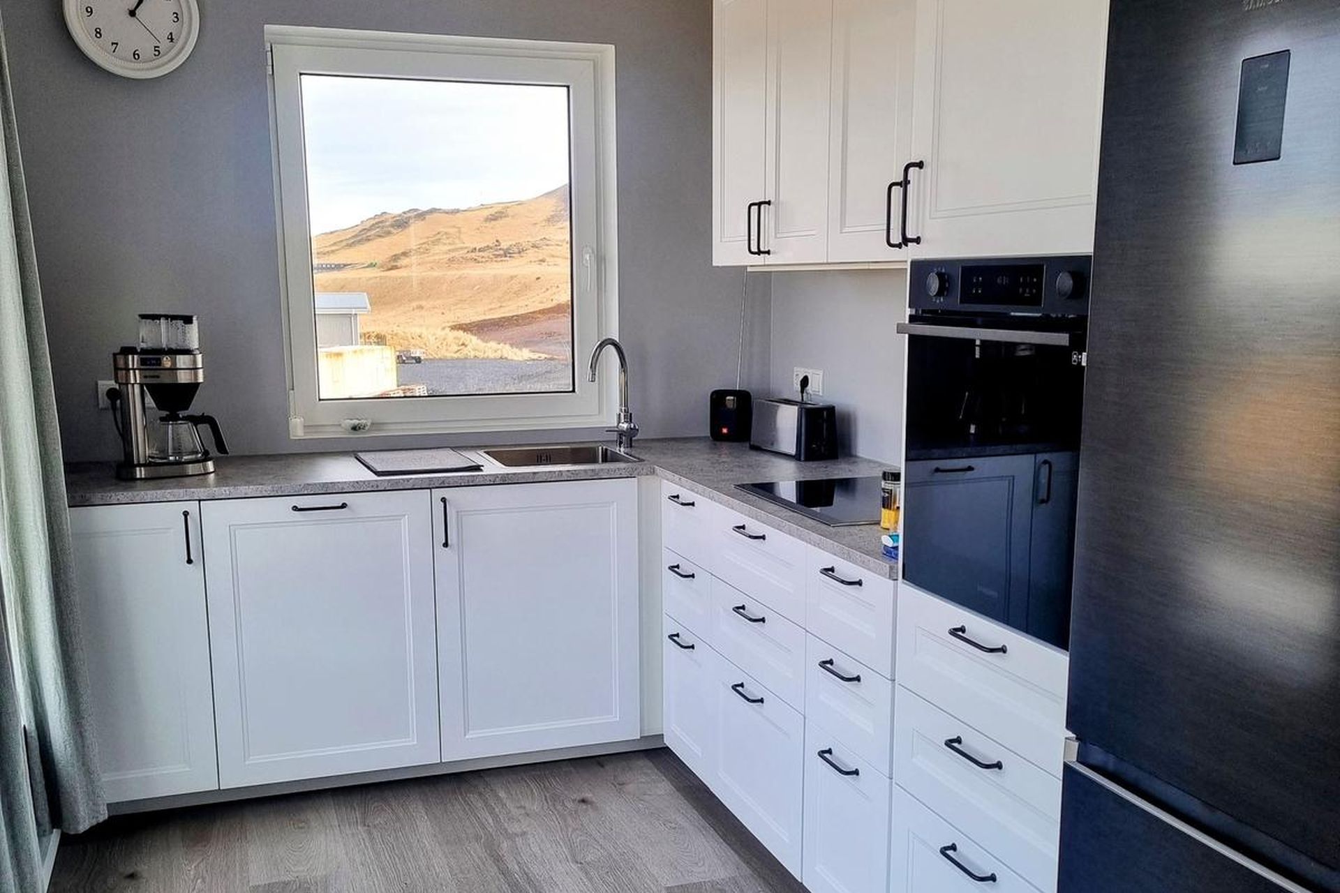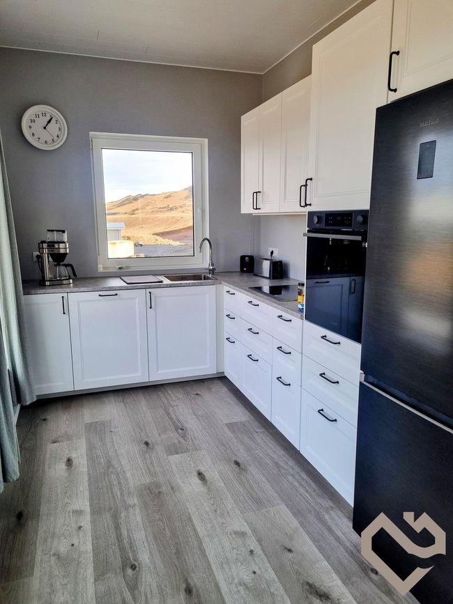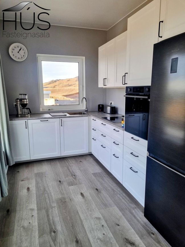 Vínilparket á gólfi. Hvít rúmgóð innrétting. Ný tæki.