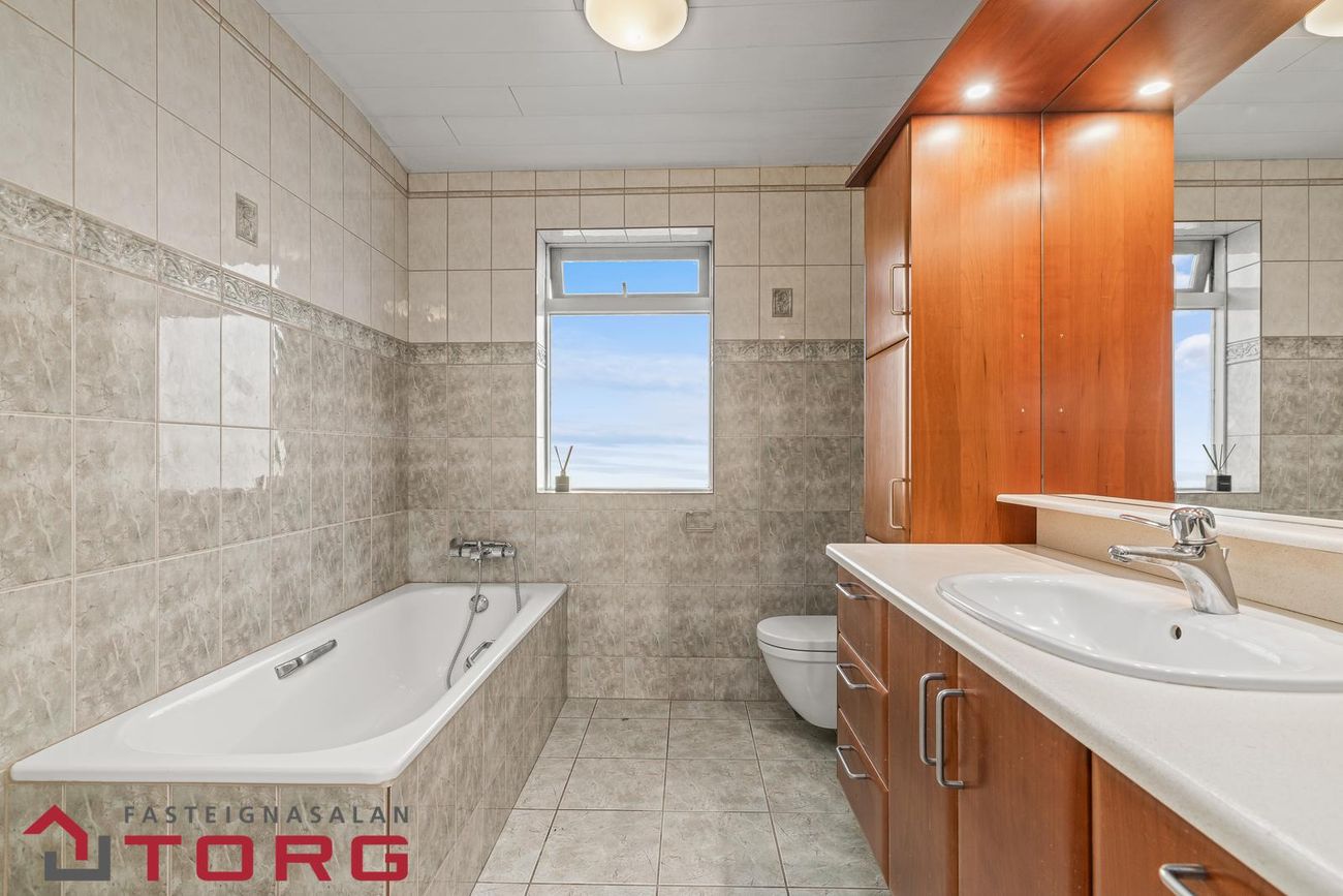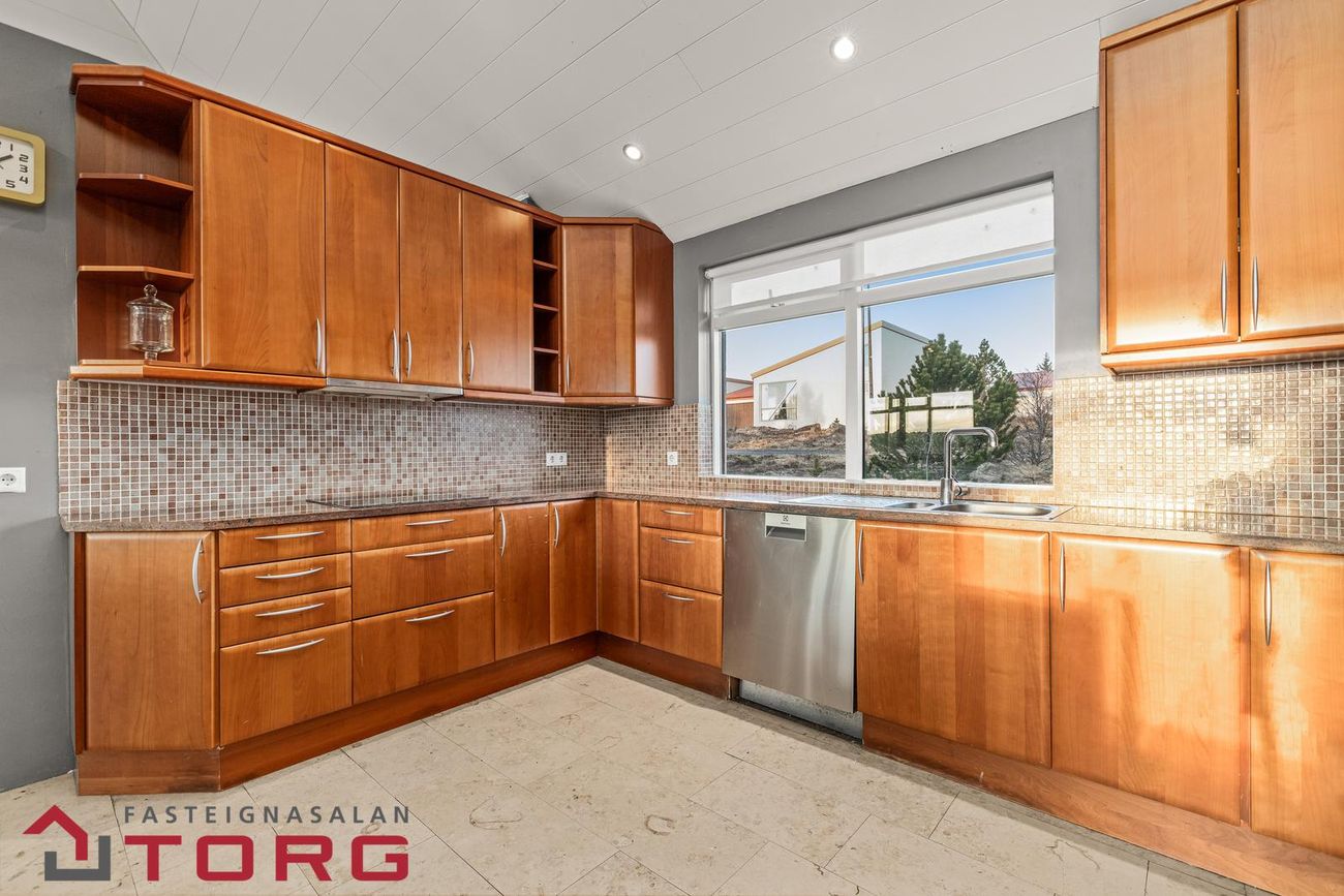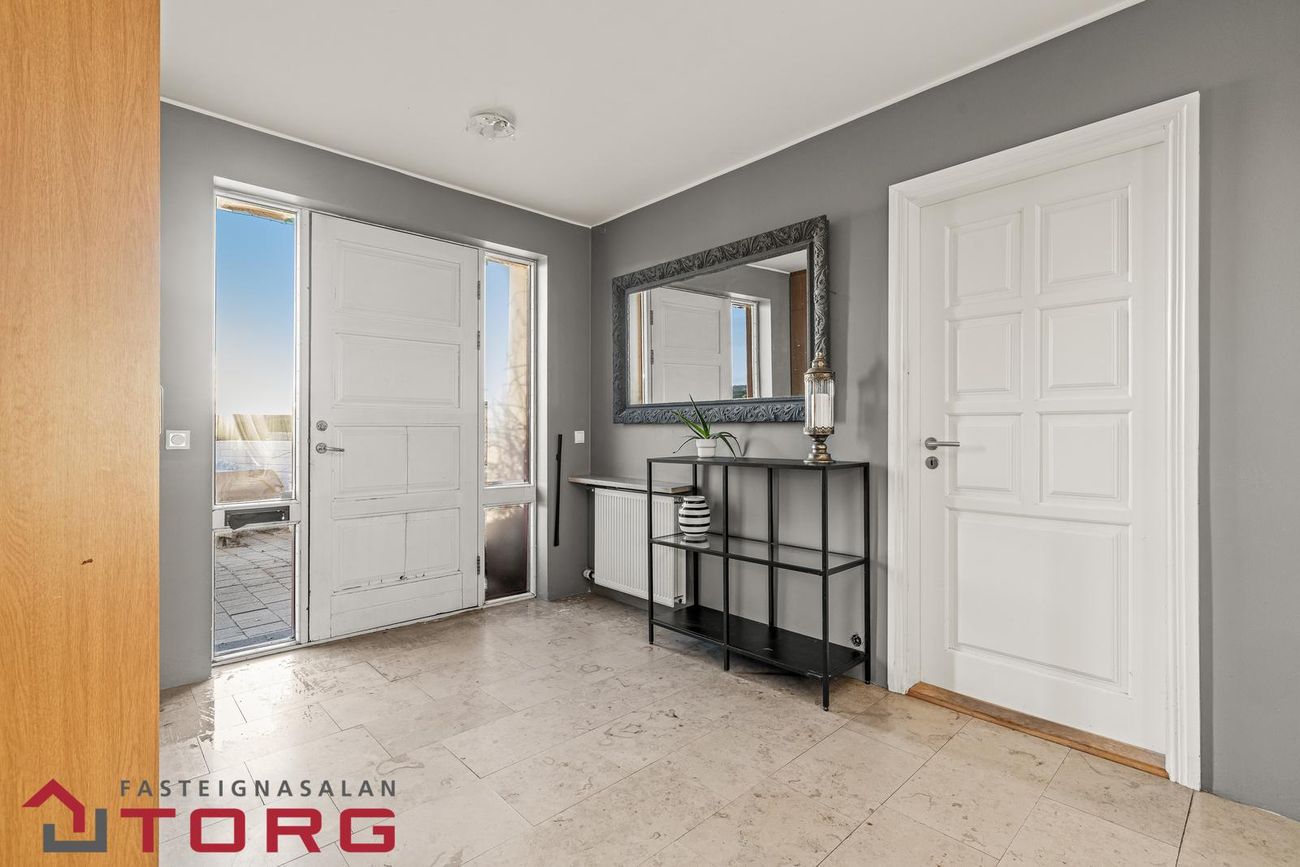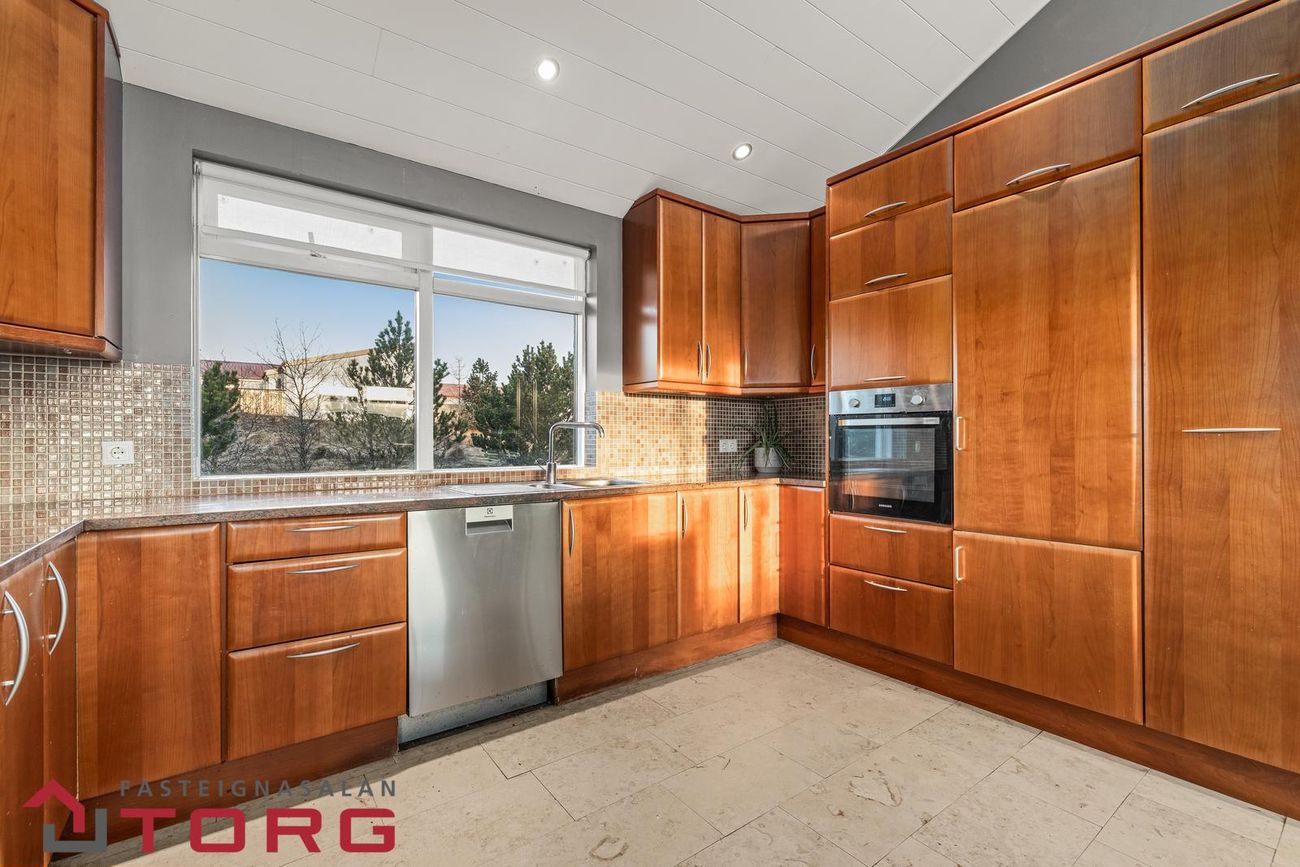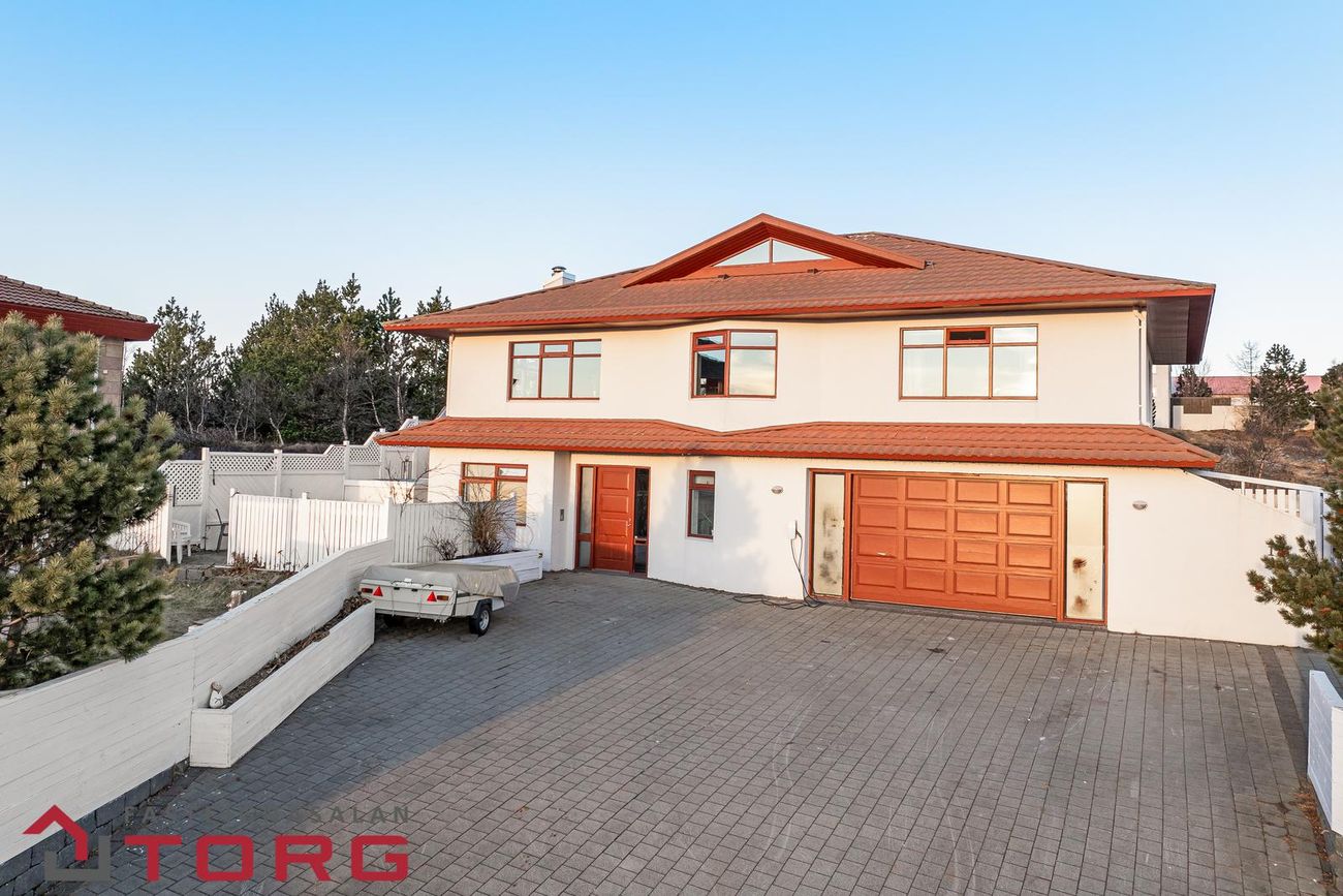 Innbyggður tvöfaldur bílskúr með hitalögn. Innangengt frá forstofu.