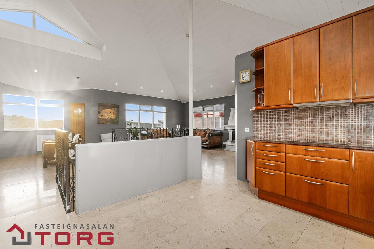 Mjög rúmgott og opið eldhús með granít á borðum, góðu skápaplássi og eldhústækjum. Marmari á gólfi.
