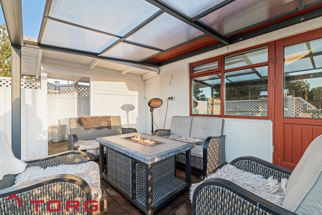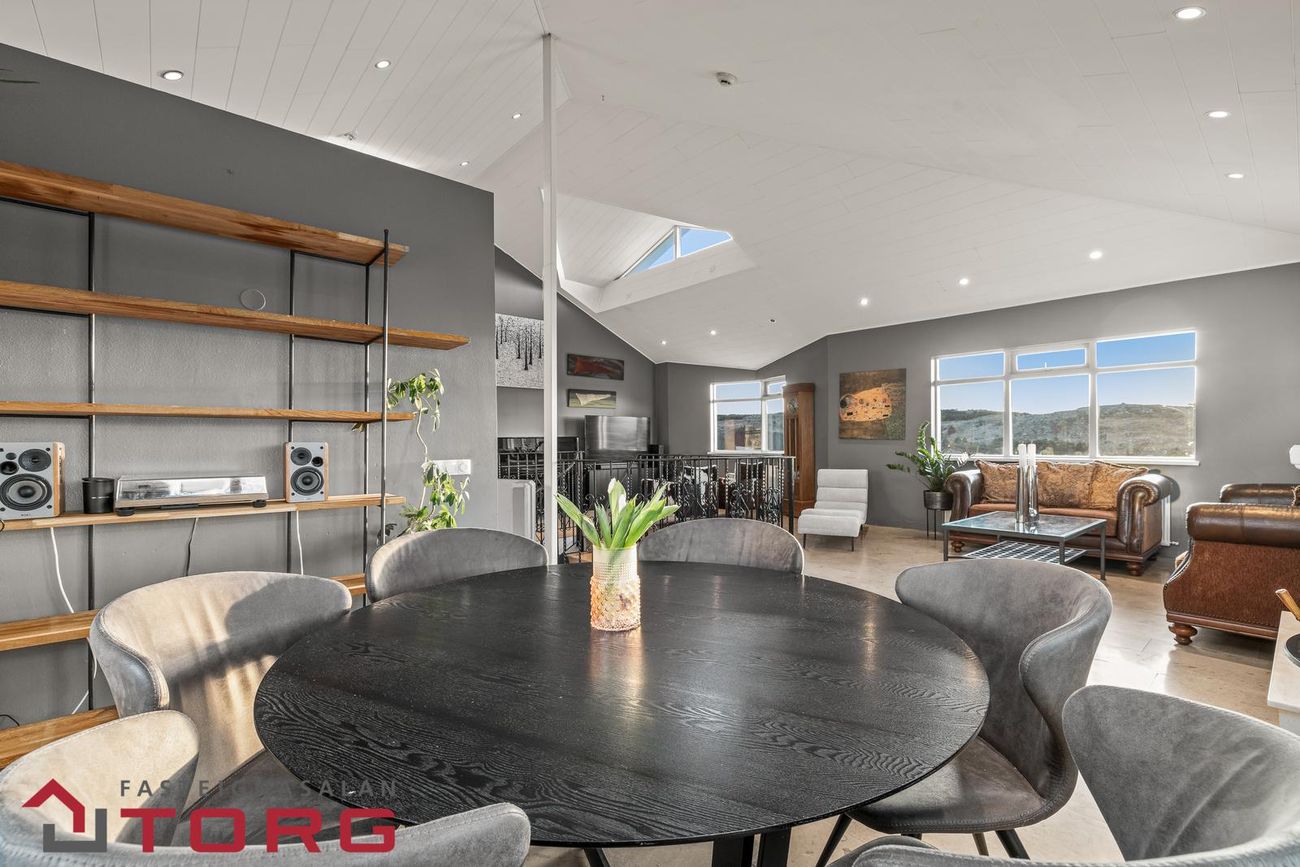 Rúmgóð og björt stofa og borðstofa með marmara á gólfi. Útgengt út á yfirbyggða verönd.