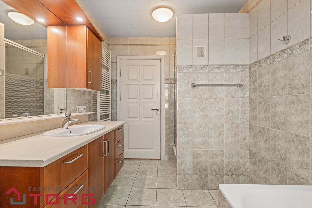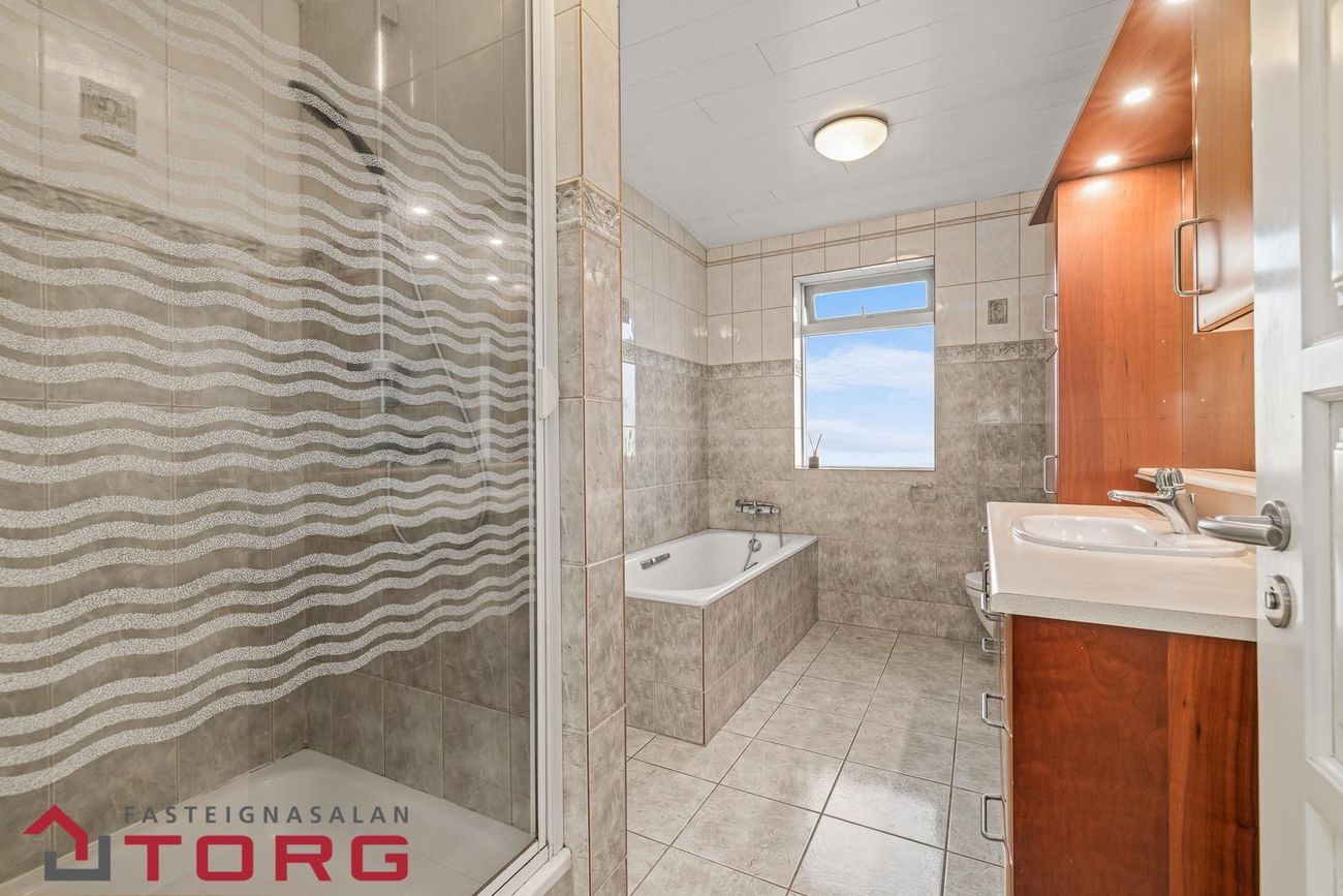 Baðherbergi með flísalegu gólfi og veggjum, sturta, baðkar og glugga. Annað baðherbergi með handlaug, salerni og sturtu.
