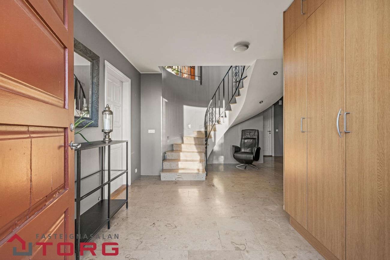 Marmari, parket og flísar á gólfum. Flísalegir veggir í baðherbergjum.