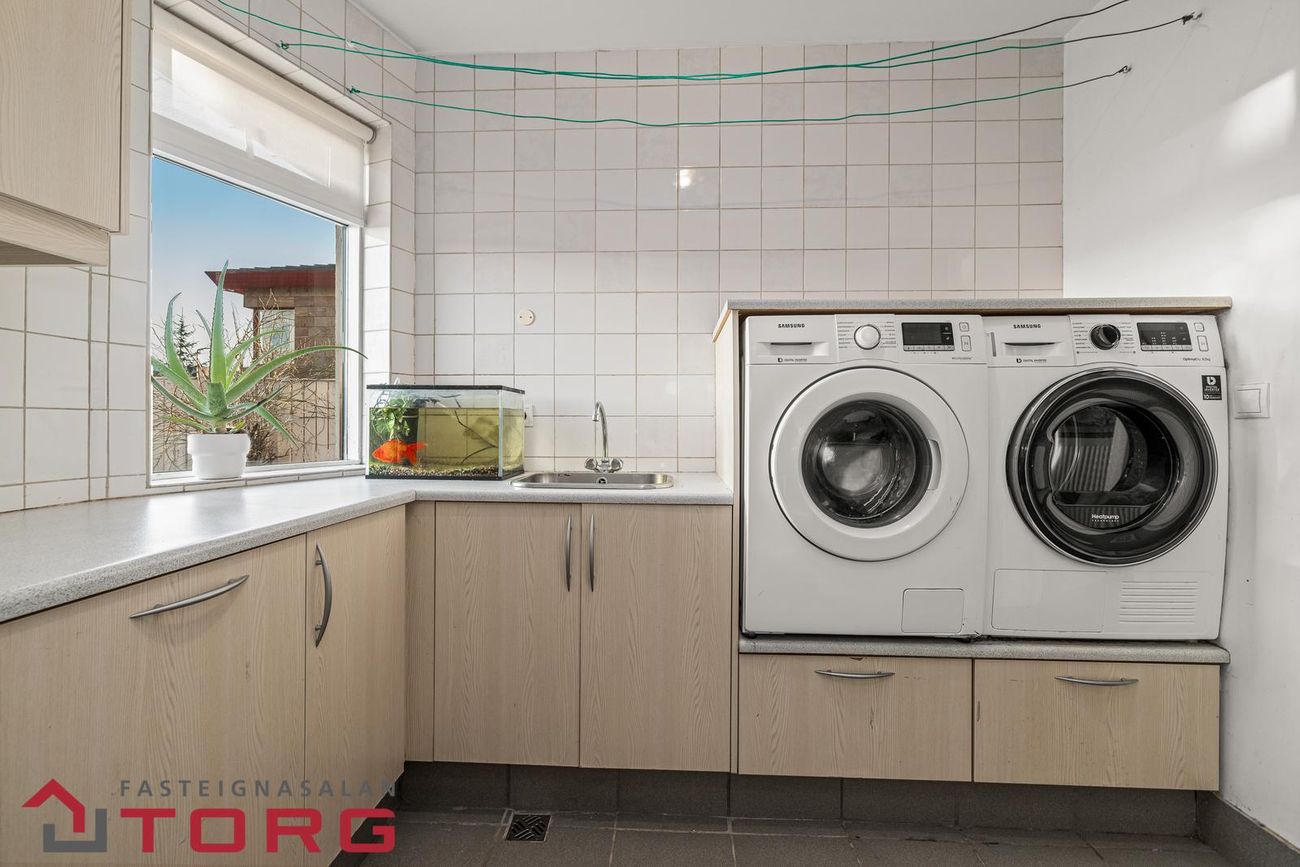 Þvottahús með vaski, borði og tengi fyrir þvottavél og þurrkara.