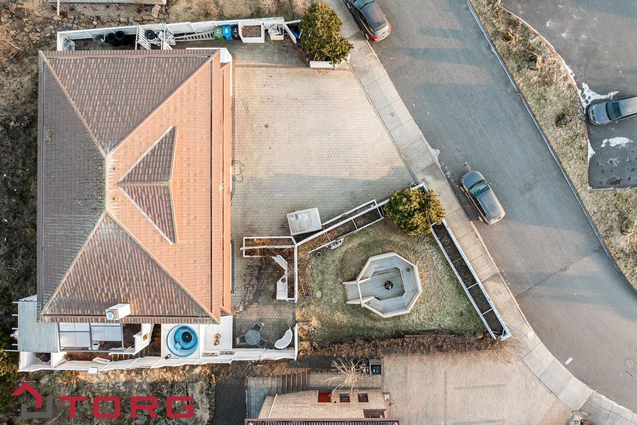 Gróinn og hellulagður garður með glæsilegri aðkoma að húsinu.