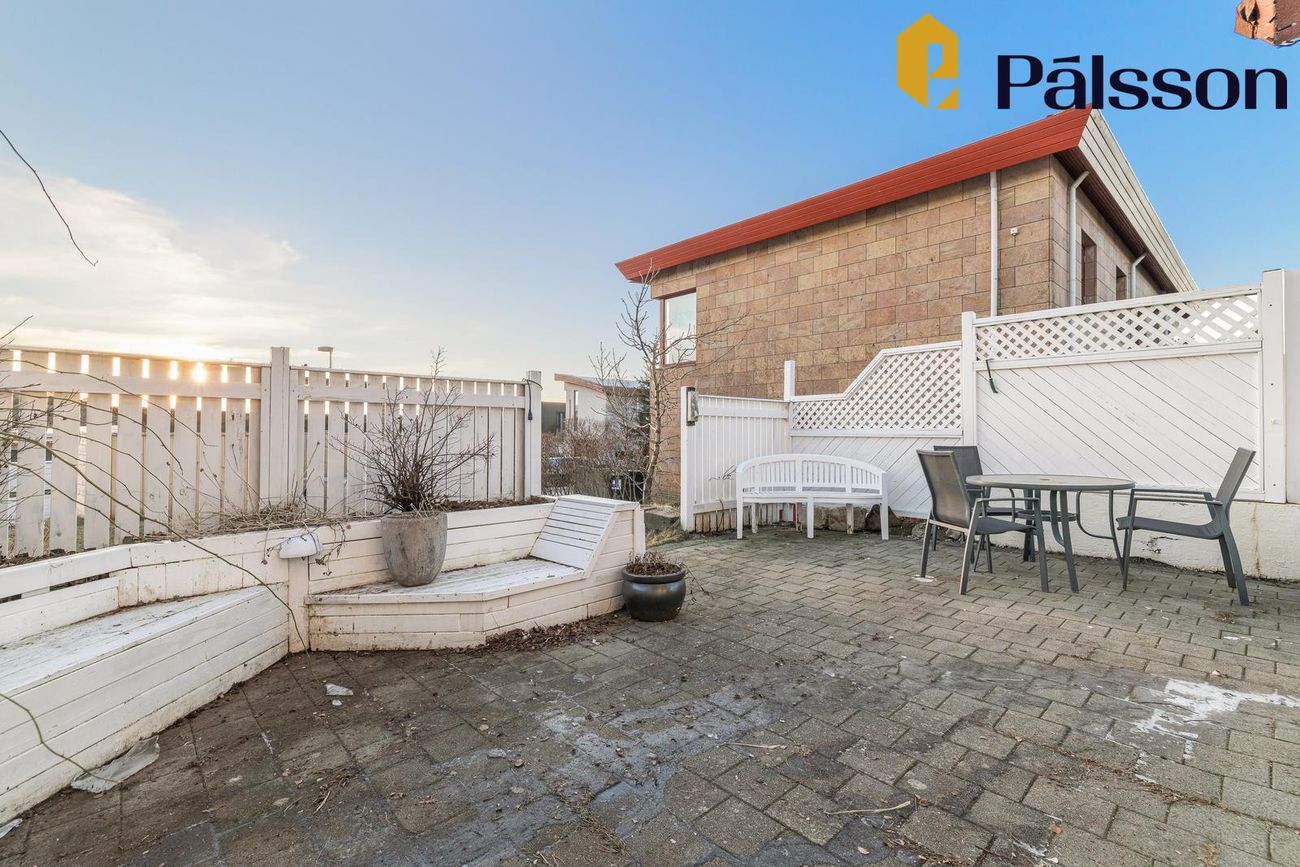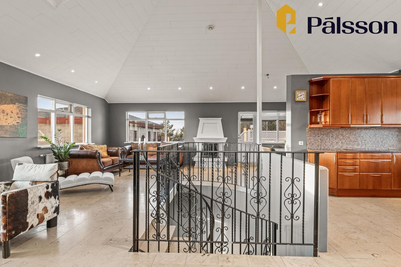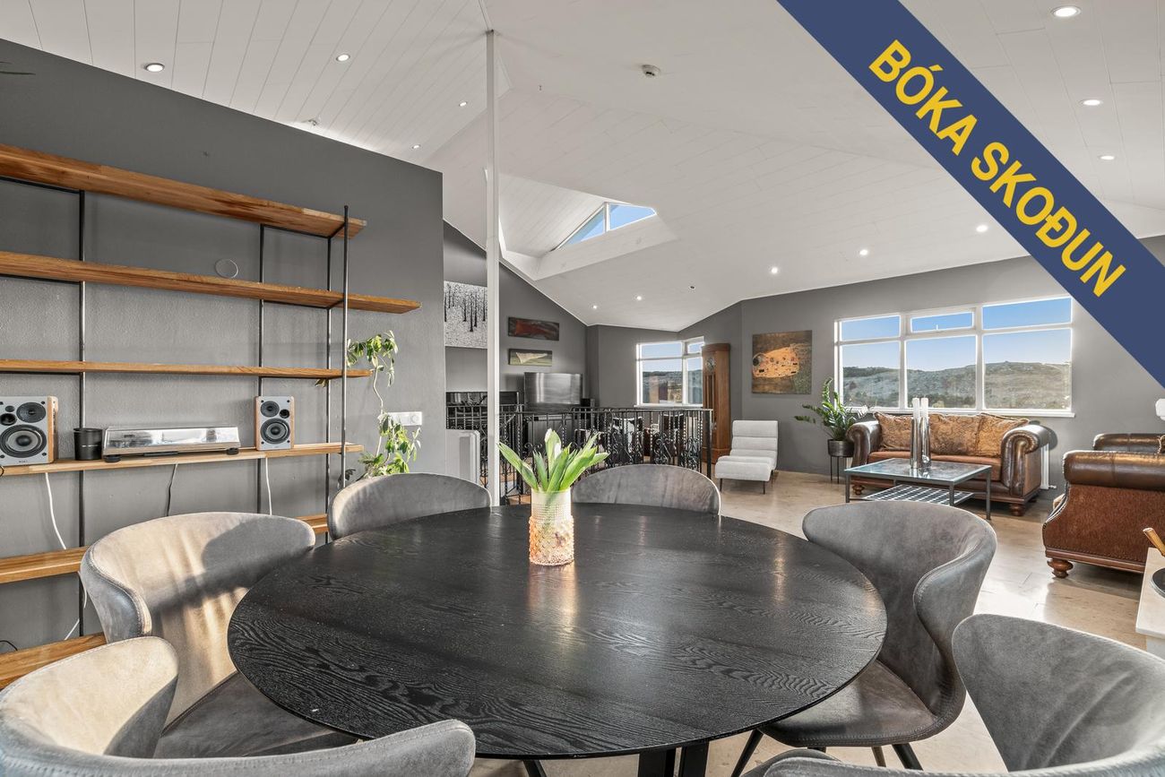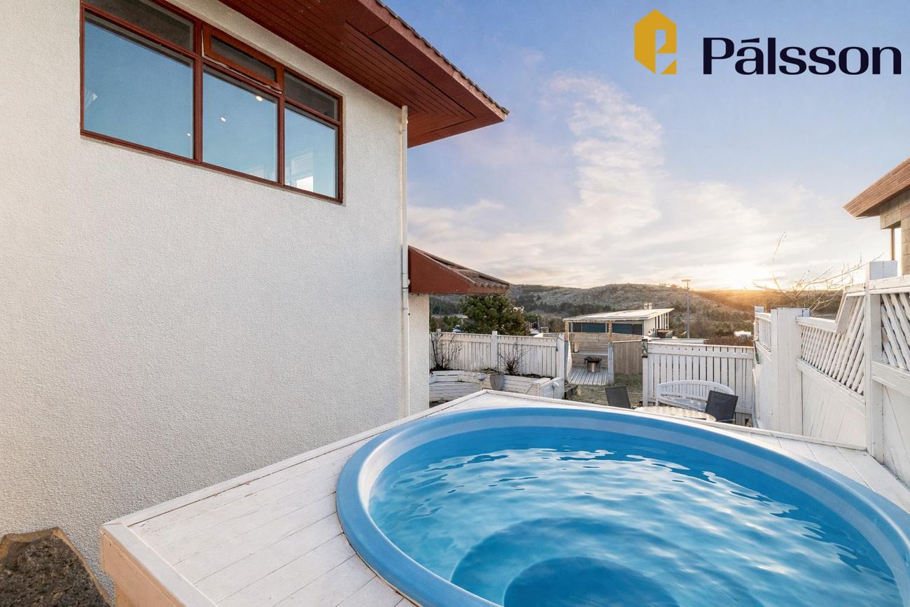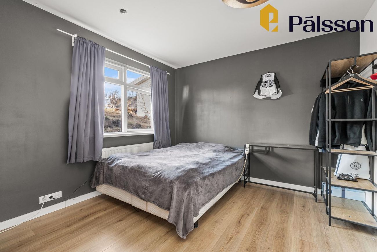 Tvíhæð hús með opnu rými á efri hæð, 4 svefnherbergjum, 2 baðherbergjum, þvottahúsi og stórum óskráðum rýmum sem hægt er að nota sem geymslu eða viðbót.
