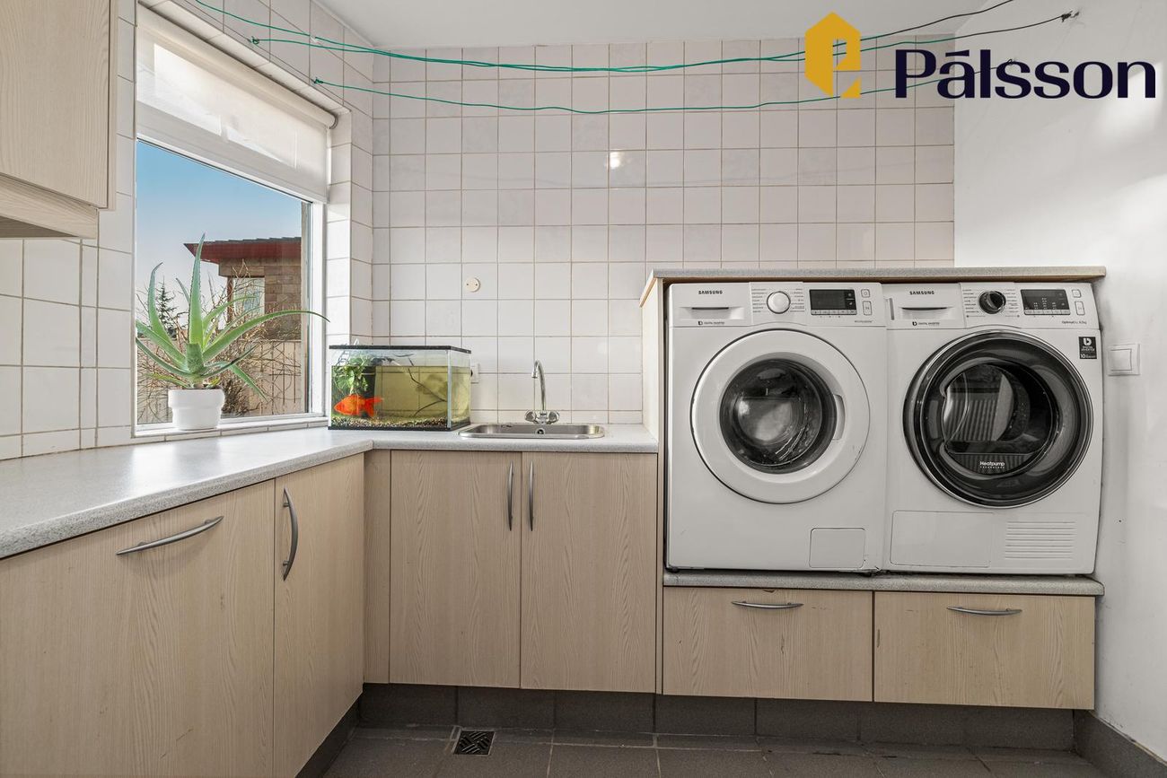 Þvottahús með vaski, borði og tengjum fyrir þvottavél/þurrkara. Flísalagt.