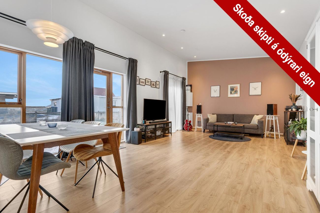 Stofa með parketgólfi, gólfsíðum gluggum og útgöngu í suðuráttuðan garð.