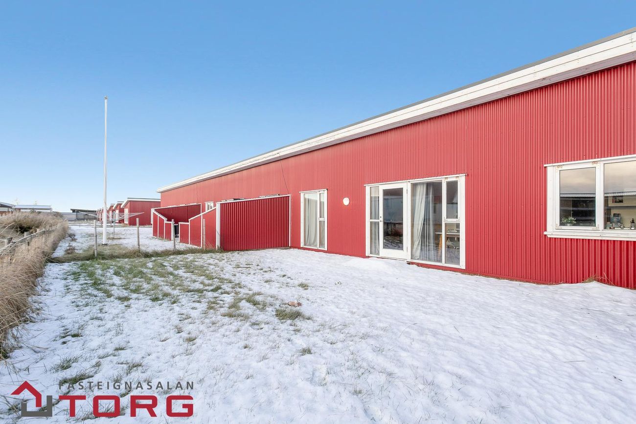 Raðhús í fjögurra eininga lengju með forstofu, anddyri og suðuráttuðum bakgarði. Skráð 102,8 m2 með 7,8 m2 geymslu.