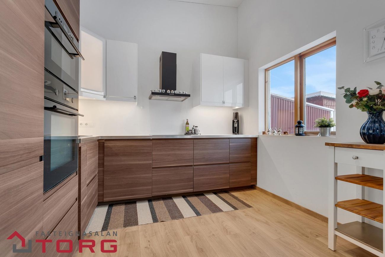102,8 m2 íbúð með 7,8 m2 geymslu. Opinn plan með stofu og borðstofu, eldhús með skápum og ofni, tvö svefnherbergi og baðherbergi með sturtu.