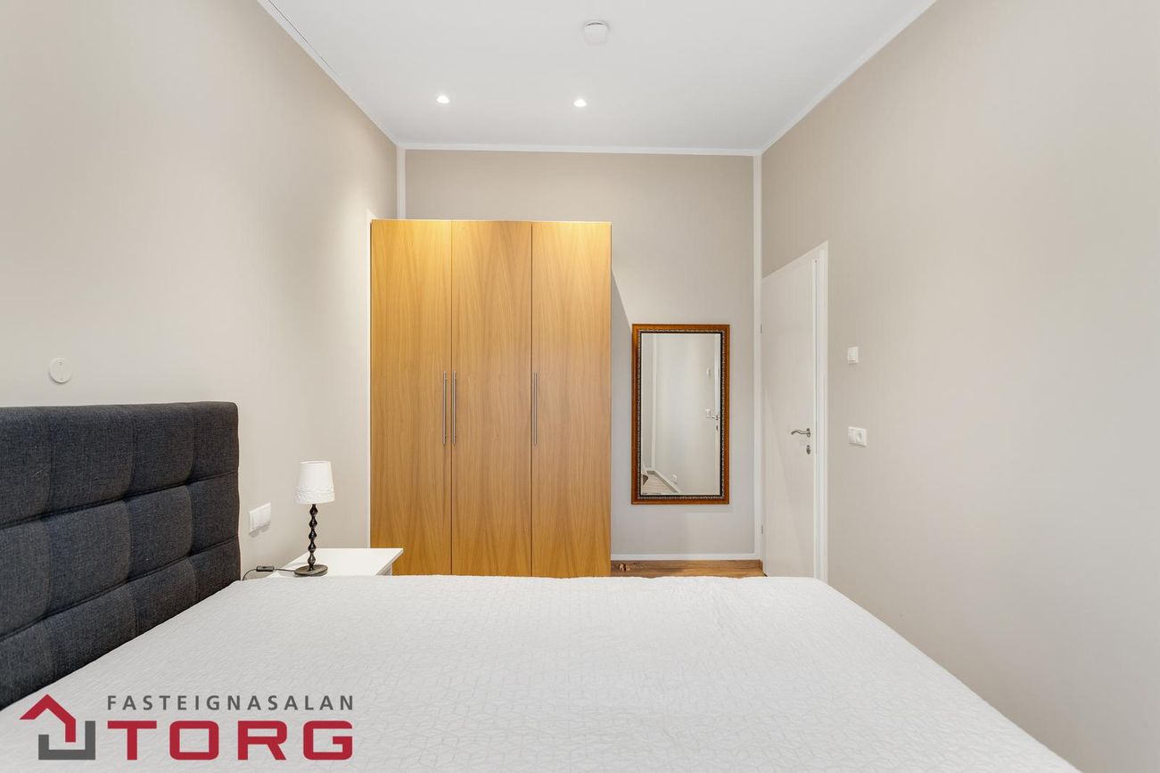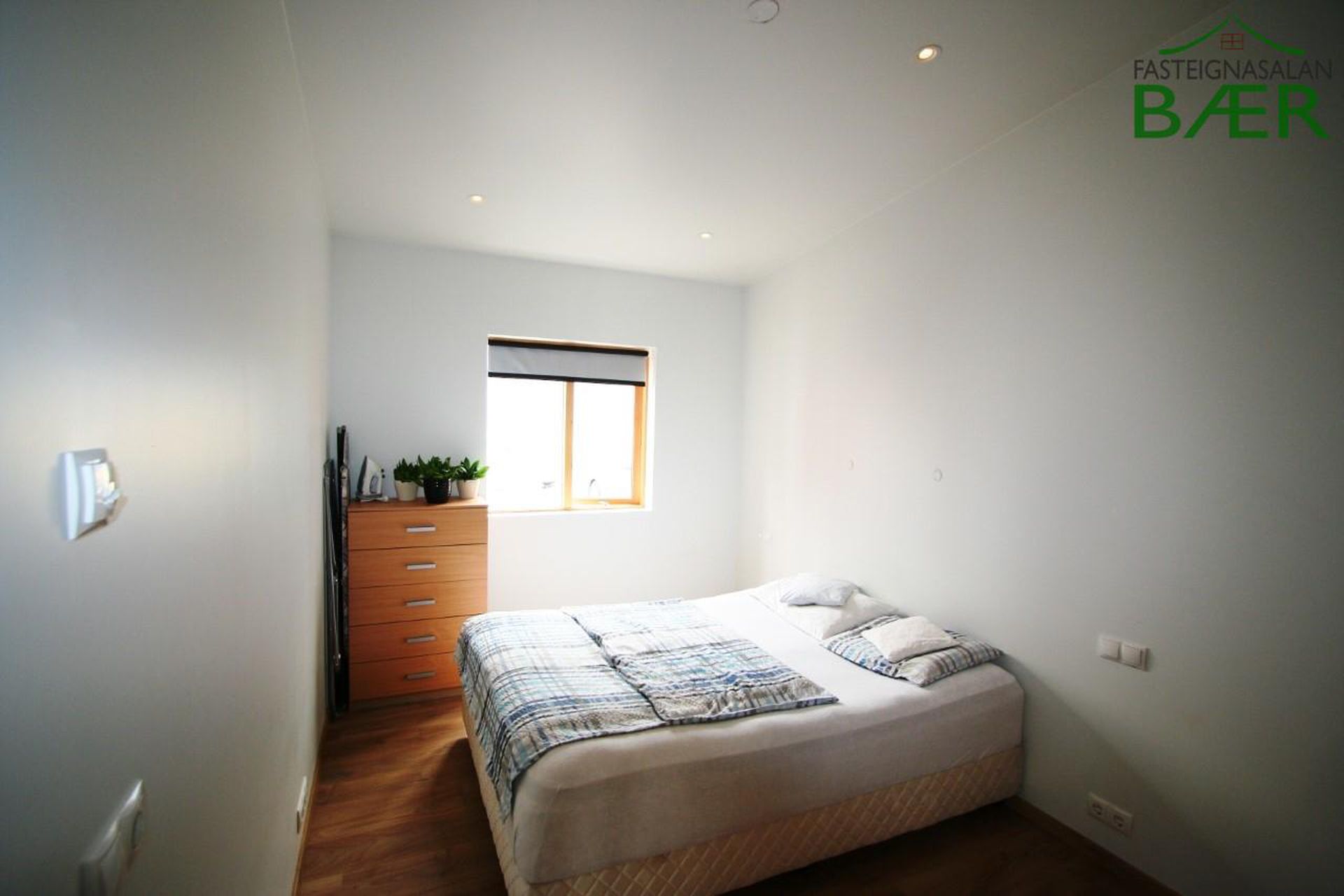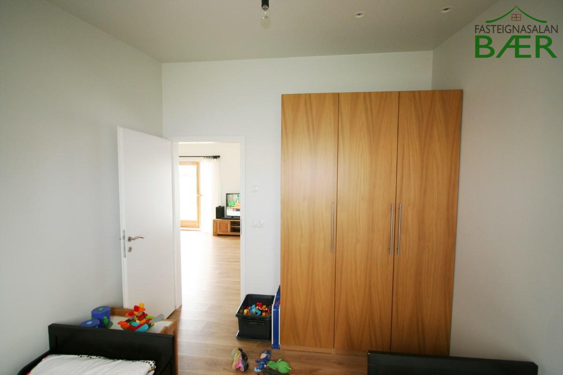 Herbergi I: parket á gólfi og fataskápur.