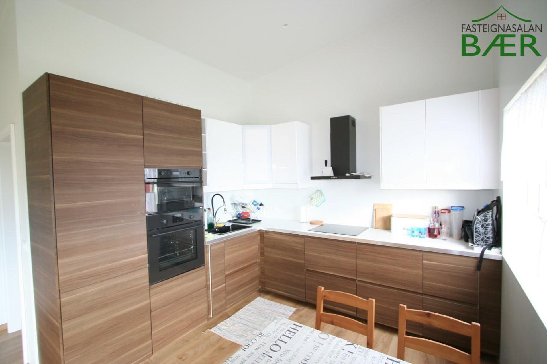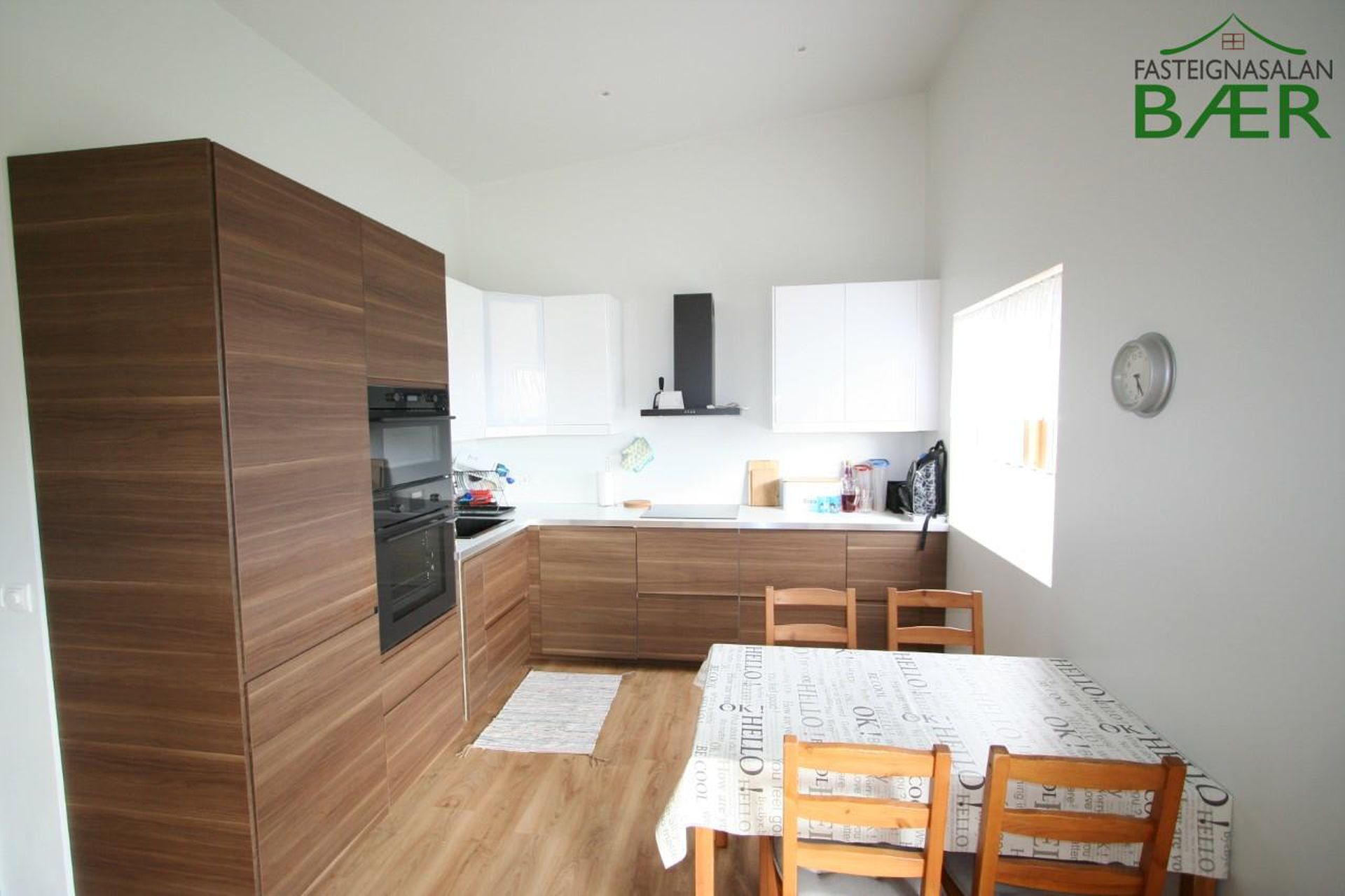 Eldhús: parket á gólfi, eldhúsinnrétting með góðu skápaplássi og ofn í vinnu hæð.