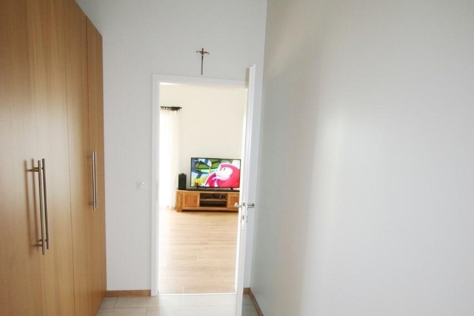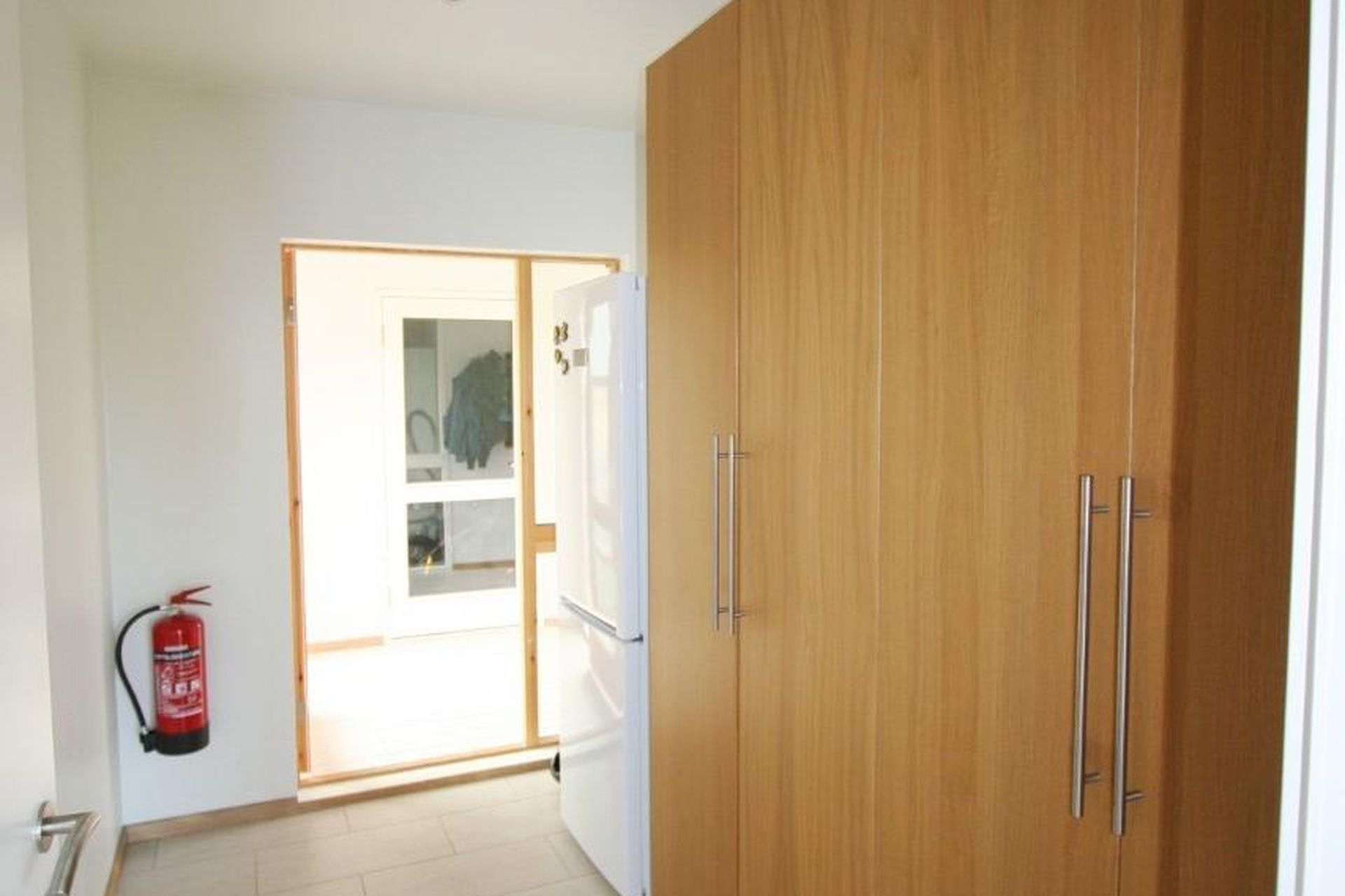 Anddyri: flísar á gólfi og fataskápur.
