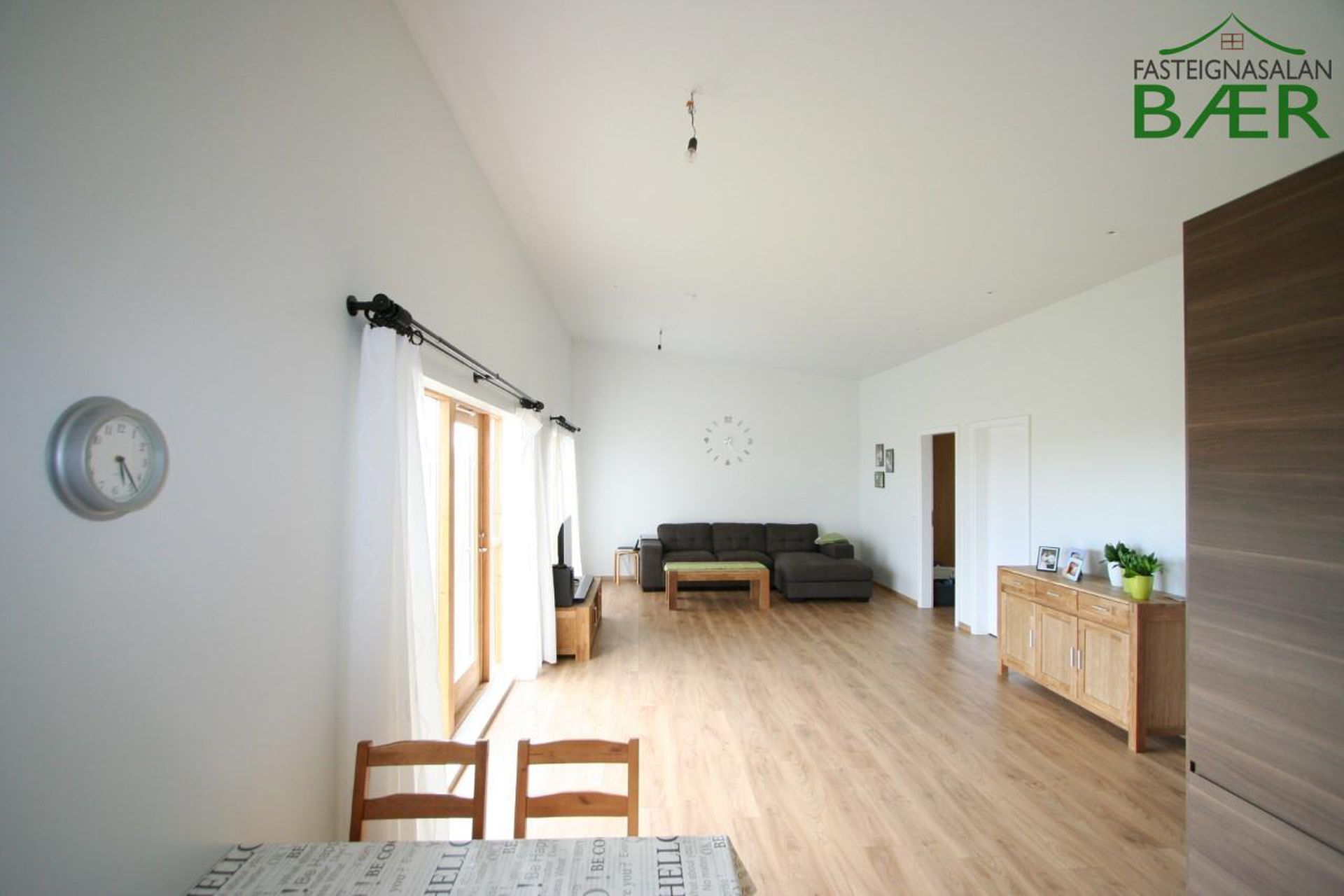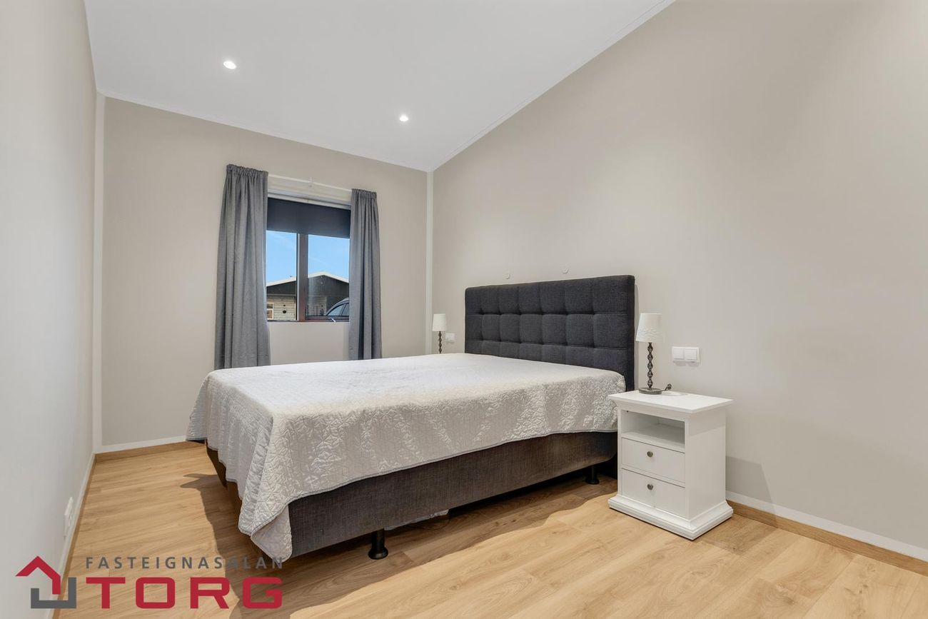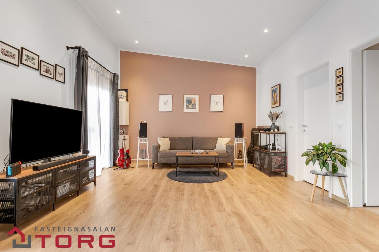 Alrými er bjart og opið með gólfsíðum gluggum í stofu, þaðan sem unnt er að ganga út í bakgarð eignarinnar sem snýr í suður.